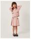 90s style for the new generation. Pretty and polished, this cable knit set includes a collared cardigan and swishy skirt, both showcasing a baby pink colour with black scallop trimmings. The best thing? The collar is embellished with glitzy bows for a sparkling finish. Pink