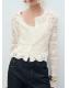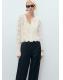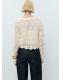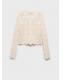 Tejido de punto grueso. Diseño crochet. Diseño recto. Cuello caja. Manga larga. Bajo festoneado. Cierre de botones en la parte delantera