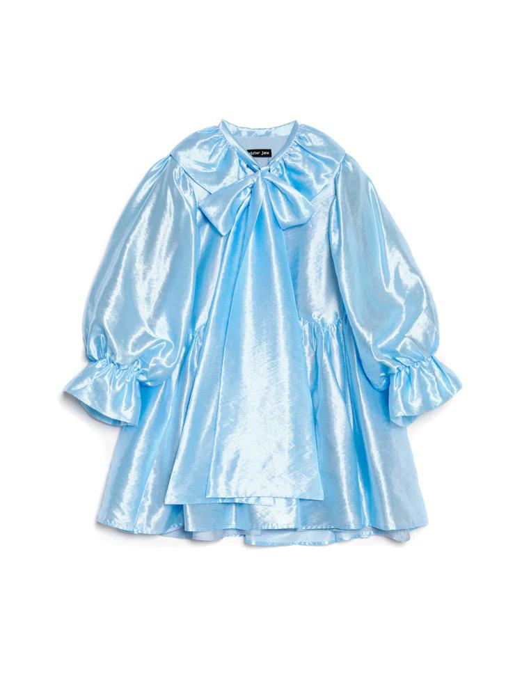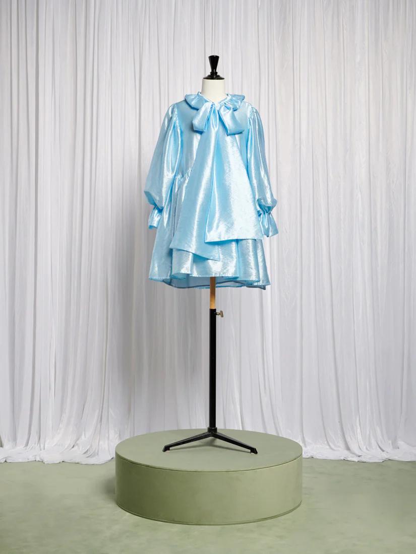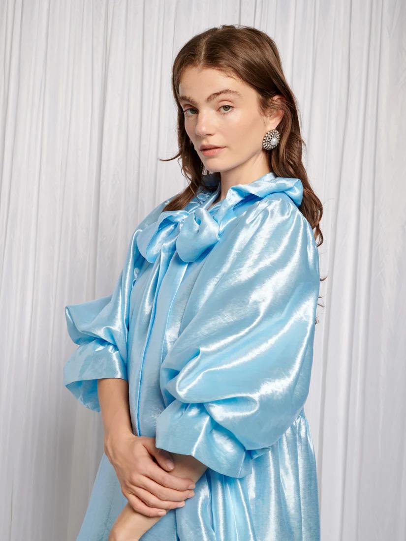 Blue-skied boldness – A satin mini in a sweeping shade of meadow-sage blue. Tied neatly at the neck for a school-uniform nod, but oversized enough to feel utterly modern. Exclusively available on Sister Jane.