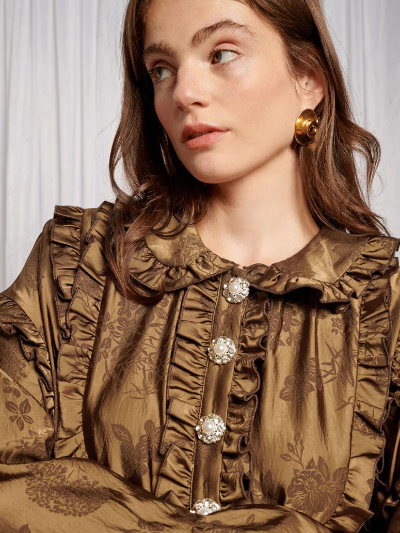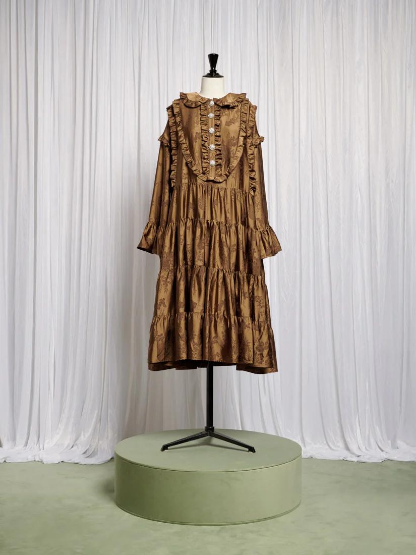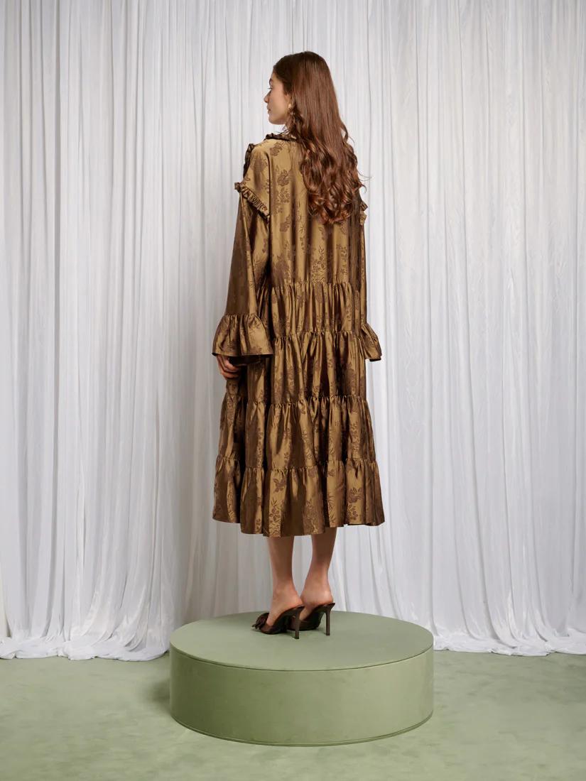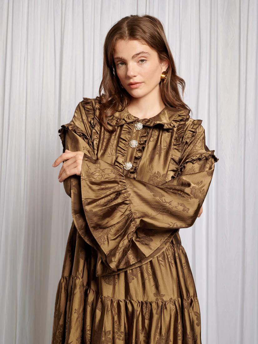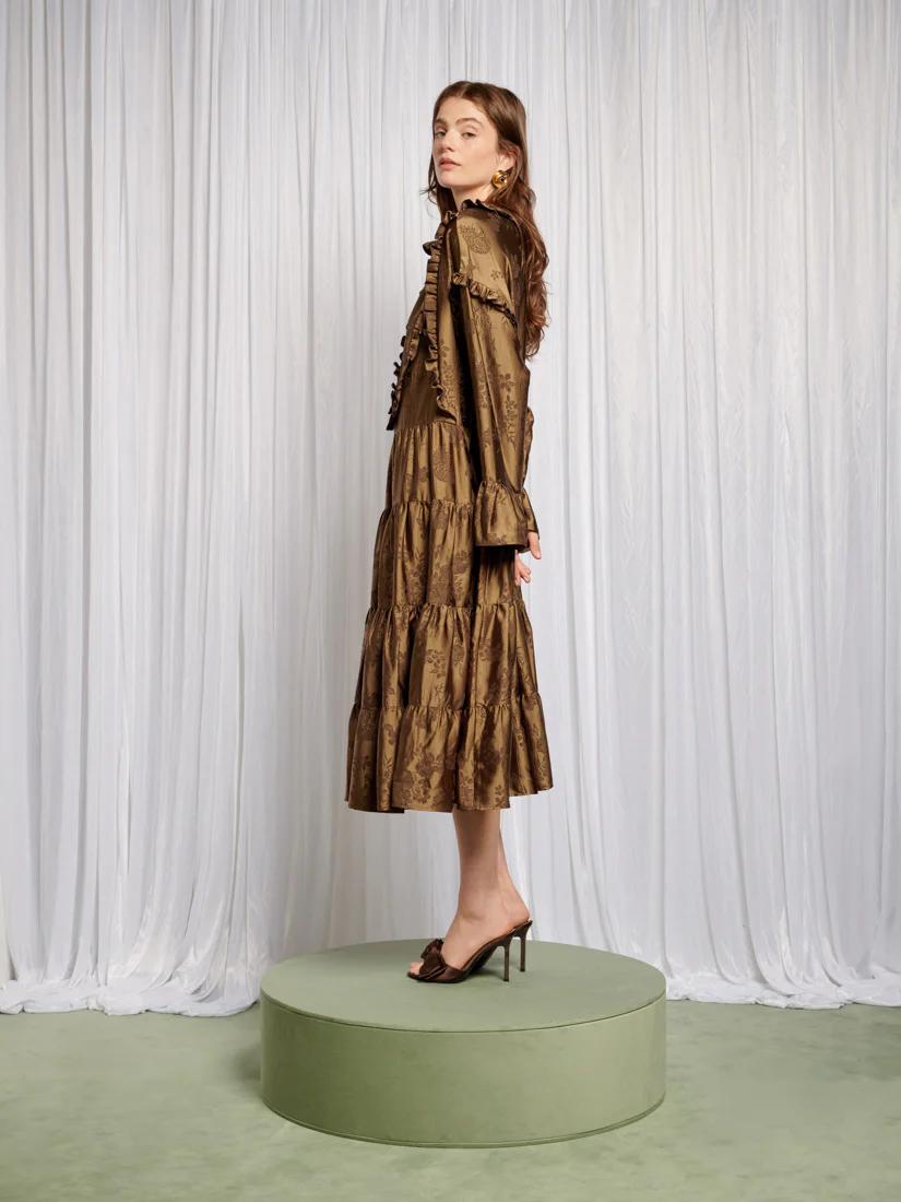 Library to lantern-lit dinners. Floaty sleeves and a soft shimmer, the Helen Bib Jacquard Midi Dress are made for days that start studious and end in celebration. Exclusively available on Sister Jane.