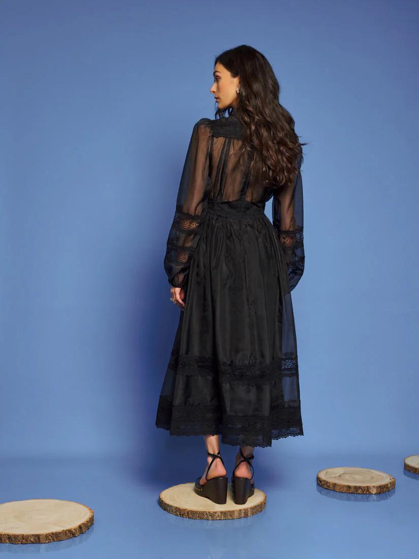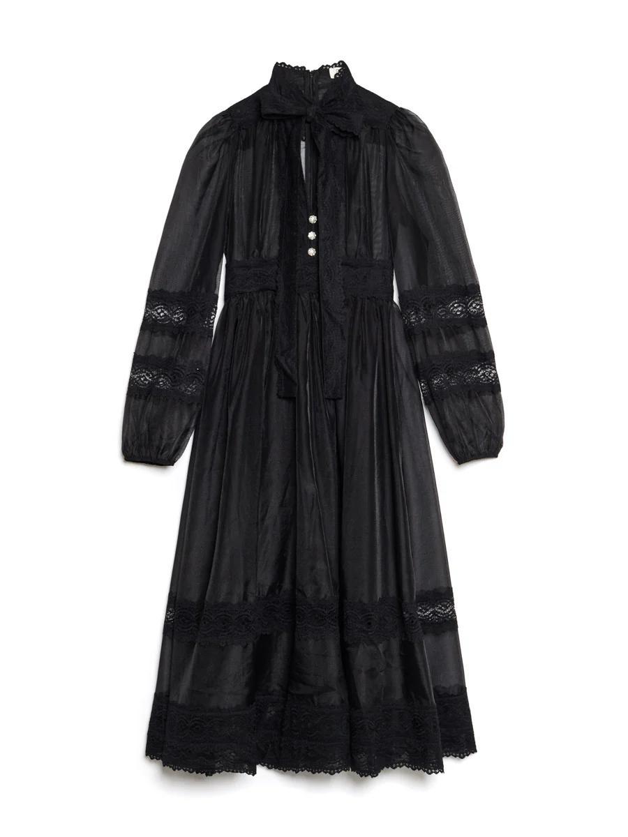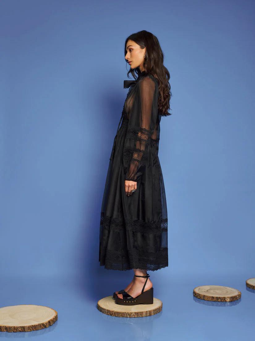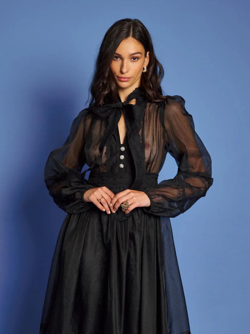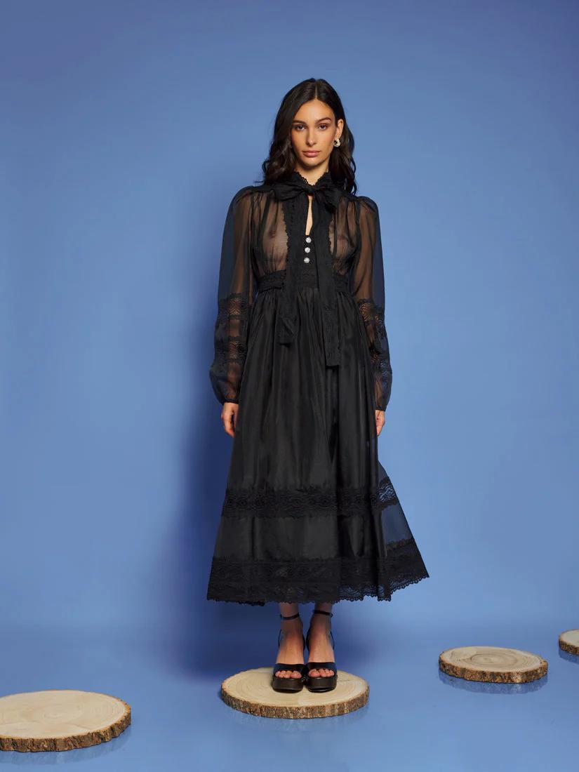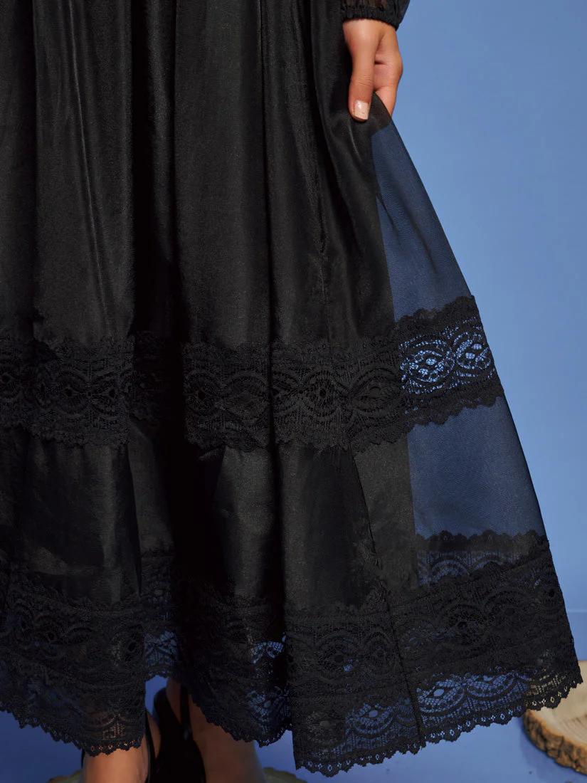 Like a gentle breeze carrying lace and gemstone flowers, the Breezy Bow Midi Dress flows with lined skirts and delicate lace panels. The matching lace necktie floats like a whispered promise.