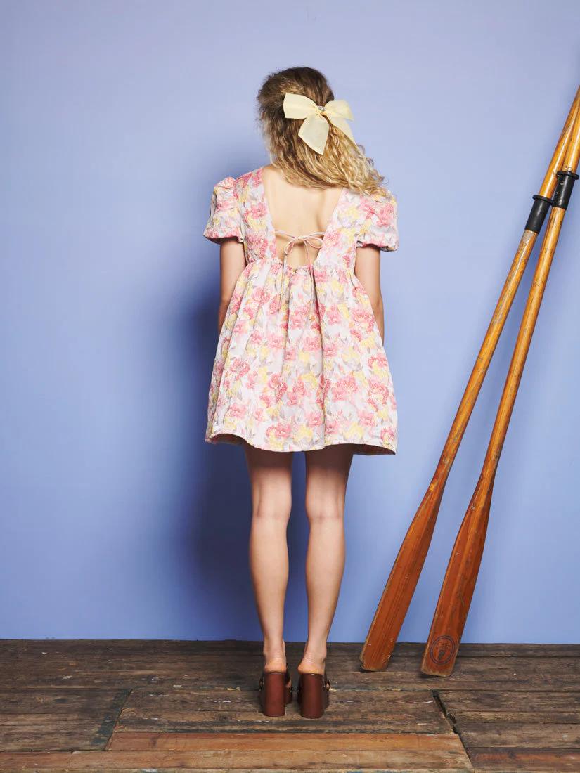 A whisper of a dress. Soft jacquard, open back, and ties that flutter like a secret waiting to be heard. The Echo Jacquard Mini Dress is perfect for wandering barefoot through the grass on a summer's day.