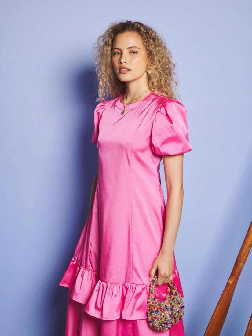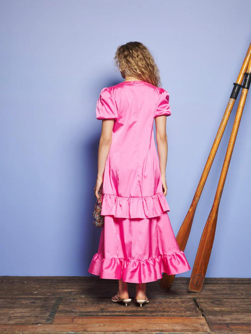 Sunbeams stitched into fabric-this taffeta maxi flows with a cascade of ruffles. Wear it where the trees open to the sky and every shadow tells a story. The Perfect companion? You can never go wrong with the charming Tansy Beaded Bag.