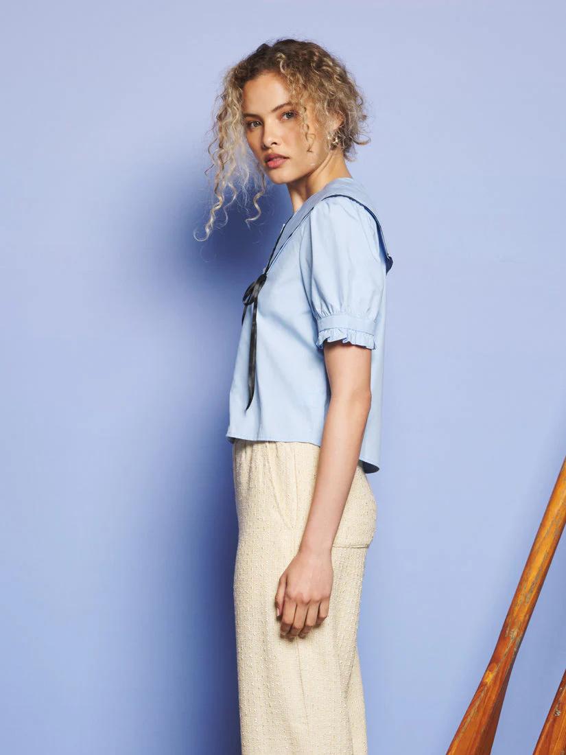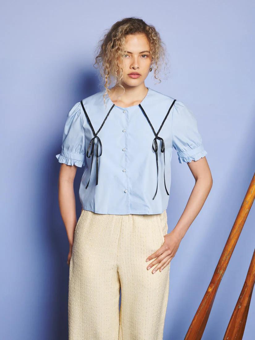 A sailor’s collar trimmed in satin and bows-The Glassy Bowed Collar Blouse sings of boat rides and braids undone by the breeze. Pearlescent buttons complete the charm.