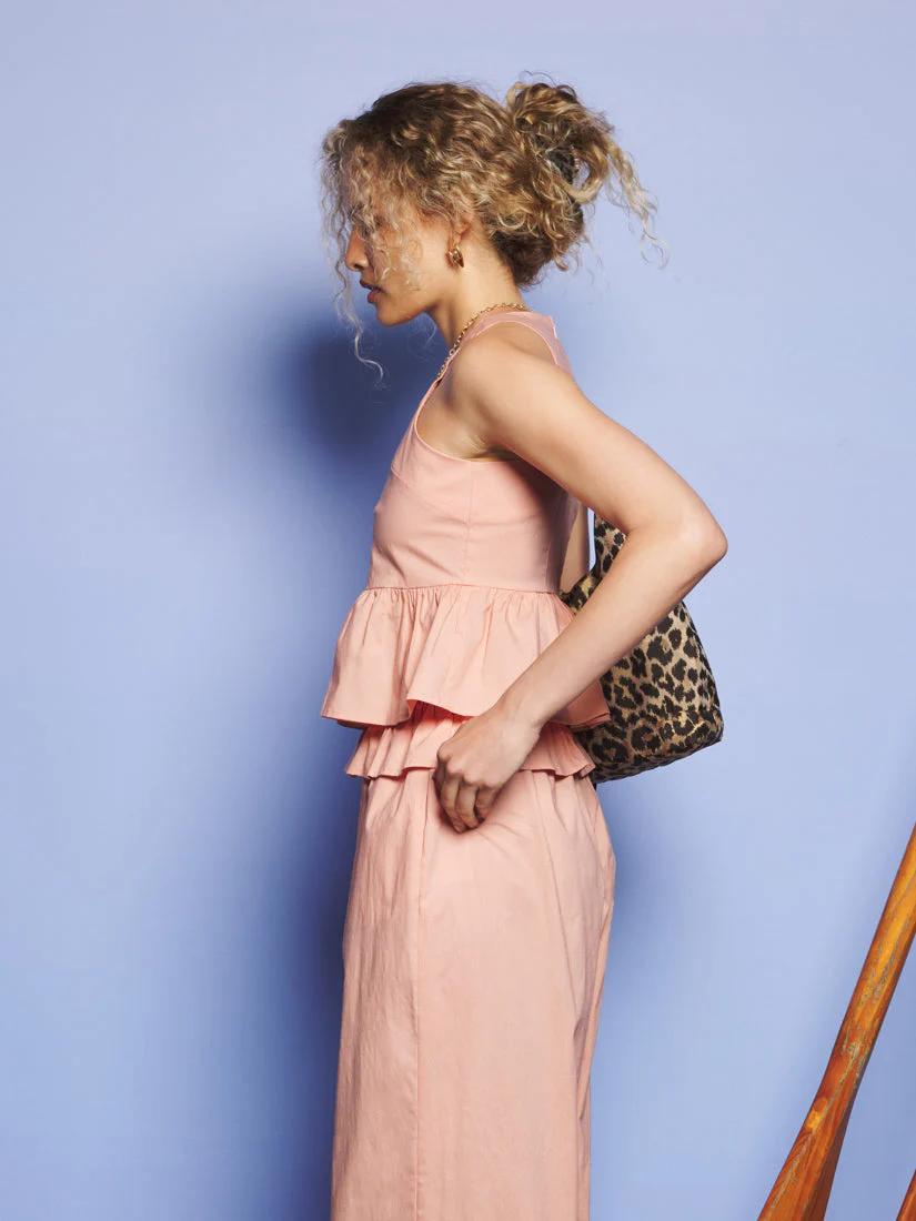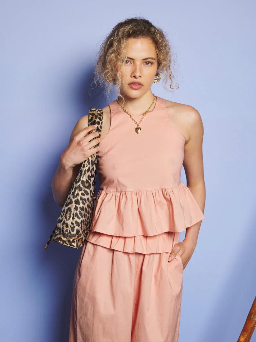 Made for golden hour moments. This racer-neck crop clings gently at the waist, like the hush just before dawn. A perfect pairing to the Sunrise Ruffle Waist Trousers for those dream-drenched mornings on the veranda.