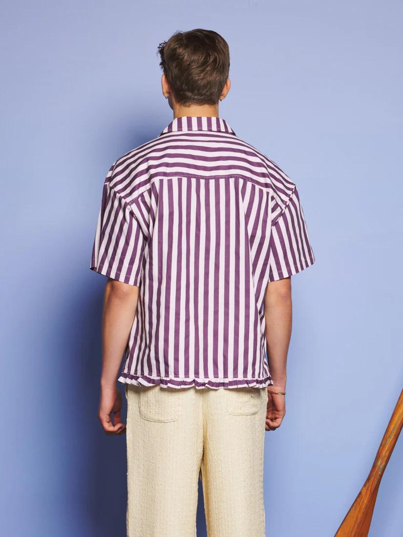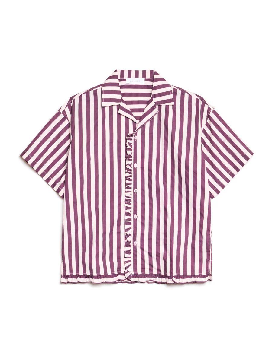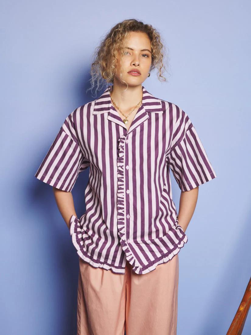 Salt-kissed and soft to the touch-this boxy stripe shirt brings the charm of lakeside picnics to your wardrobe. Finished with ruffles and matching buttons, it’s ready to be worn barefoot on the deck.