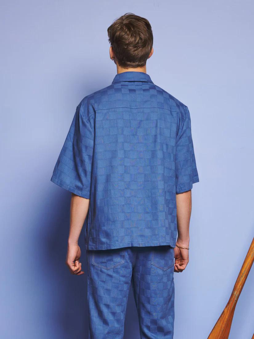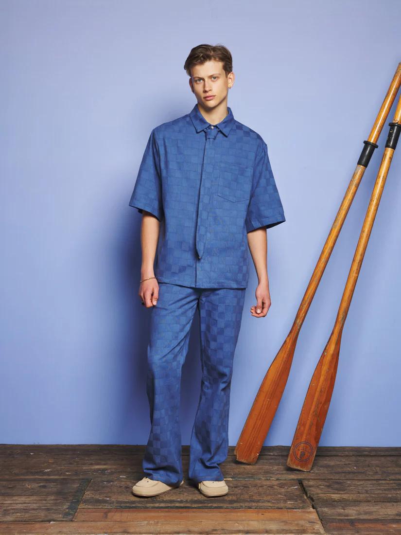 Woven like the cabin walls themselves-this check-embossed denim shirt feels familiar and fresh. Flat gold buttons and a removable necktie complete the lakeside explorer’s uniform. Perfectly paired with Cabin Embossed Jeans and barefoot dreams.