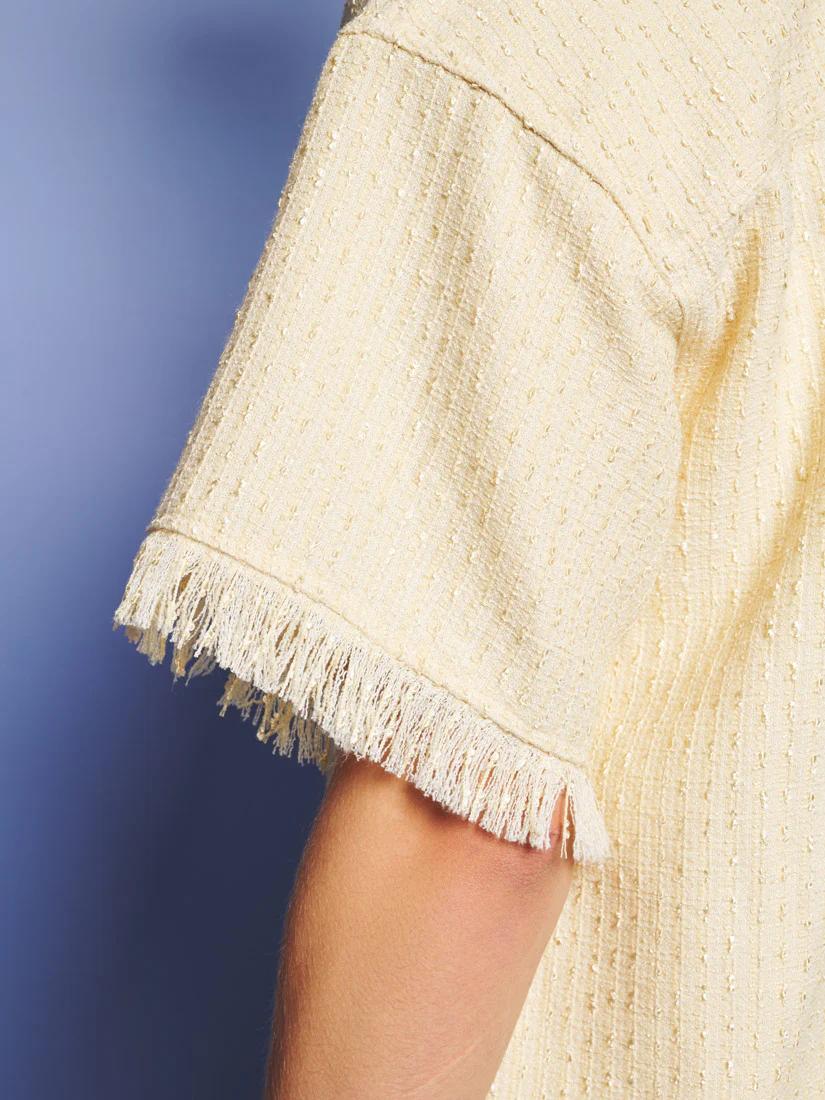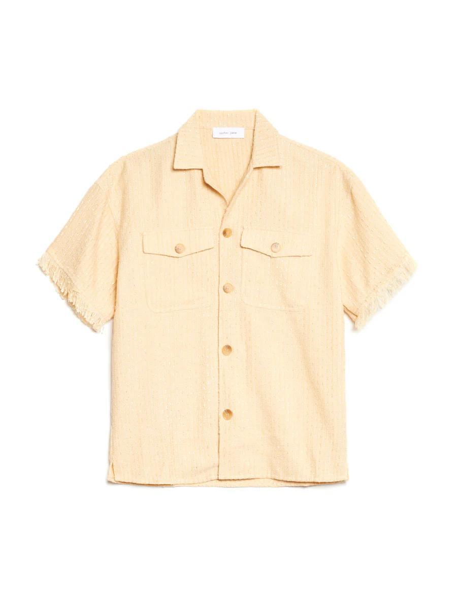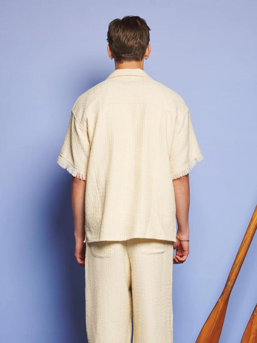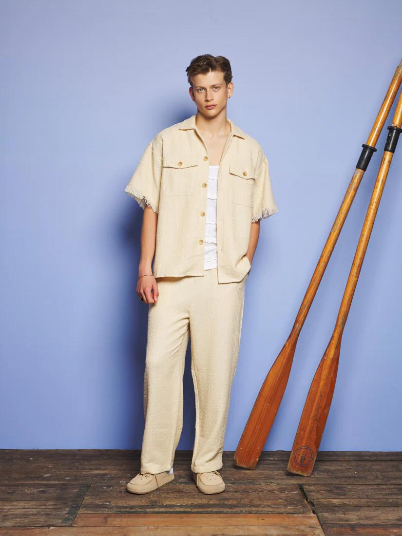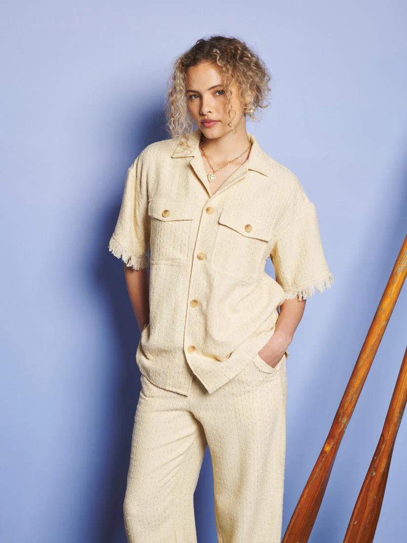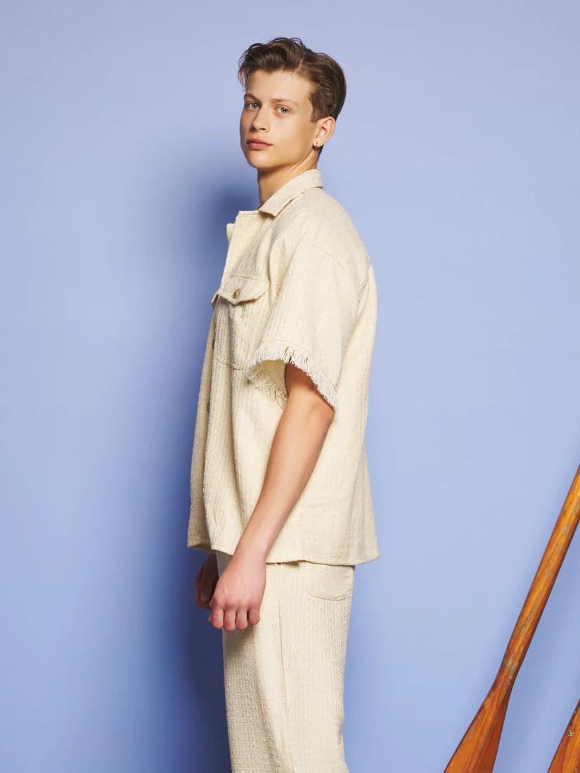 Tweed reimagined for mountain picnics and pine needle naps. This boxy shirt is finished with patch pockets and frayed trims, like the edge of a worn-in map. A suit set has never looked more chic, pair with the Mountain Tweed Joggers.