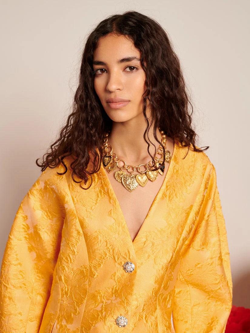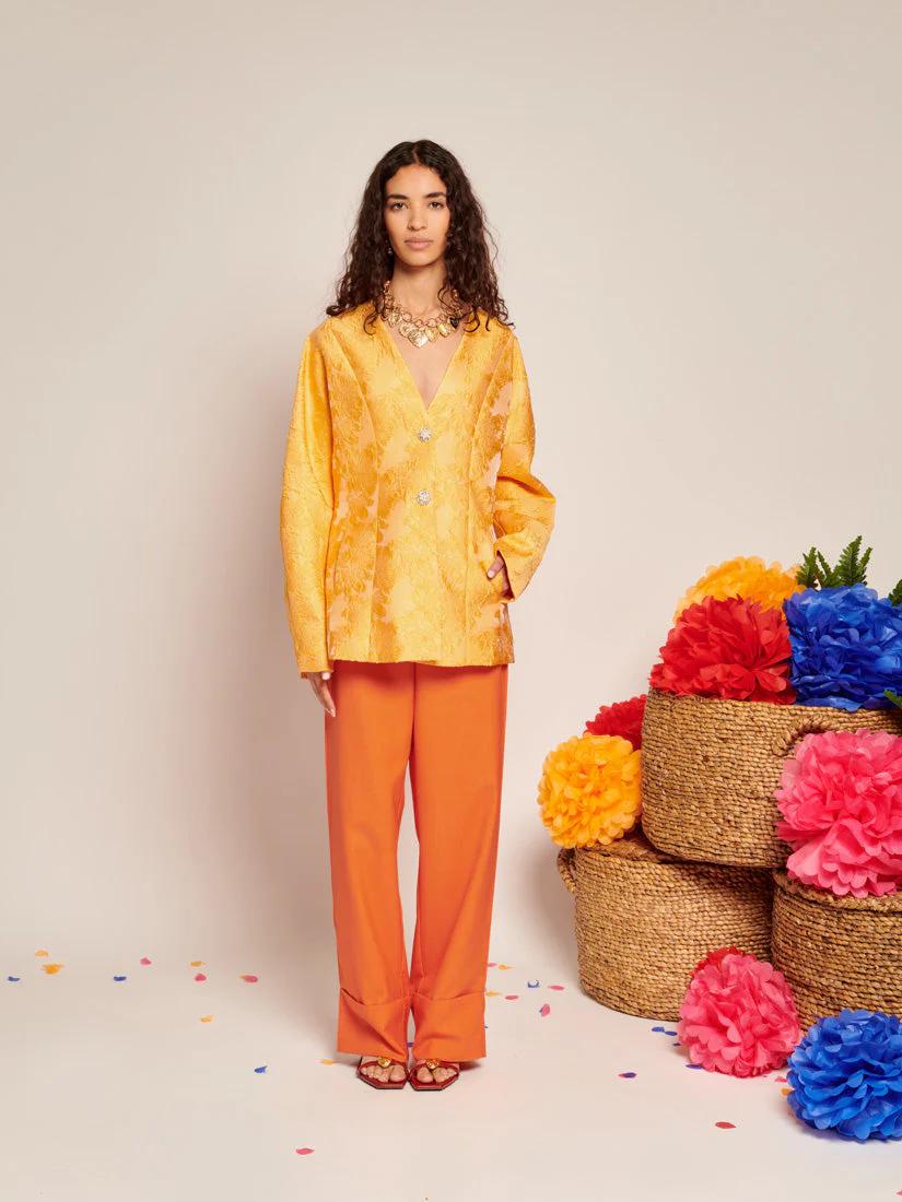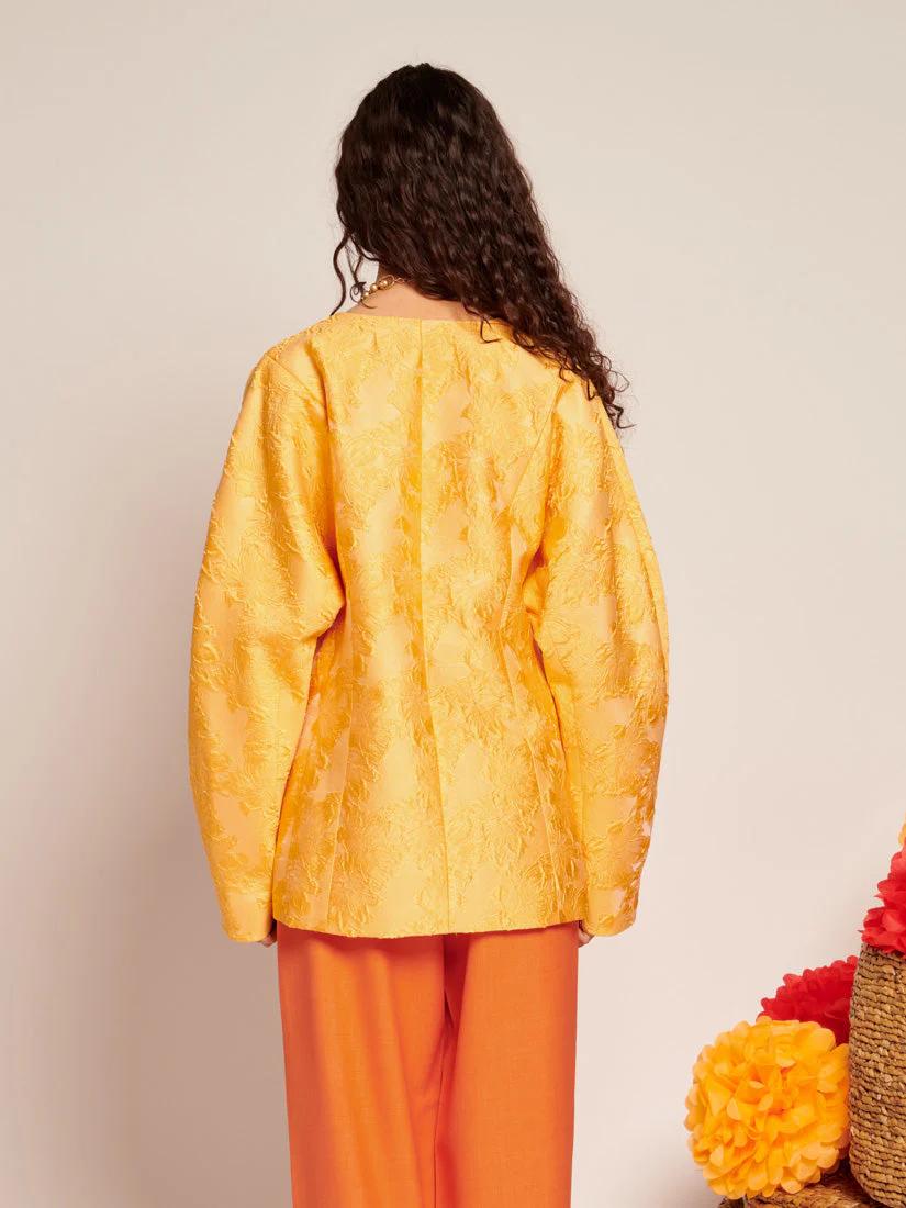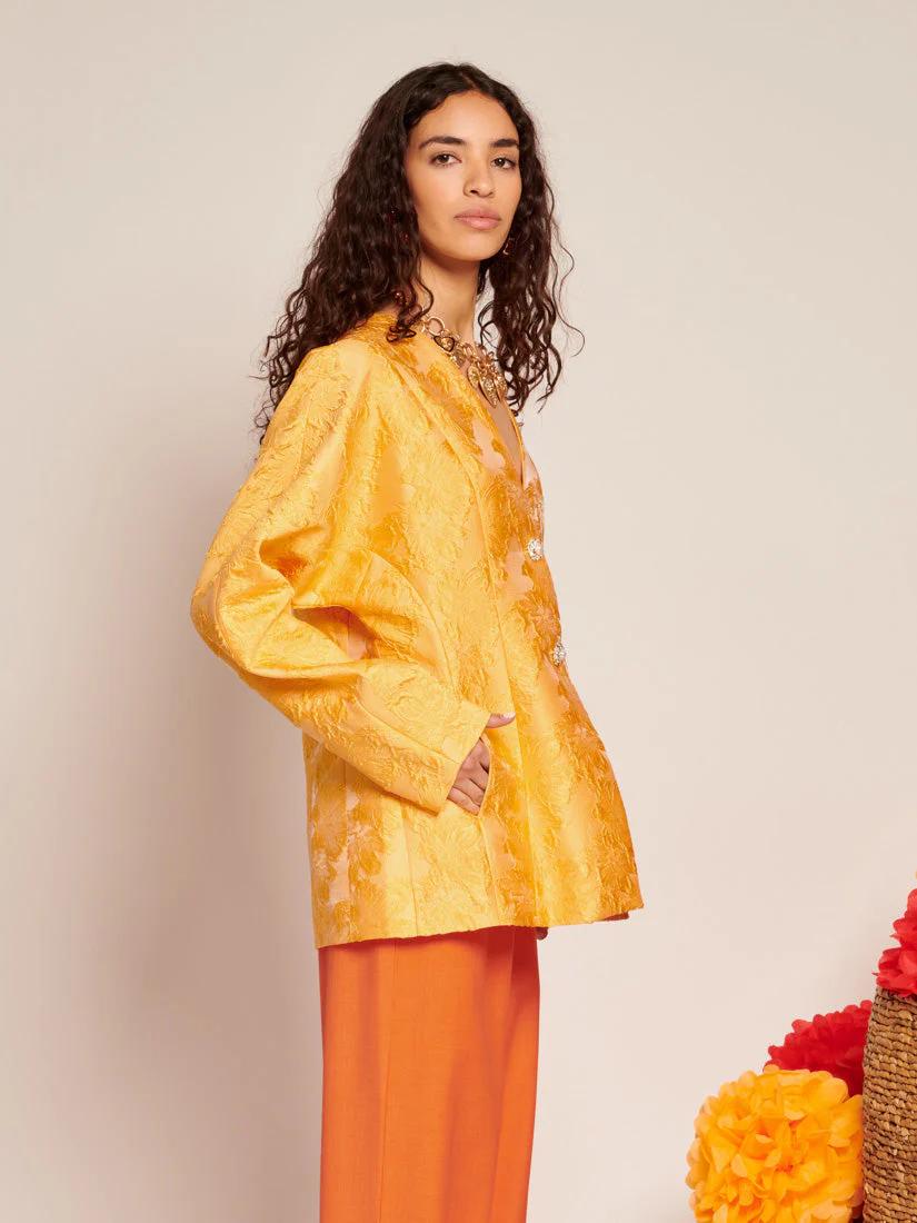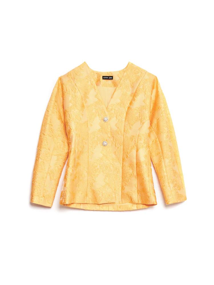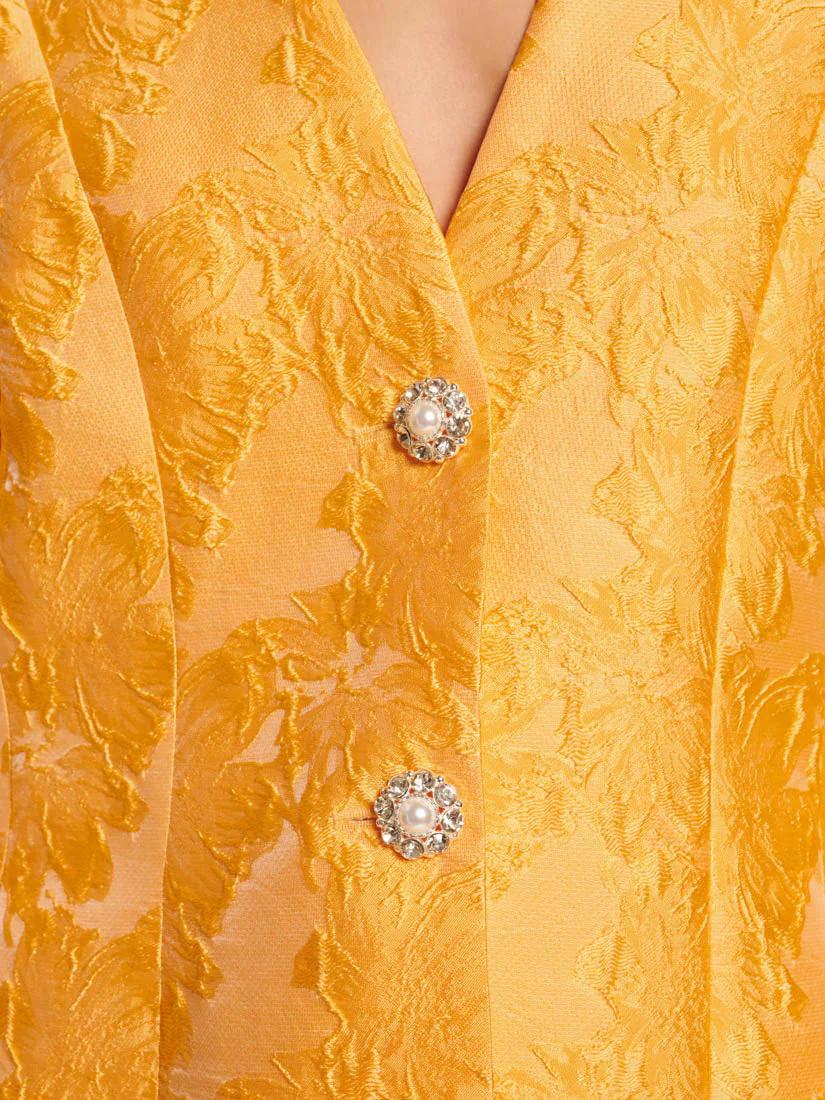 This fitted blazer is crafted from structured floral jacquard that catches the light like the first rays of morning. Fully lined for a flawless fit and detailed with front seam pockets, it’s finished with gemstone buttons featuring pearlescent centers-tiny sunbursts of their own. Whether layered over a dress or paired