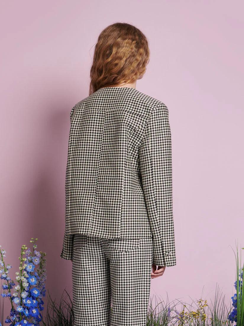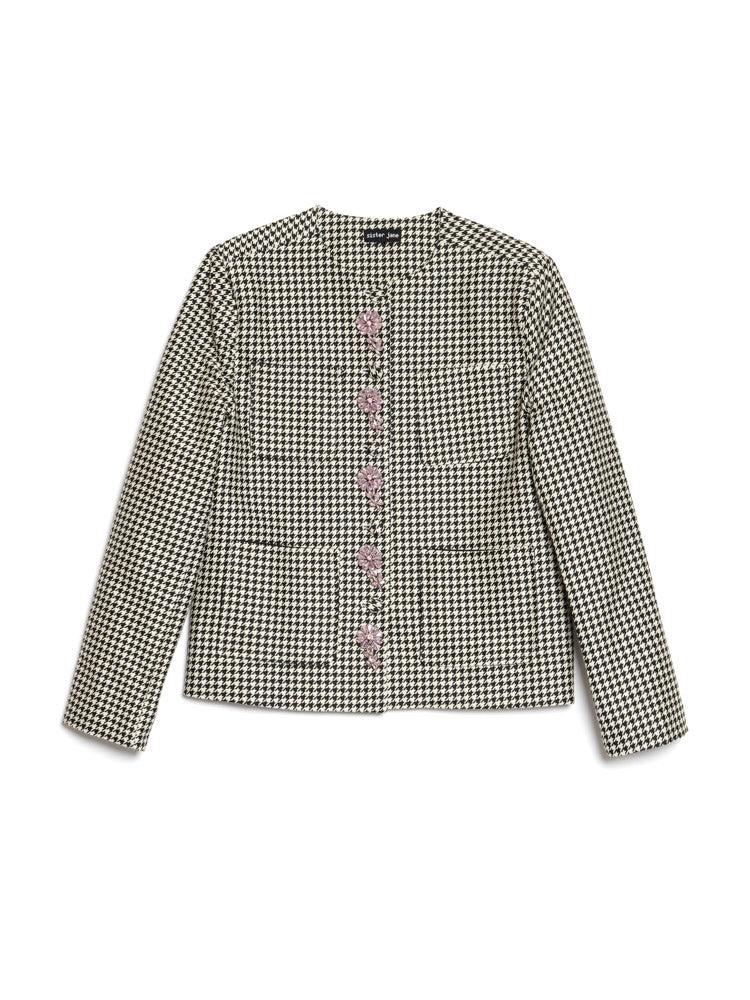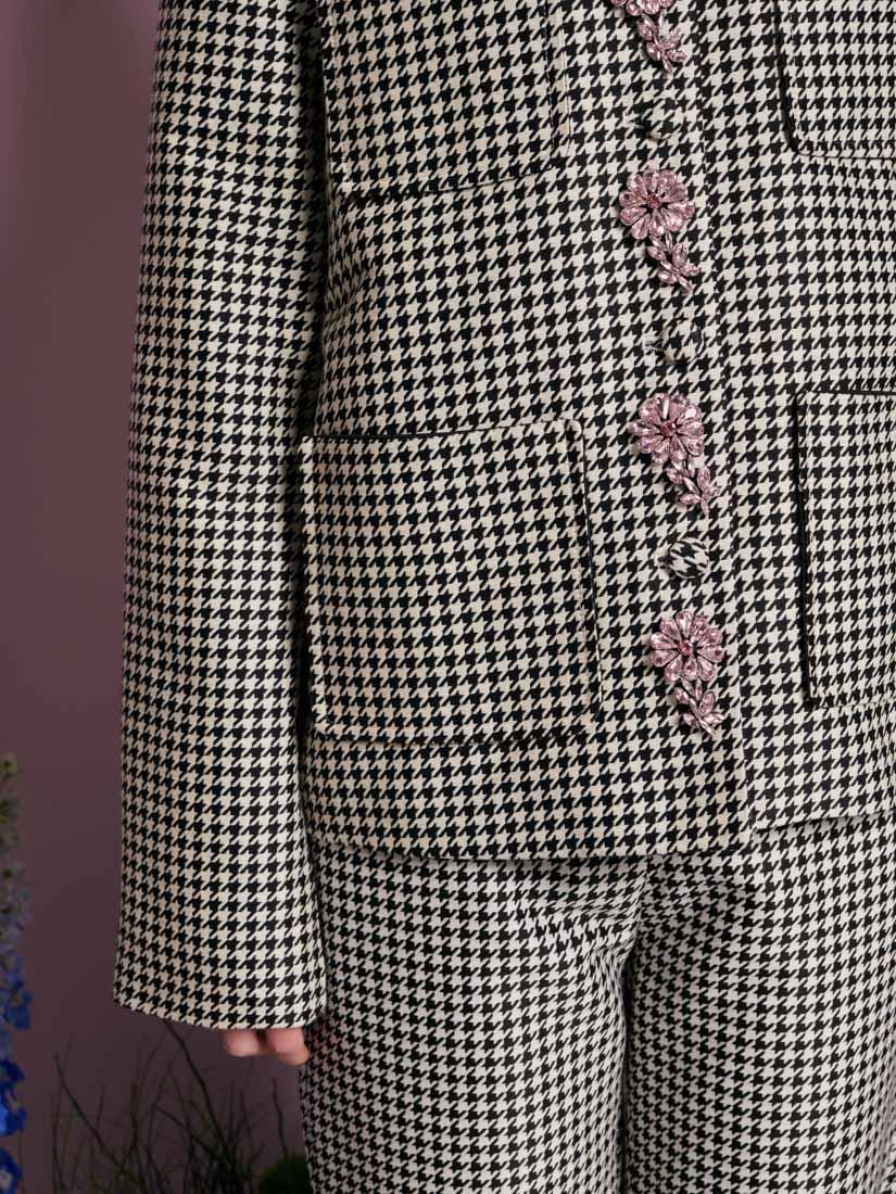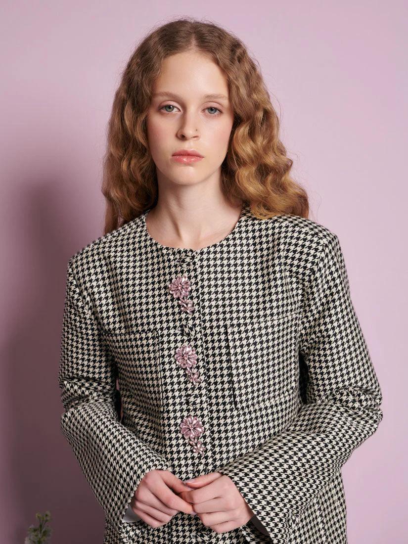 Bring some fun to your wardrobe with the Petal Houndstooth Jacket! The perfect blend of classic houndstooth and playful floral gems, it’s a chic addition that’s ready to elevate any outfit. Whether you're dressing up for afternoon tea or adding a little sparkle to a casual look, this jacket is all about charm and cheer