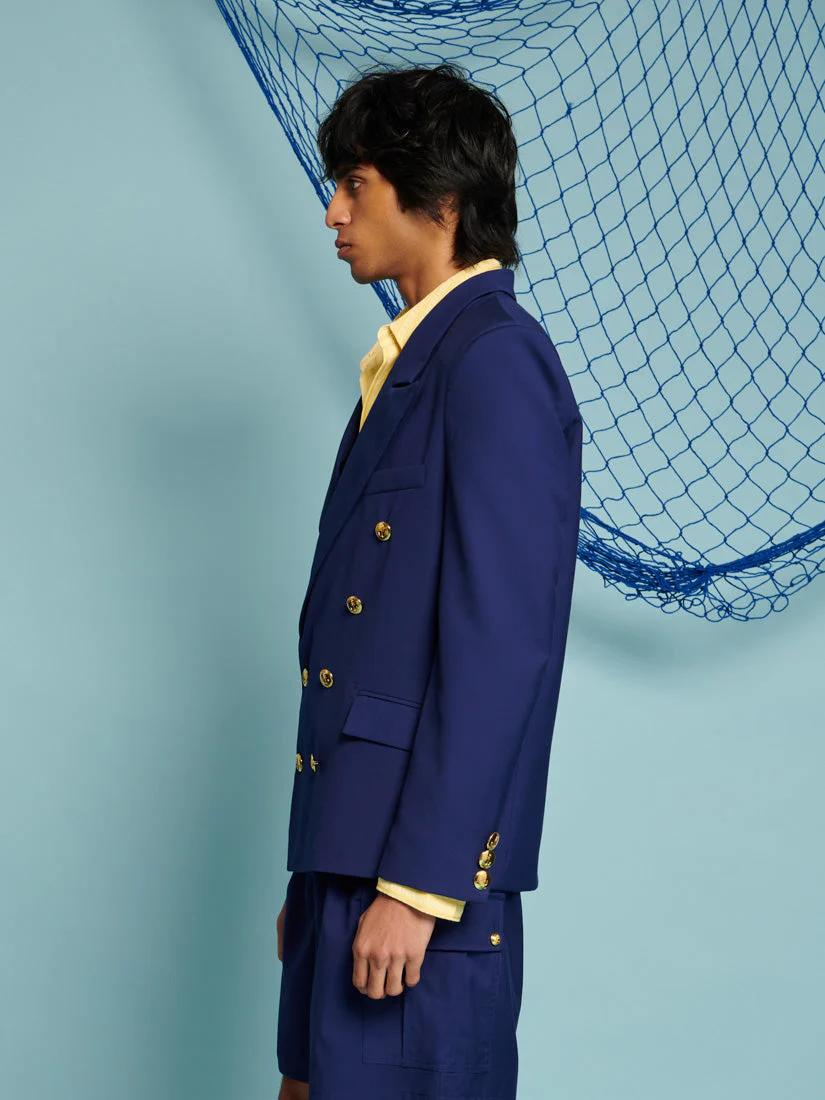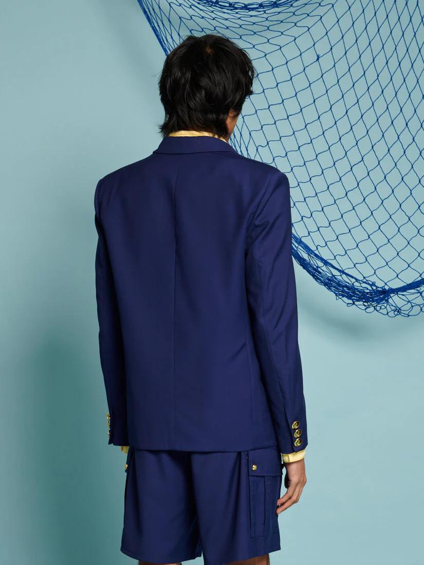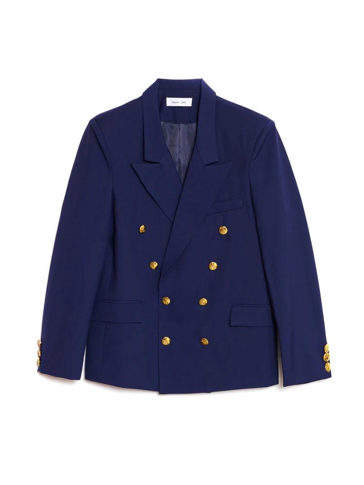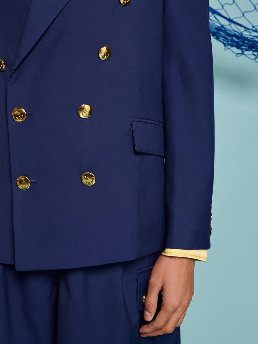 Make waves in the Marlin Double Breasted Blazer—a sharp, structured classic with a nautical edge. Crafted in deep navy with a boxy fit, this power piece is defined by strong shoulders, sleek welt pockets, and striking gold anchor buttons. Whether dressed up or styled down, it’s tailored to turn heads. Match your moment