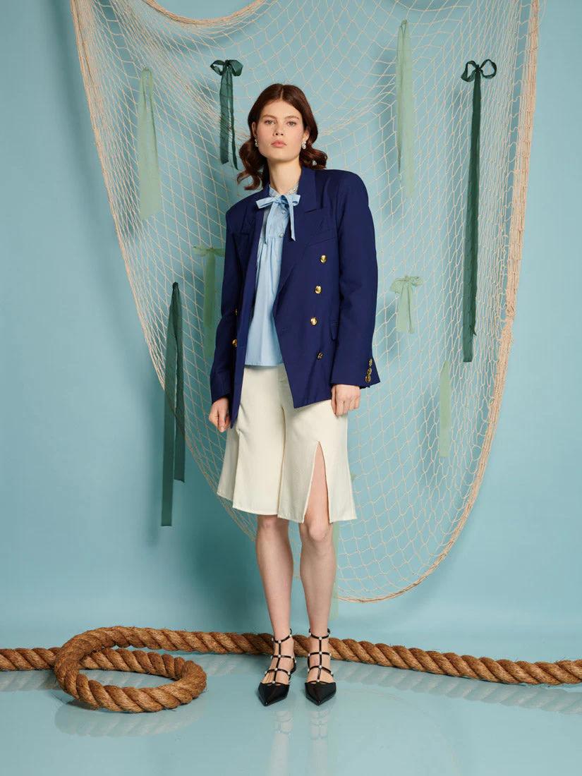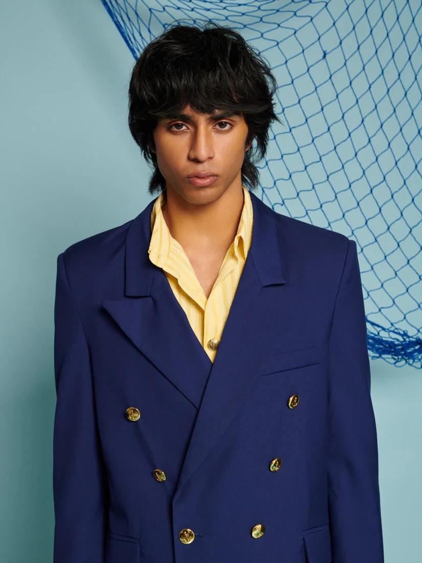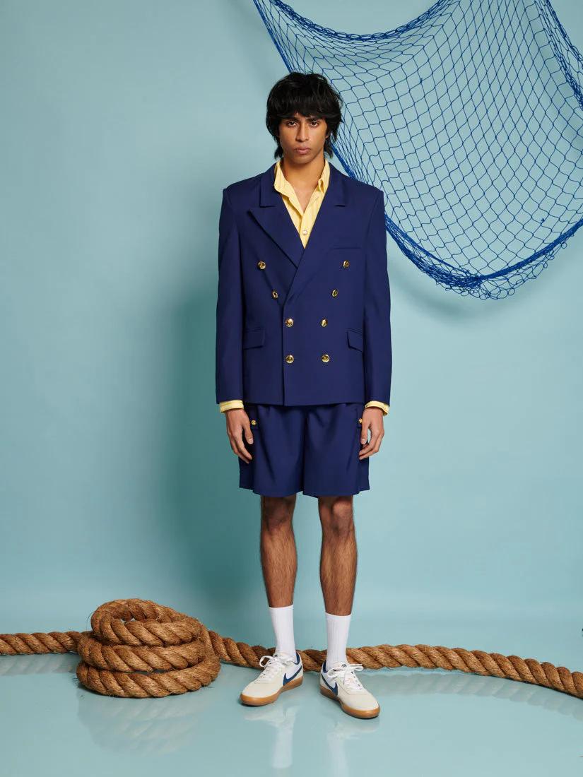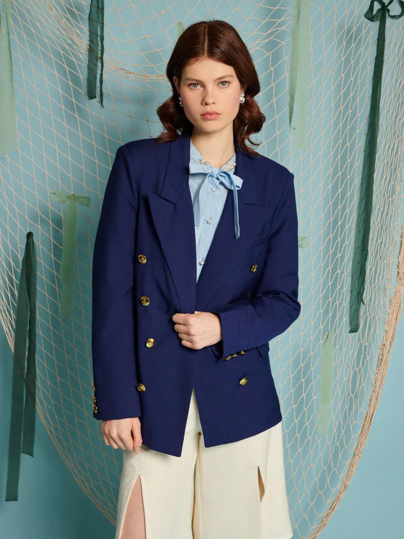 Make waves in the Marlin Double Breasted Blazer—a sharp, structured classic with a nautical edge. Crafted in deep navy with a boxy fit, this power piece is defined by strong shoulders, sleek welt pockets, and striking gold anchor buttons. Whether dressed up or styled down, it’s tailored to turn heads. Match your moment