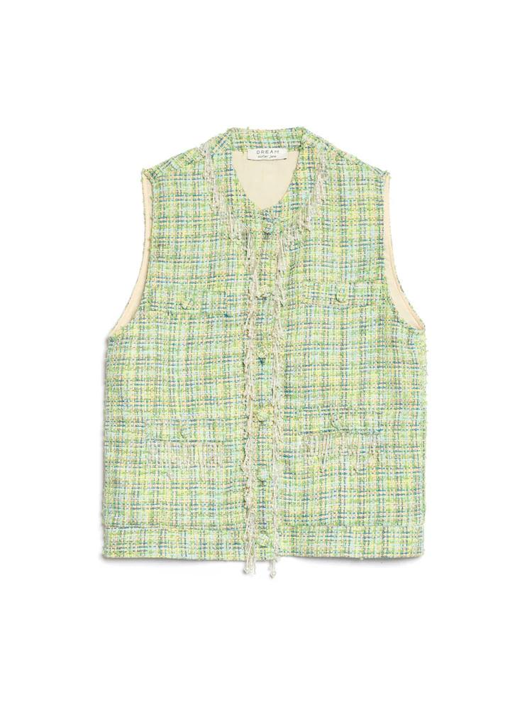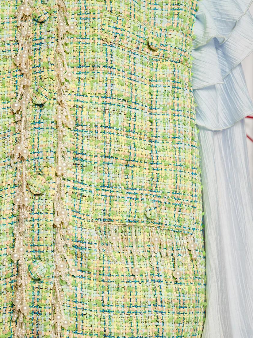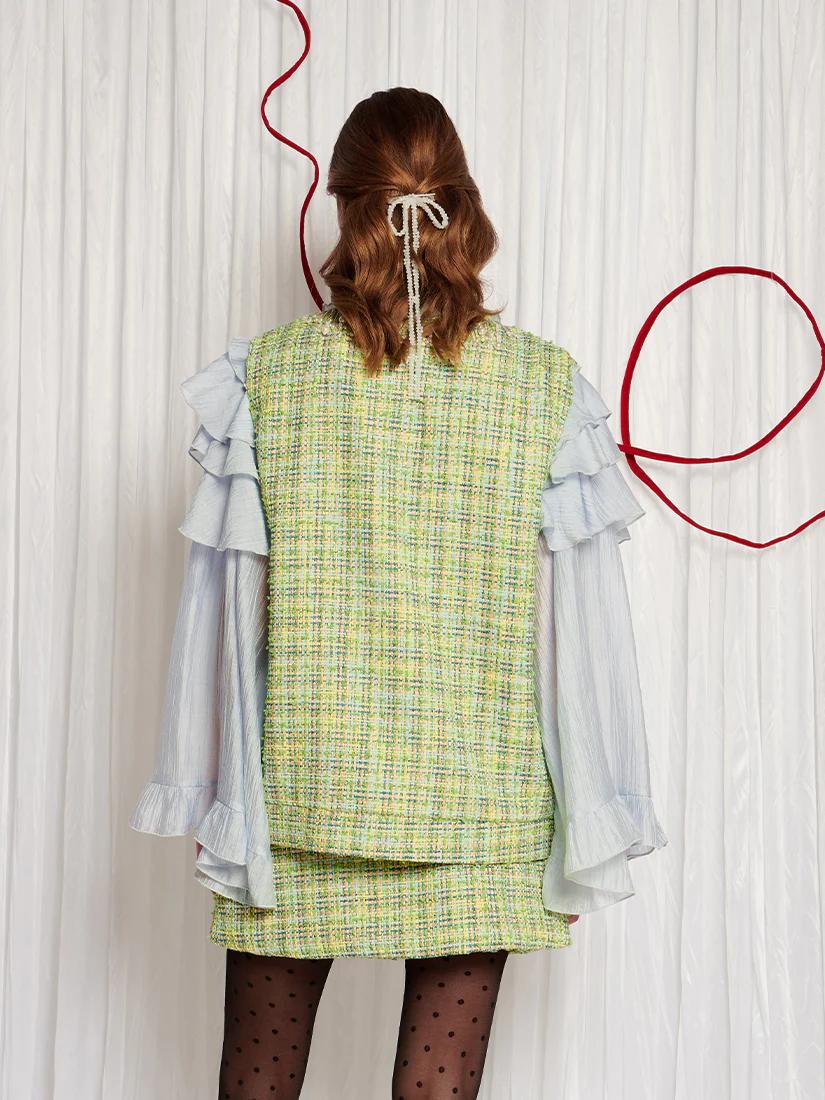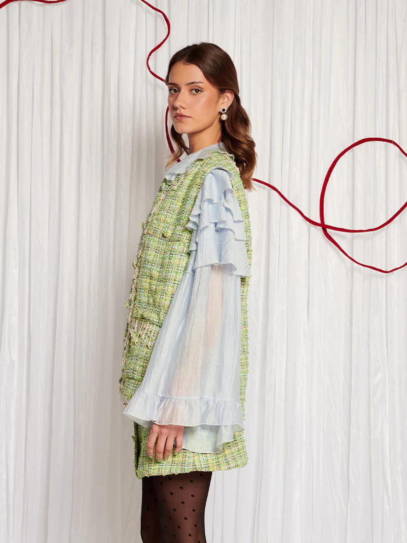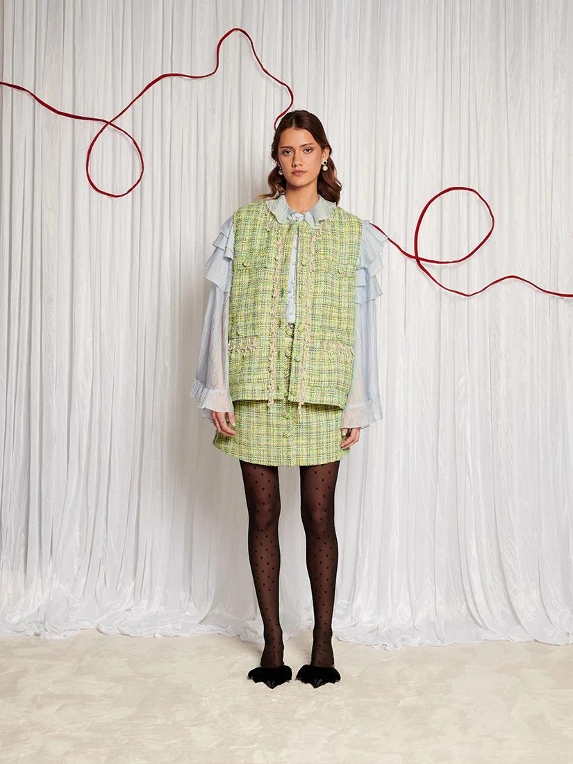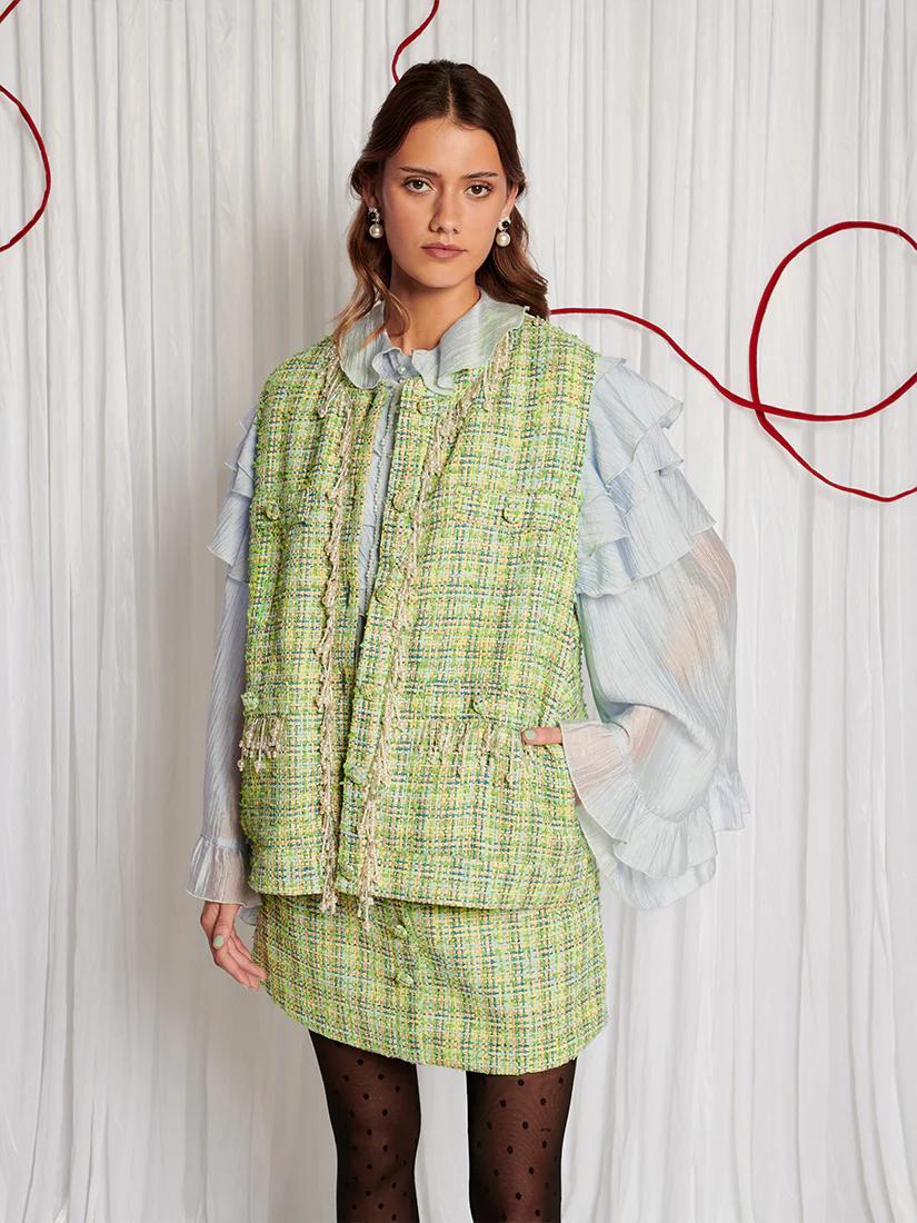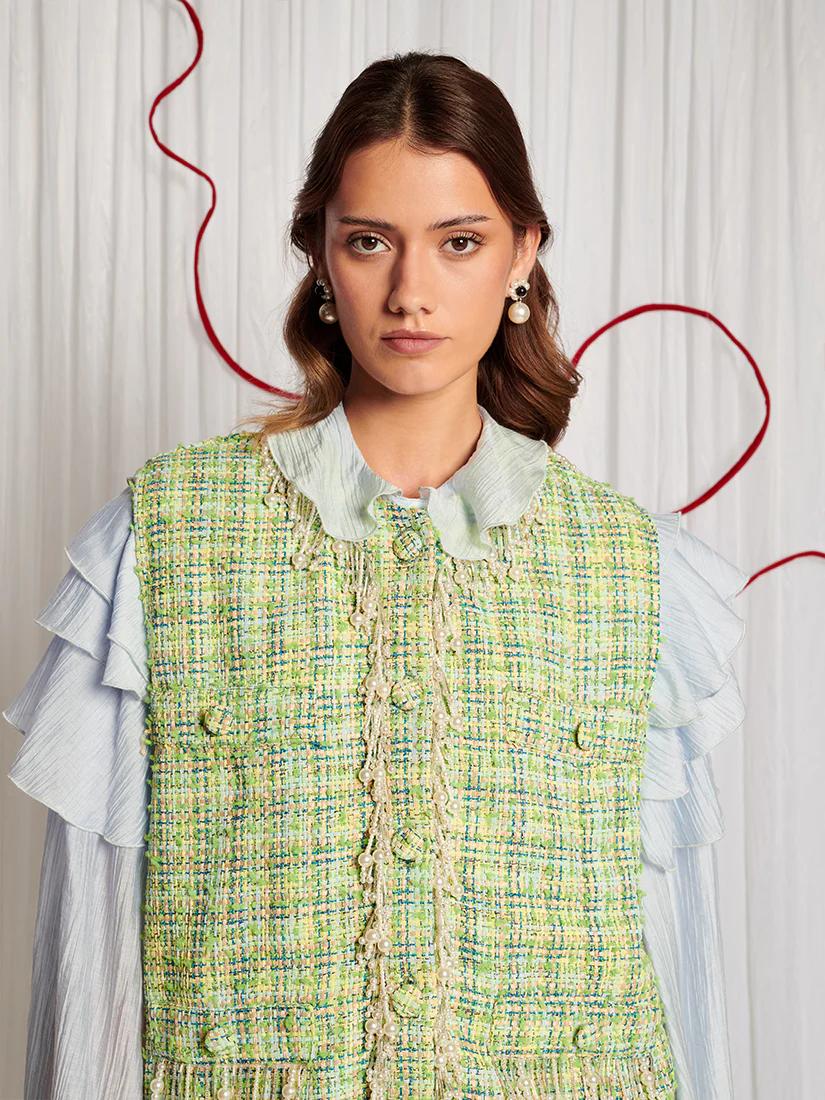 The Hummingbird Tweed Jacket is the perfect blend of classic charm and modern flair. In a refreshing green hue, this sleeveless, boxy-fit jacket adds a fresh, springtime vibe to any outfit. The textured tweed fabric exudes timeless elegance, while the pearl fringe trim brings a touch of delicate sophistication. A must-