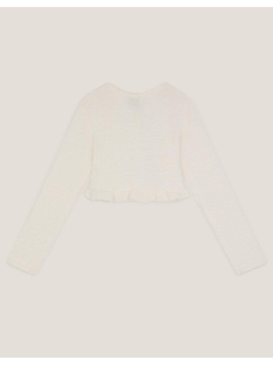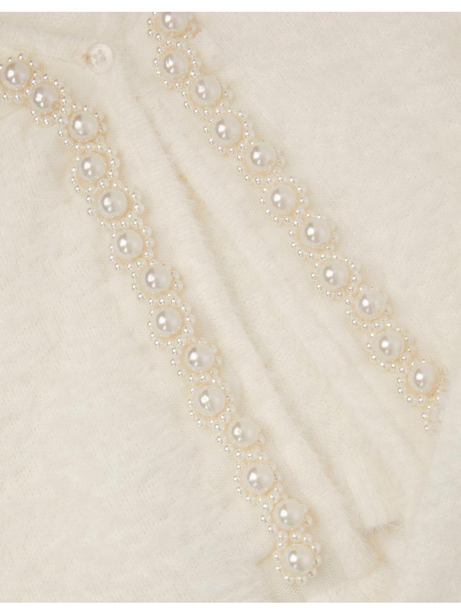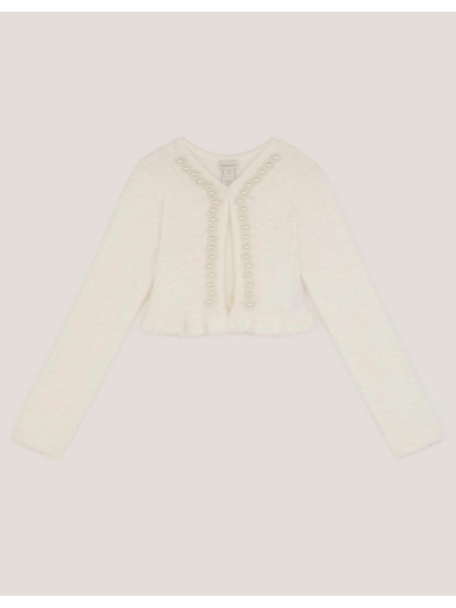 Little miss fancy pants. Stitched with super-soft fuzzy yarns, this cardigan is a cute, cosy layer to style over all their occasion and party looks. Decorated with shimmery pearl beads, it's finished with a single button fastening and a frilly hem. White