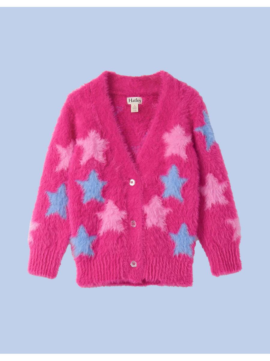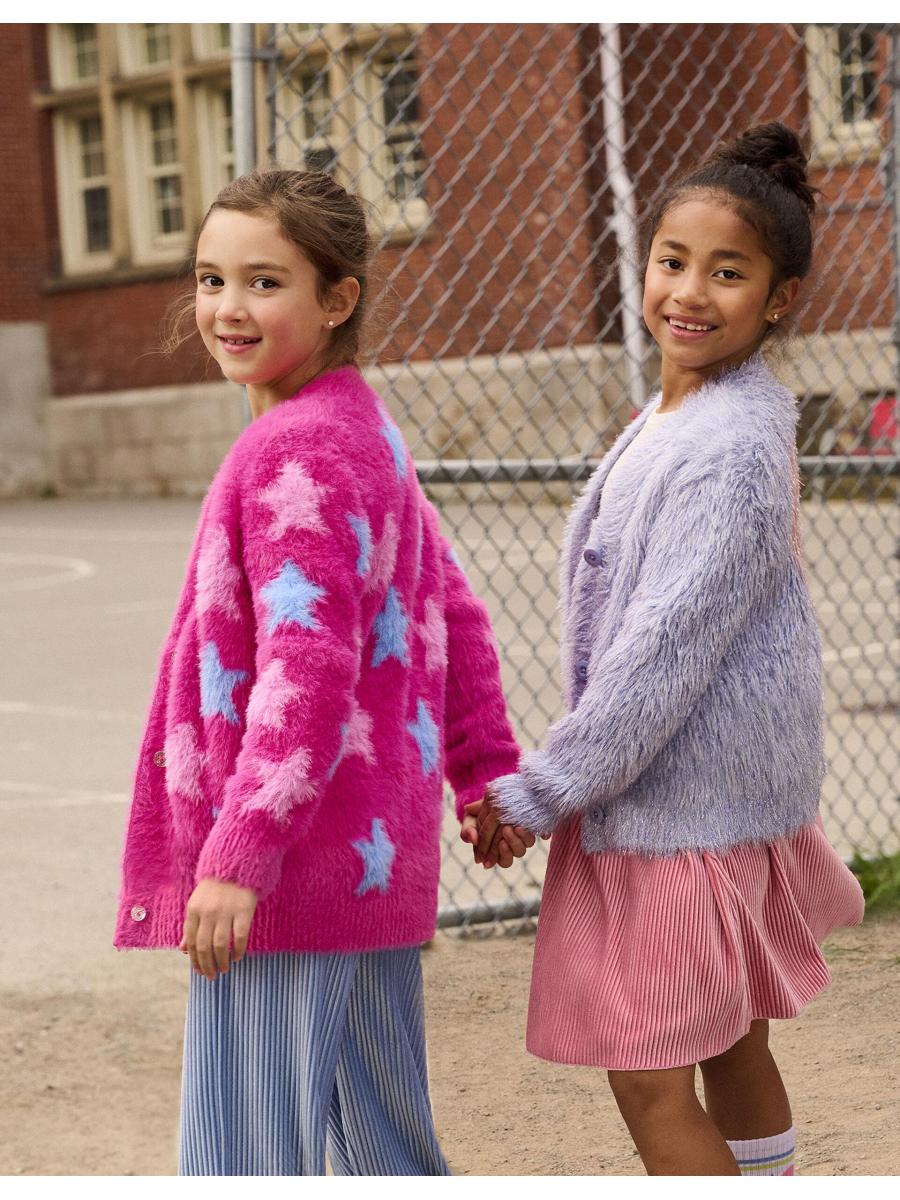The product: Cosmic cosiness. The star of the show in their knitwear collection, this cardigan showcases baby pink and blue stars over the hot pink backdrop. Stitched with super-soft fuzzy yarns, it feels like a cuddle in clothing form. Finished with glittery front button fastenings.