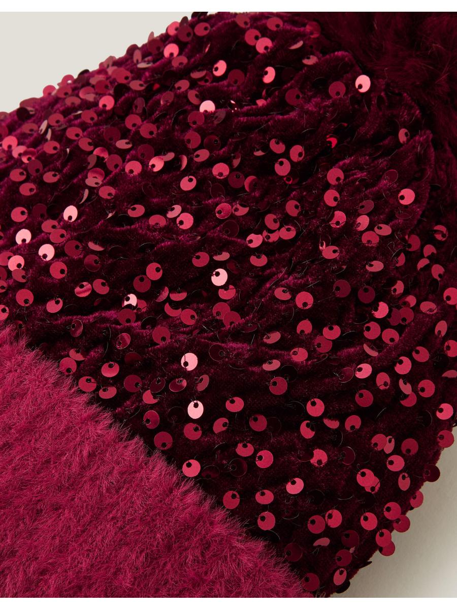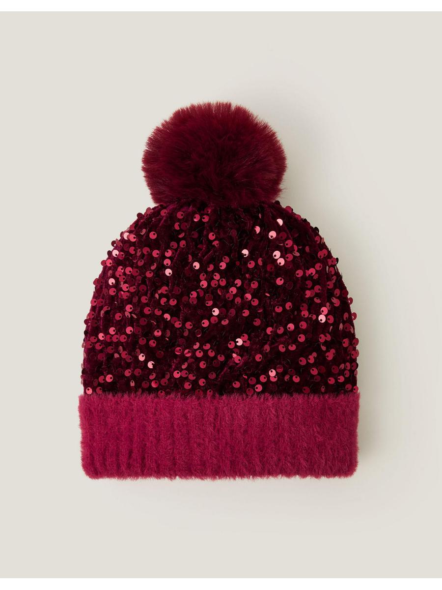 Stylish adventures await. Primed for chilly outings to the park, this beanie hat features sparkly sequin embellishments and a fluffy faux-fur pom on top. Matching mittens available. Red