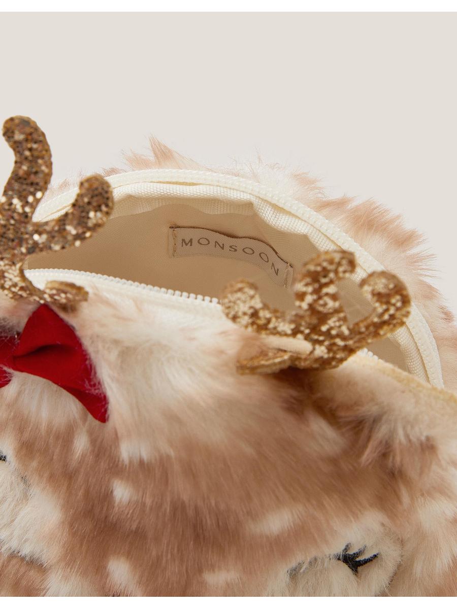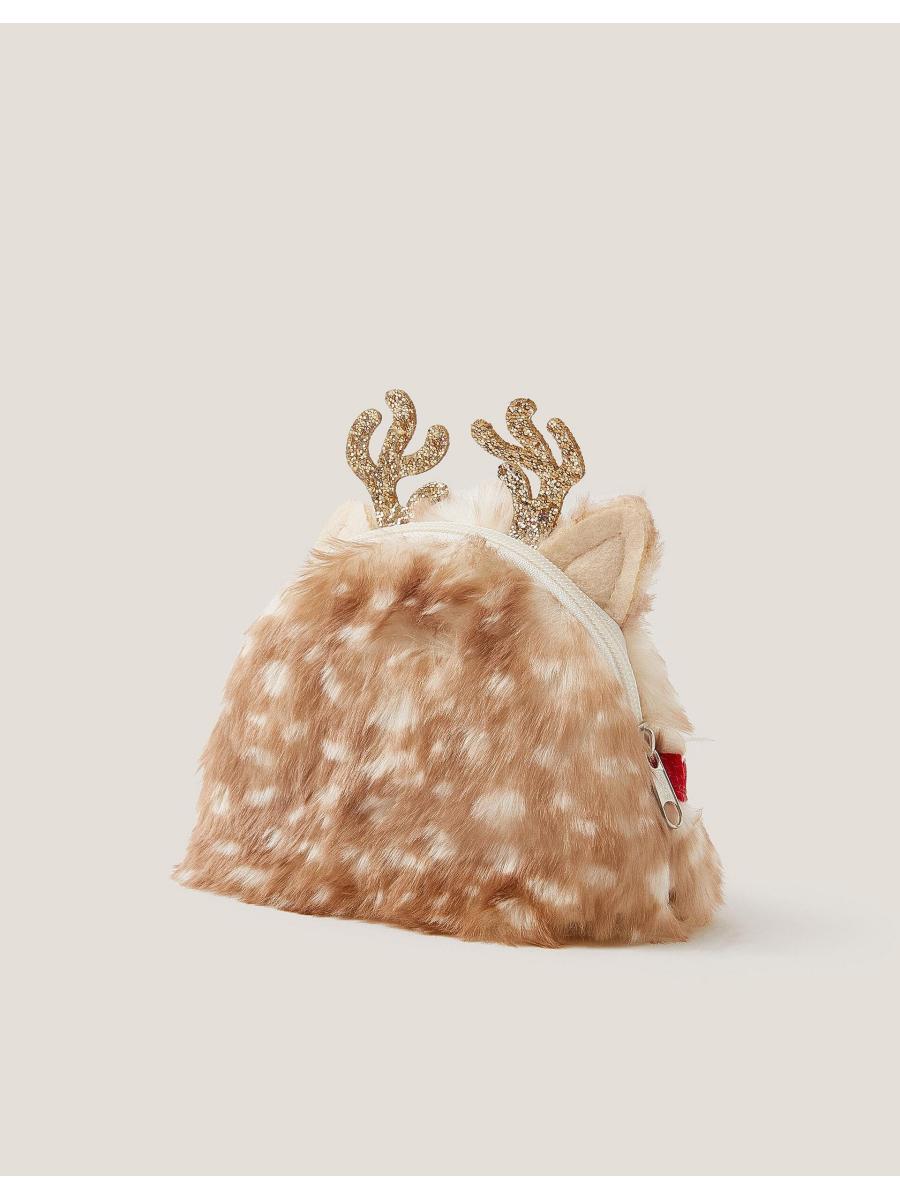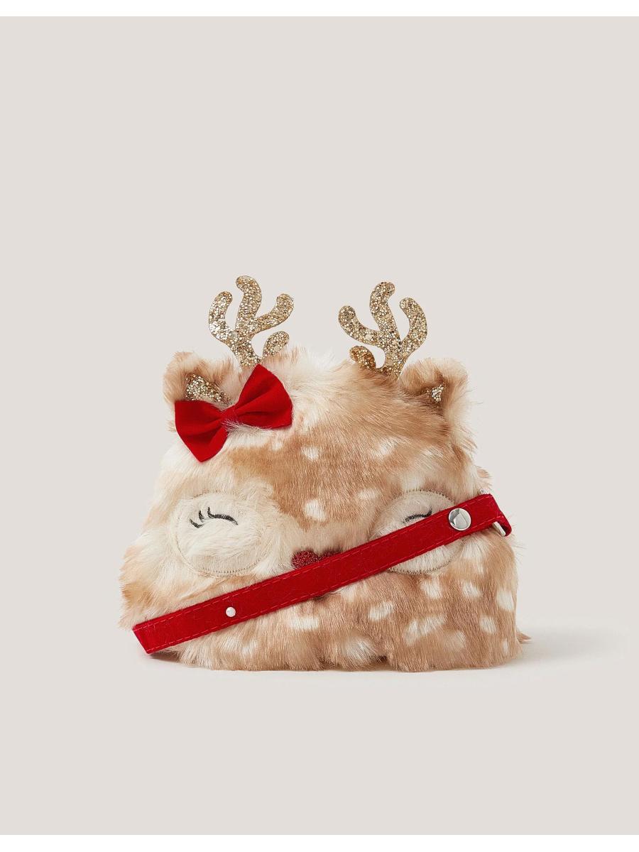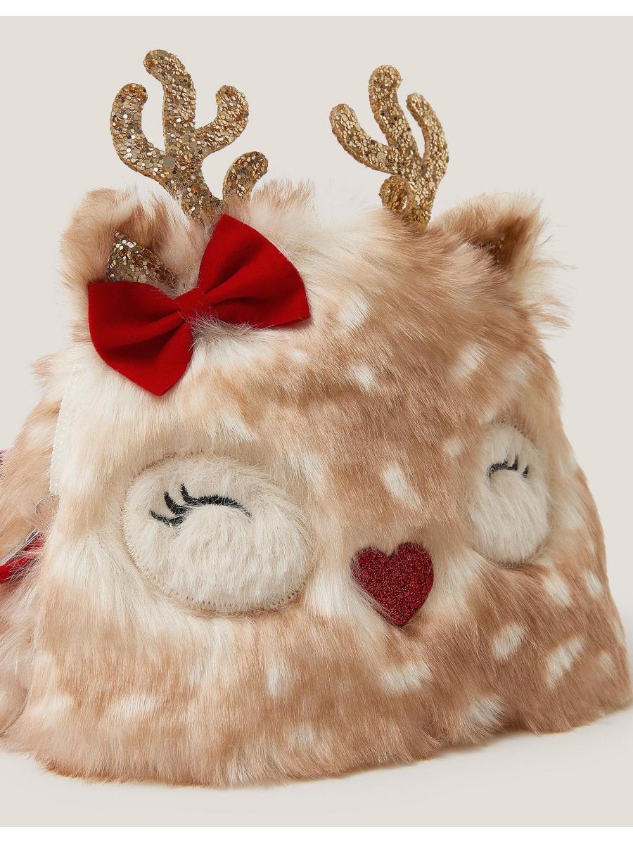 For Santa's little helpers. A fun addition to their festive accessories, this fluffy bag boasts a sweet reindeer face, golden antlers and a Rudolph-approved sparkly heart for the nose. Finished with a red bow and zip fastening.