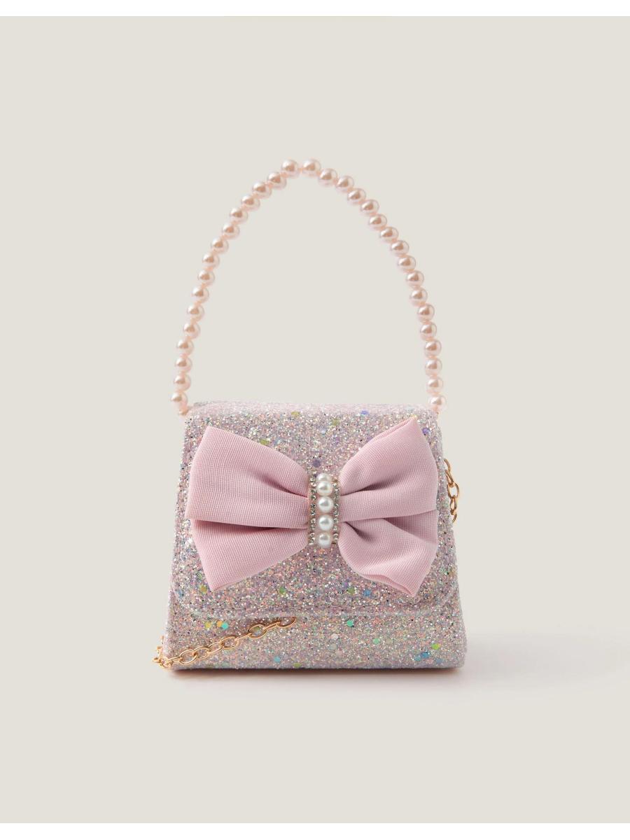 Accessories that WOW. The perfect bag for all the mini fashionistas that love to sparkle. Covered in iridescent glitter, it showcases a pink bow on the front and a pearl-strung top handle to match. Features a magnetic button closure and long chain strap for hands-free styling, too!