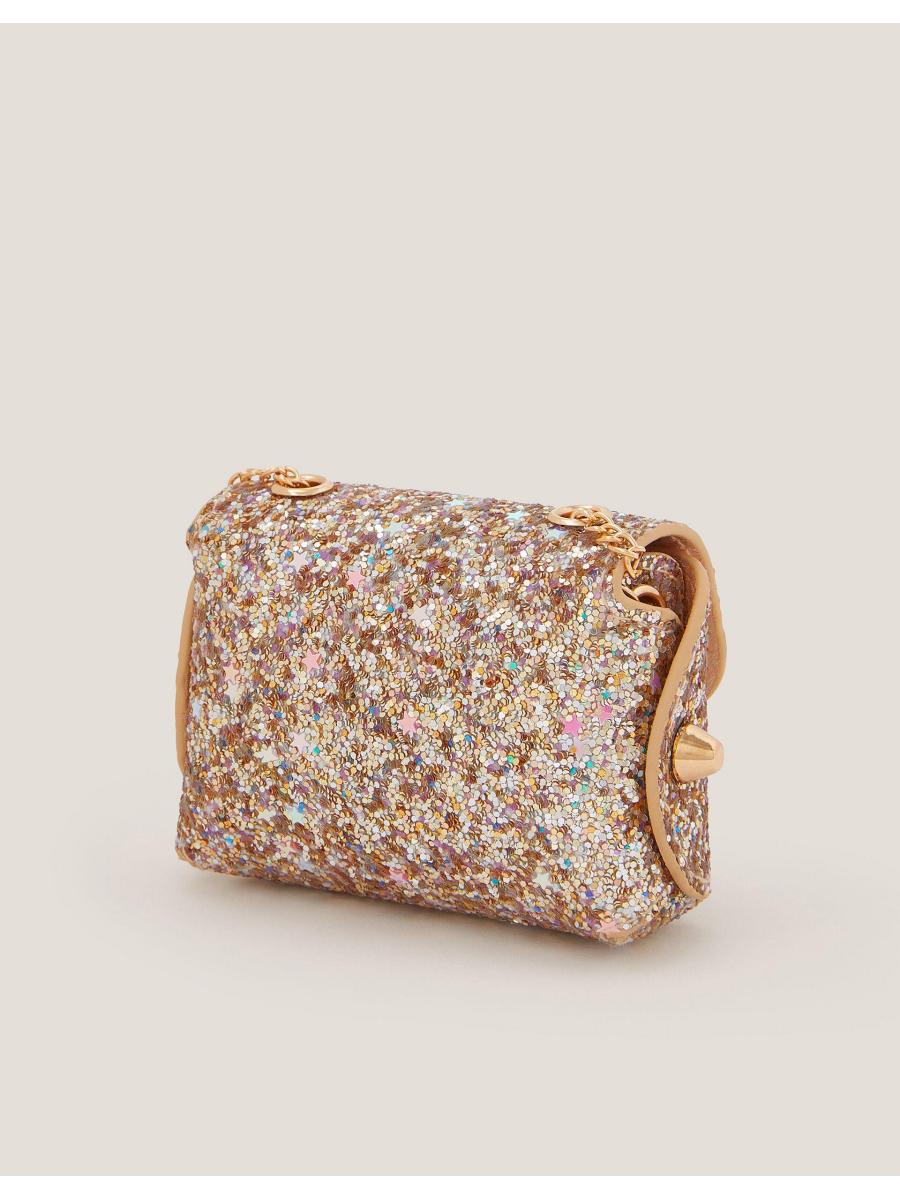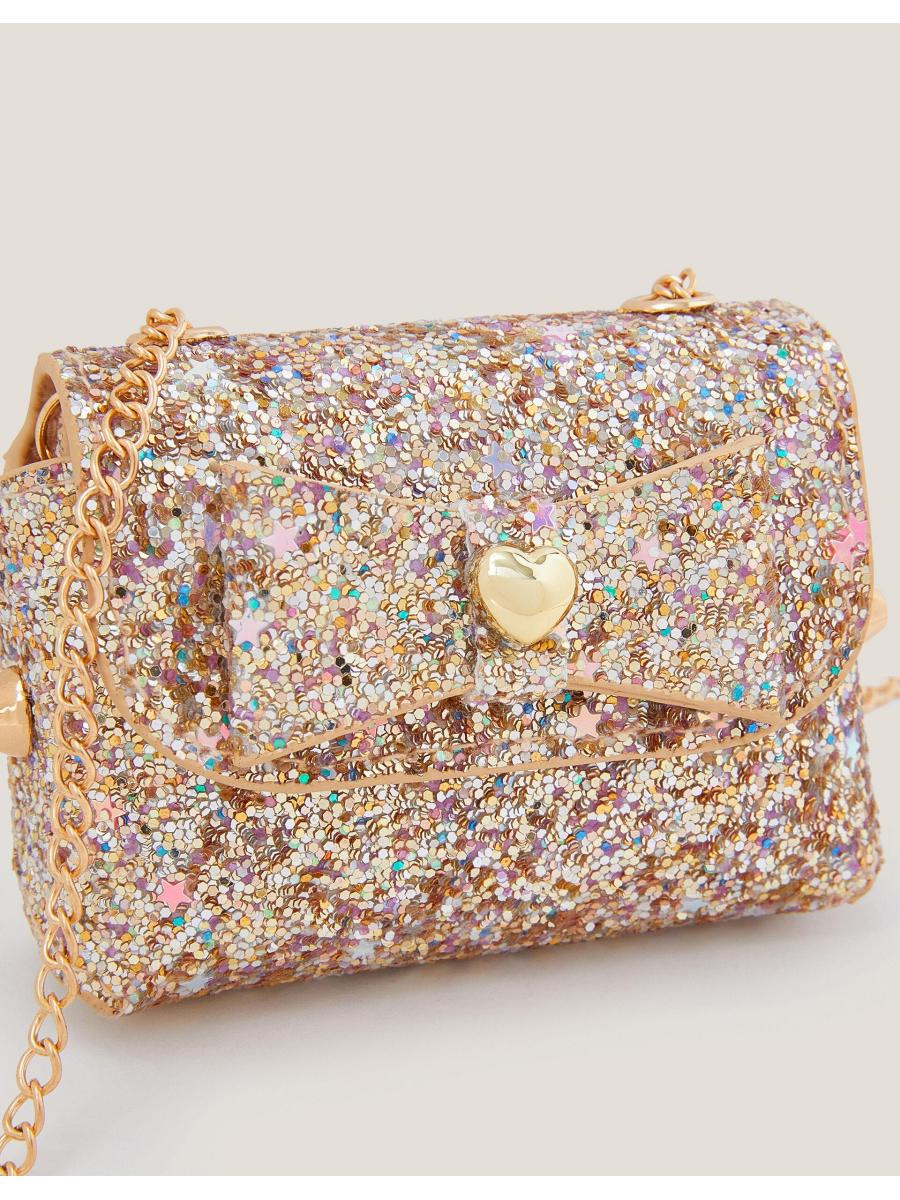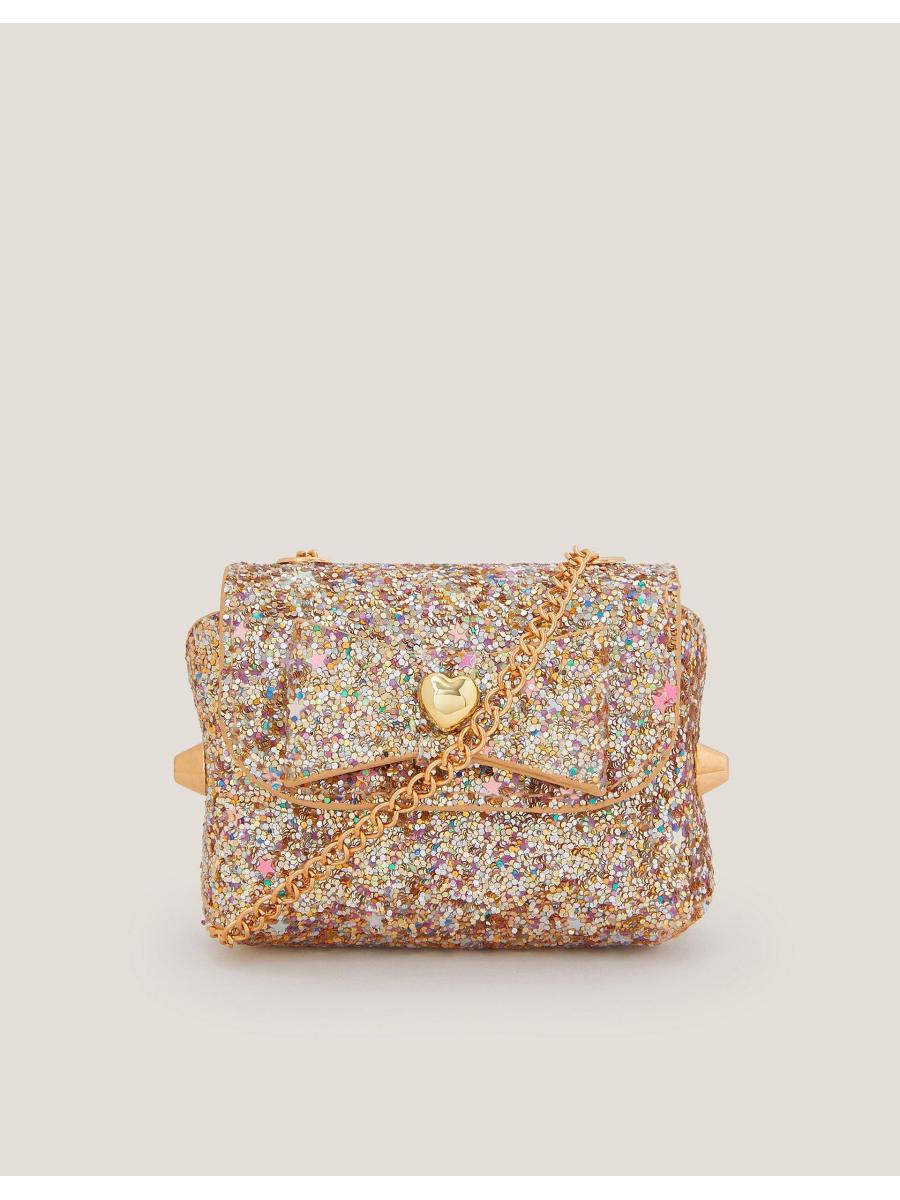 Sparkle like you mean it. Doused in colourful glitter, this bag features a bow on the front and gold-tone hardware to match the long chain strap. Small but statement, it's the perfect accessory for all their party essentials.