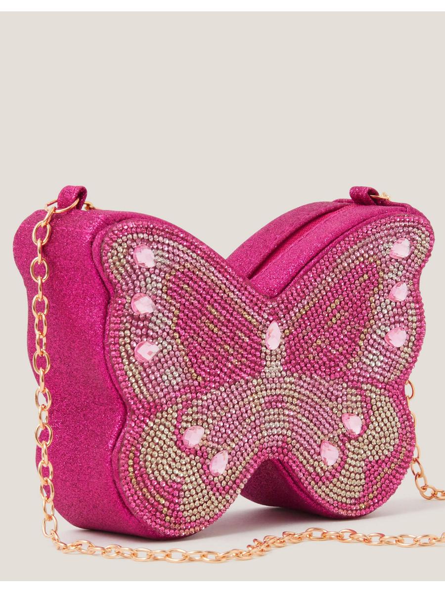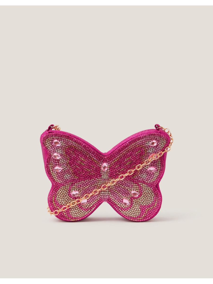 Looking (butter)fly! The perfect accessory for all their party looks, this bag is shaped like a butterfly and bedazzled with sparkly rhinestones and gems. Features a zip fastening and gold-tone chain strap.