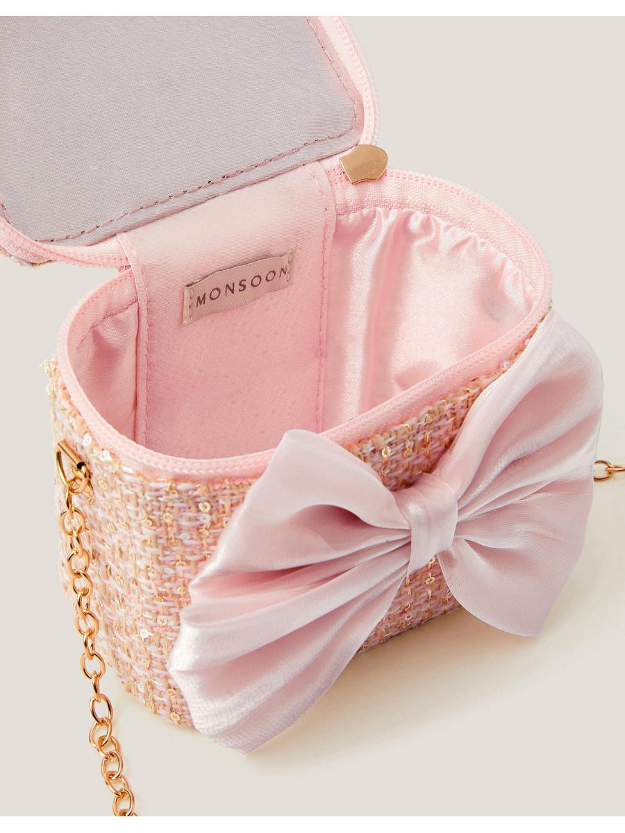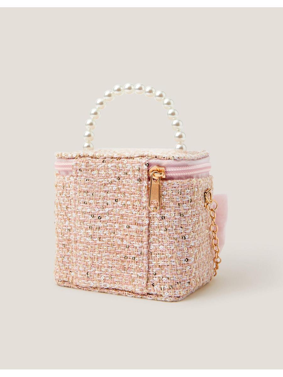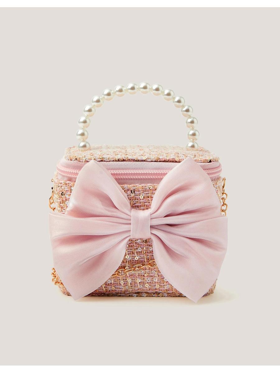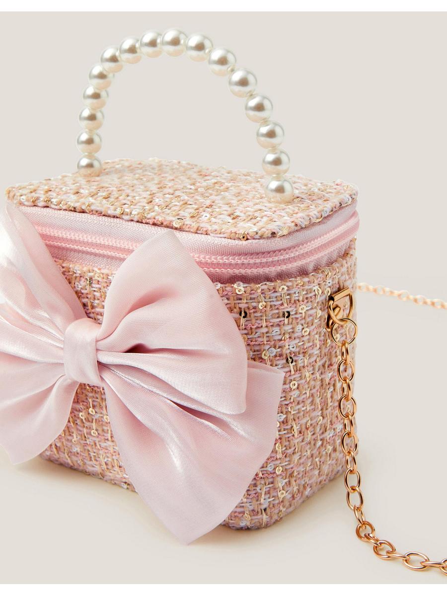 For the mini Karl Lagerfeld fans. Designed in pink tweed, this bag features a zip top lid, pearl-beaded handle, XL satin bow and a gold-tone chain strap. Cute, right?