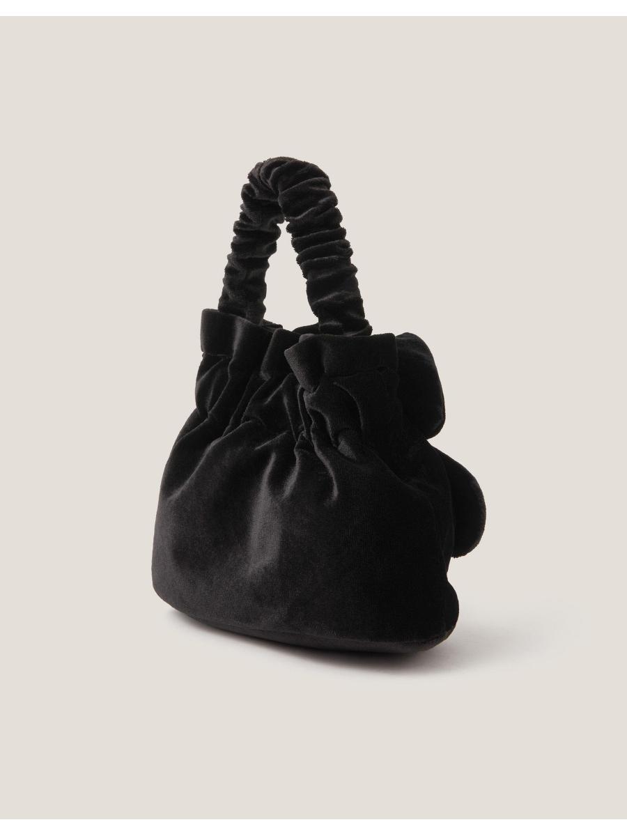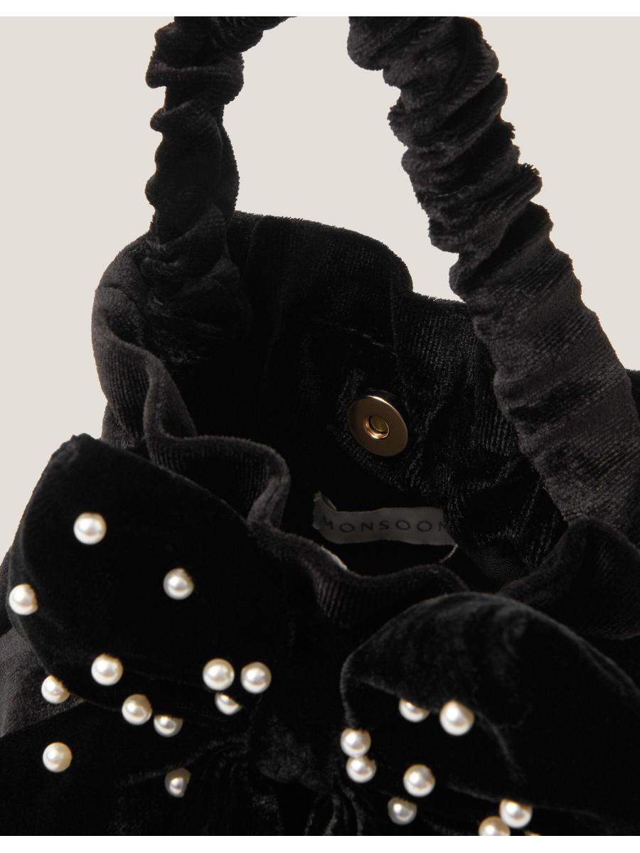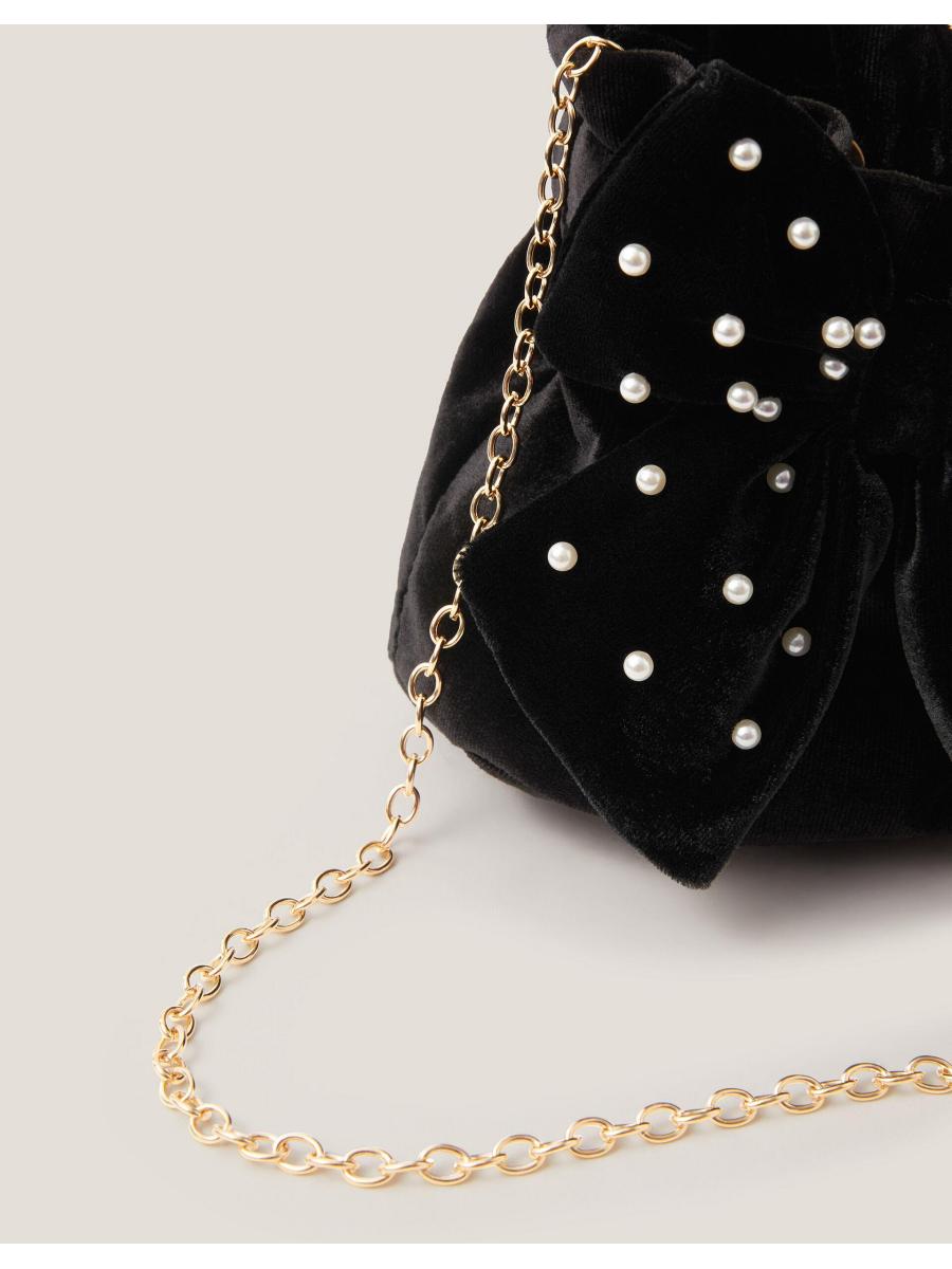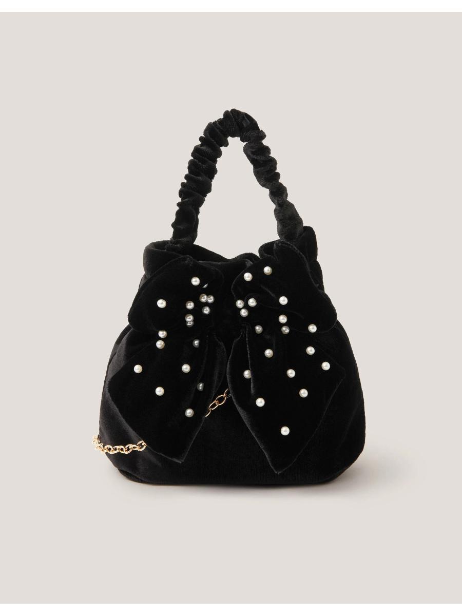 Does this come in adult size, too? Made from super-soft velvet, this mini pouch bag showcases an XL bow bedazzled with pearl beads. Features a magnetic button fastening, ruched top handle and optional chain strap.