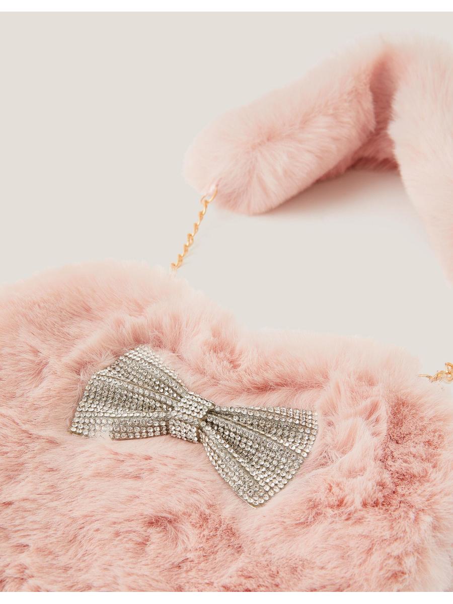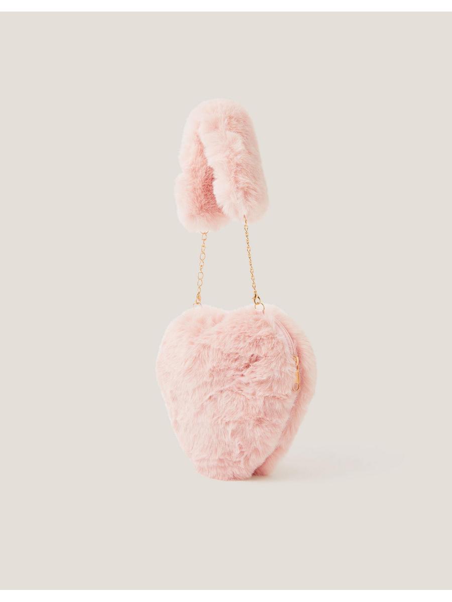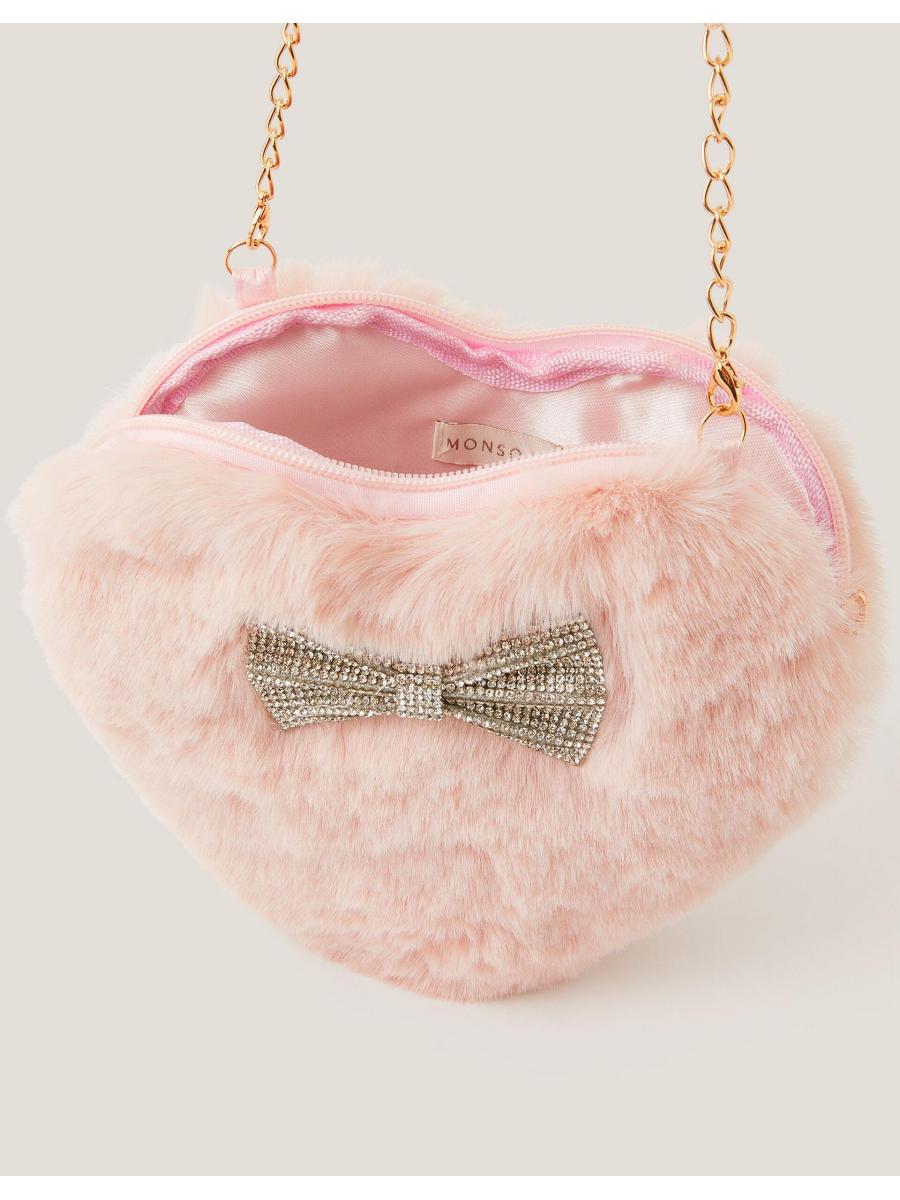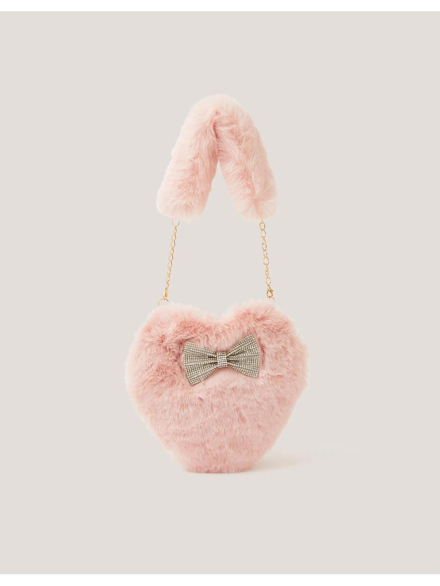 *Heart eyes emoji here*. A cuddly cute accessory for all their party looks, this bag is shaped like a love heart in pretty prink faux fur fabric. Features a bedazzled bow on the front with a chain strap and zip fastening.