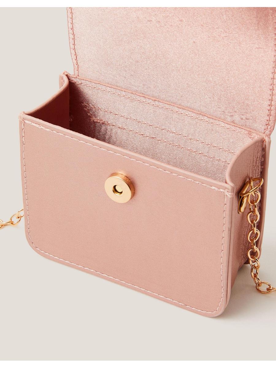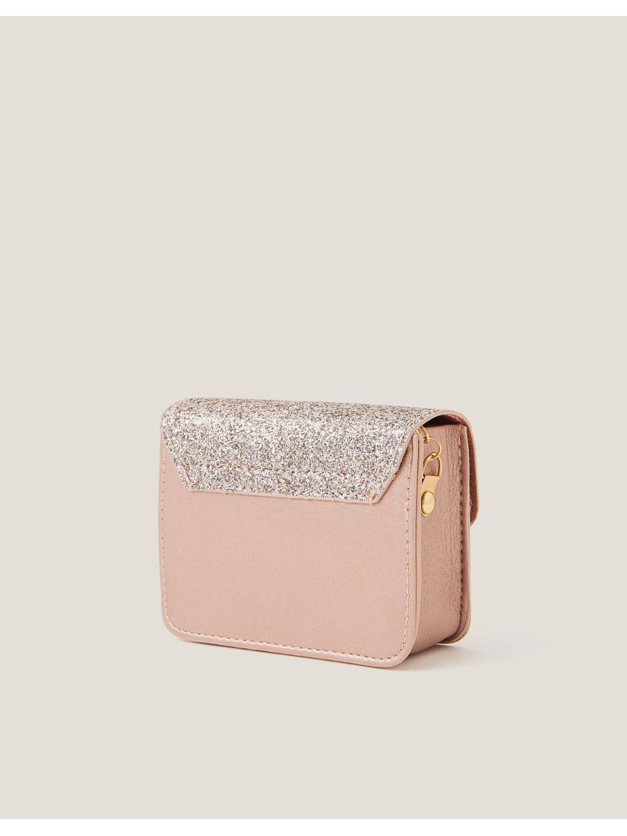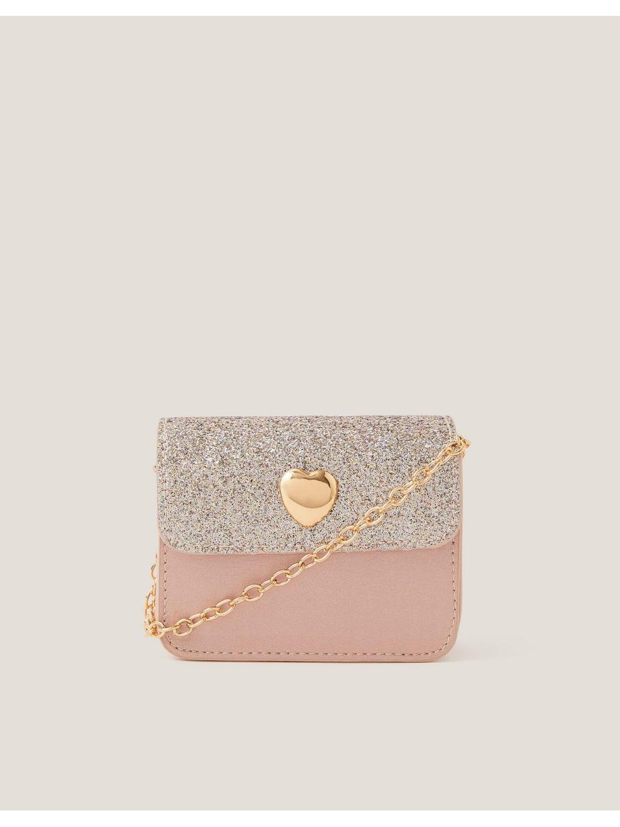 For everyday sparkles. Designed in a fold-over profile with gold heart-shaped hardware, this glittery bag comes with a long chain strap to sling over their shoulder or style across the body.