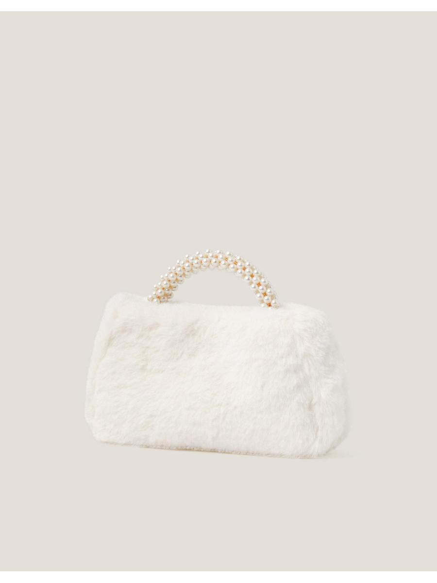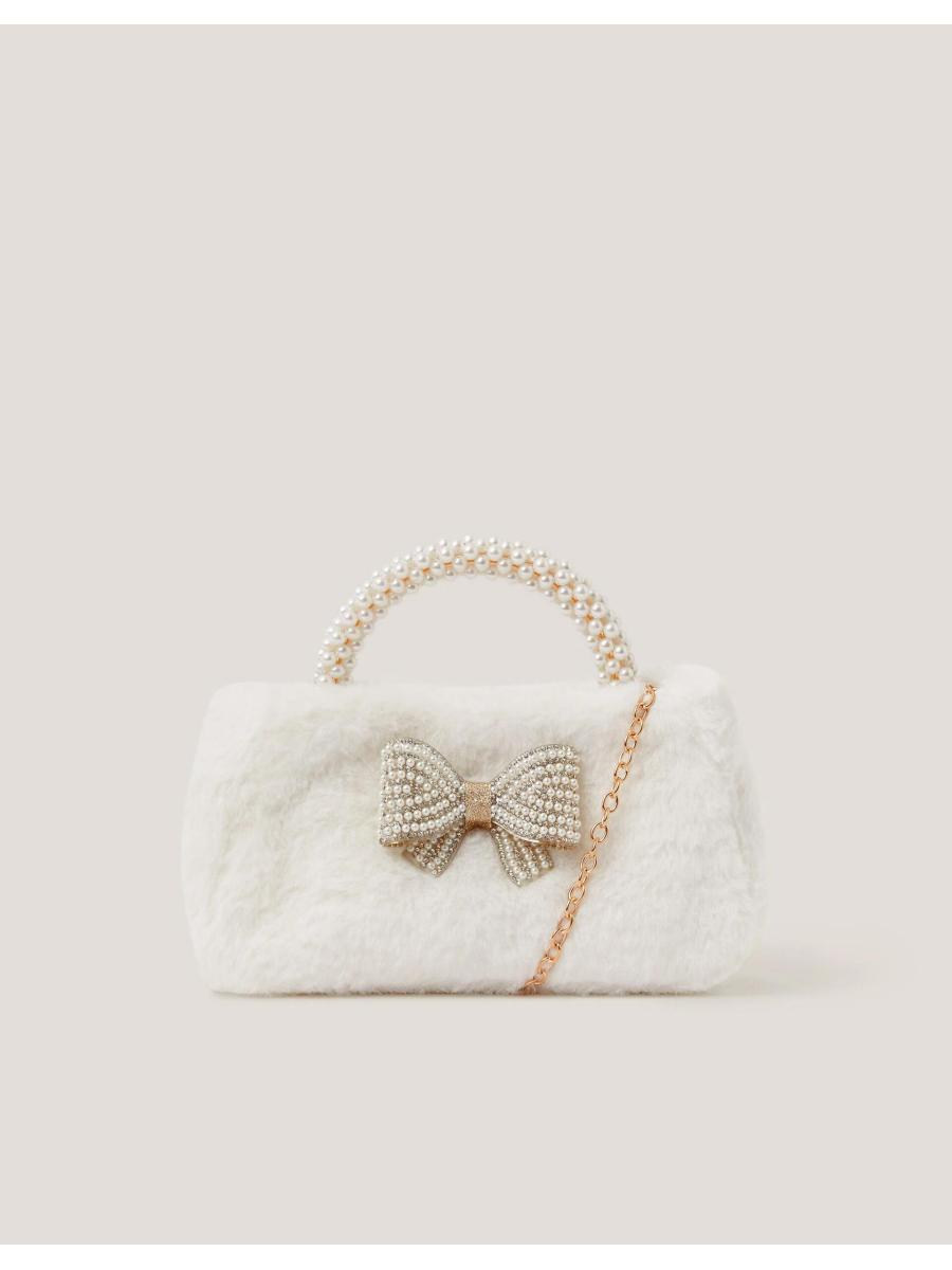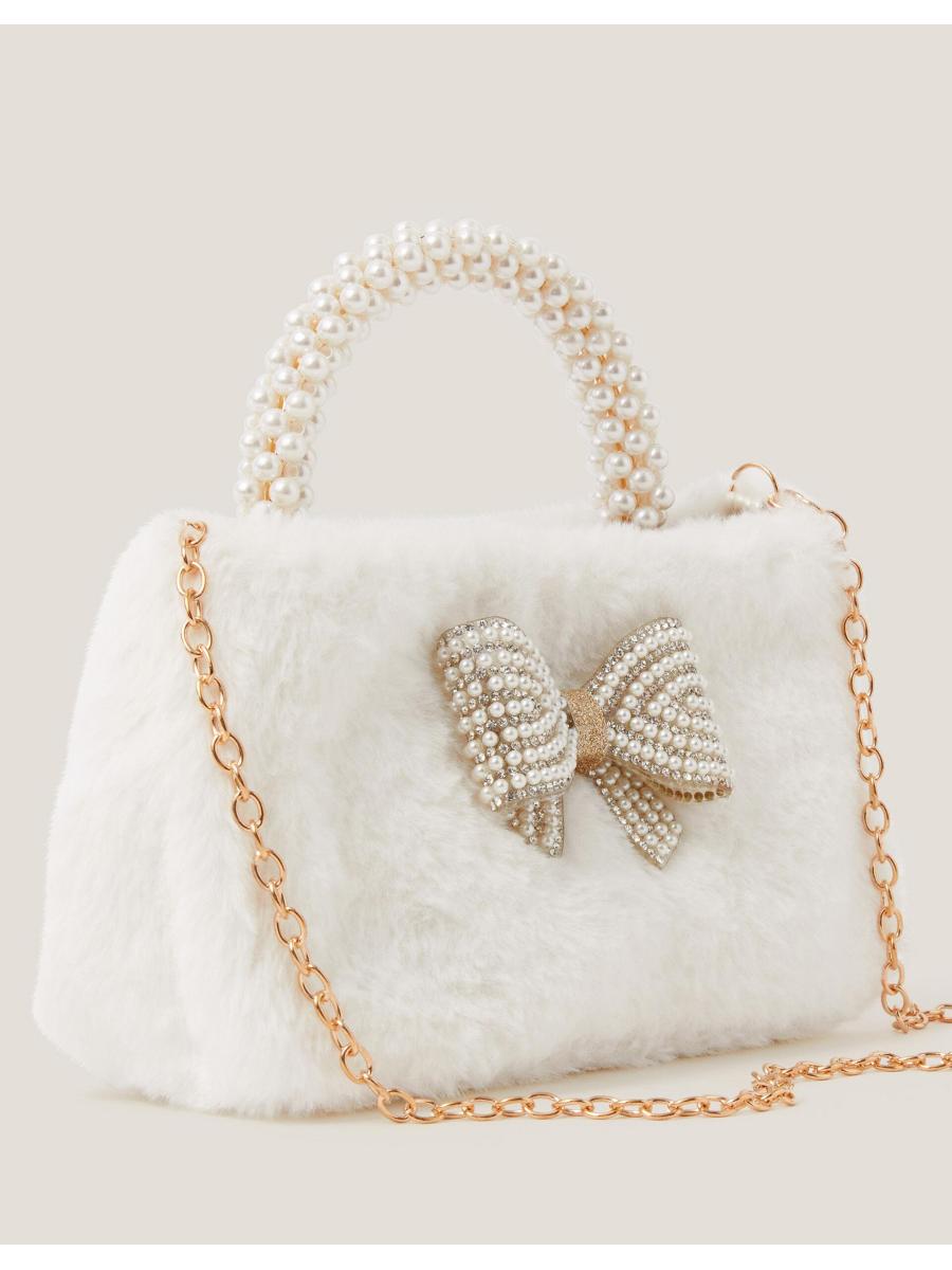 Little Miss Glam. A bow-tiful accessory for all their special occasion outfits, this bag is made with super fluffy fabric and (faux) pearl embellishments on the handle and bow. Comes with an optional chain strap.