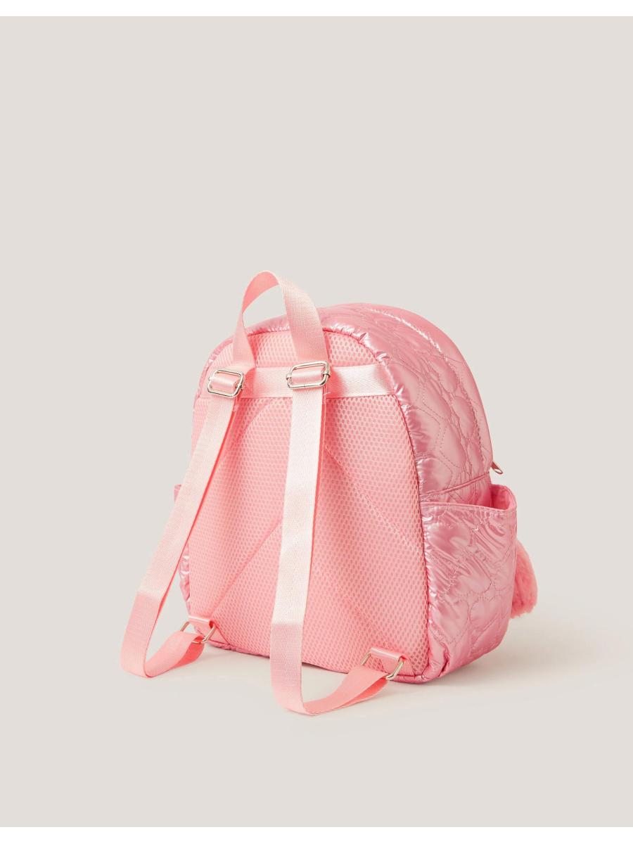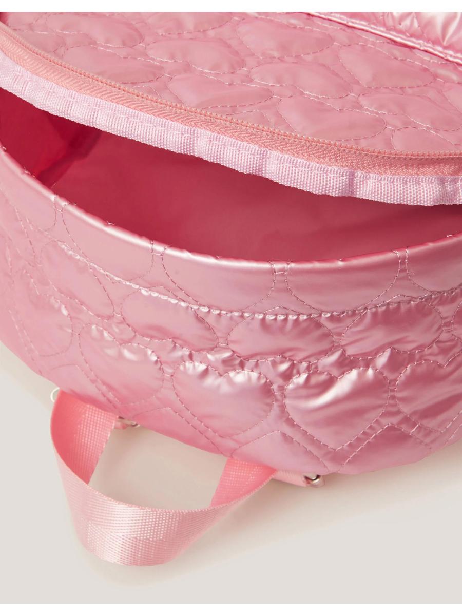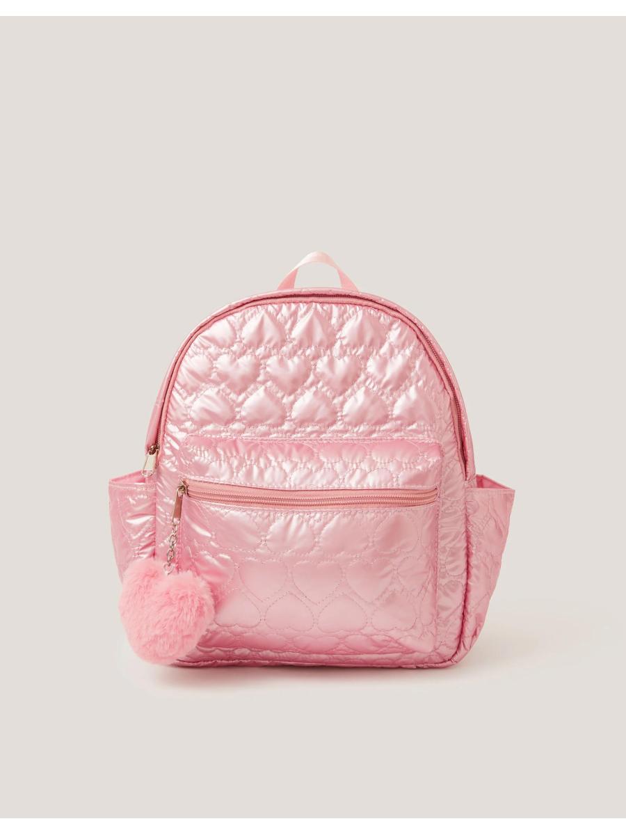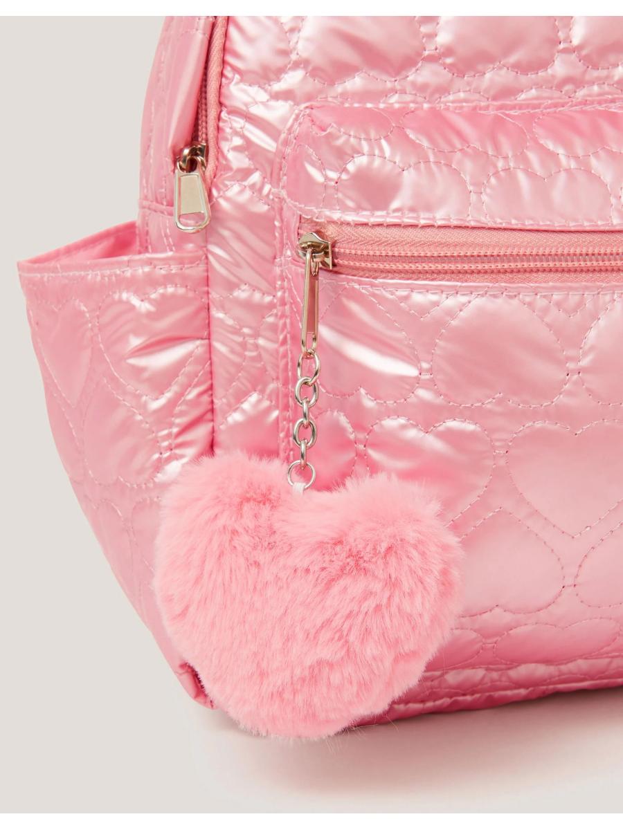 Pink-tacular! Designed with a little love in every stitch, this backpack is made from a shimmery pink fabric with heart-shaped quilting to finish. Features a main zip compartment, side pockets and a fluffy heart charm dangling from the front zip pocket, too! Cute, right?