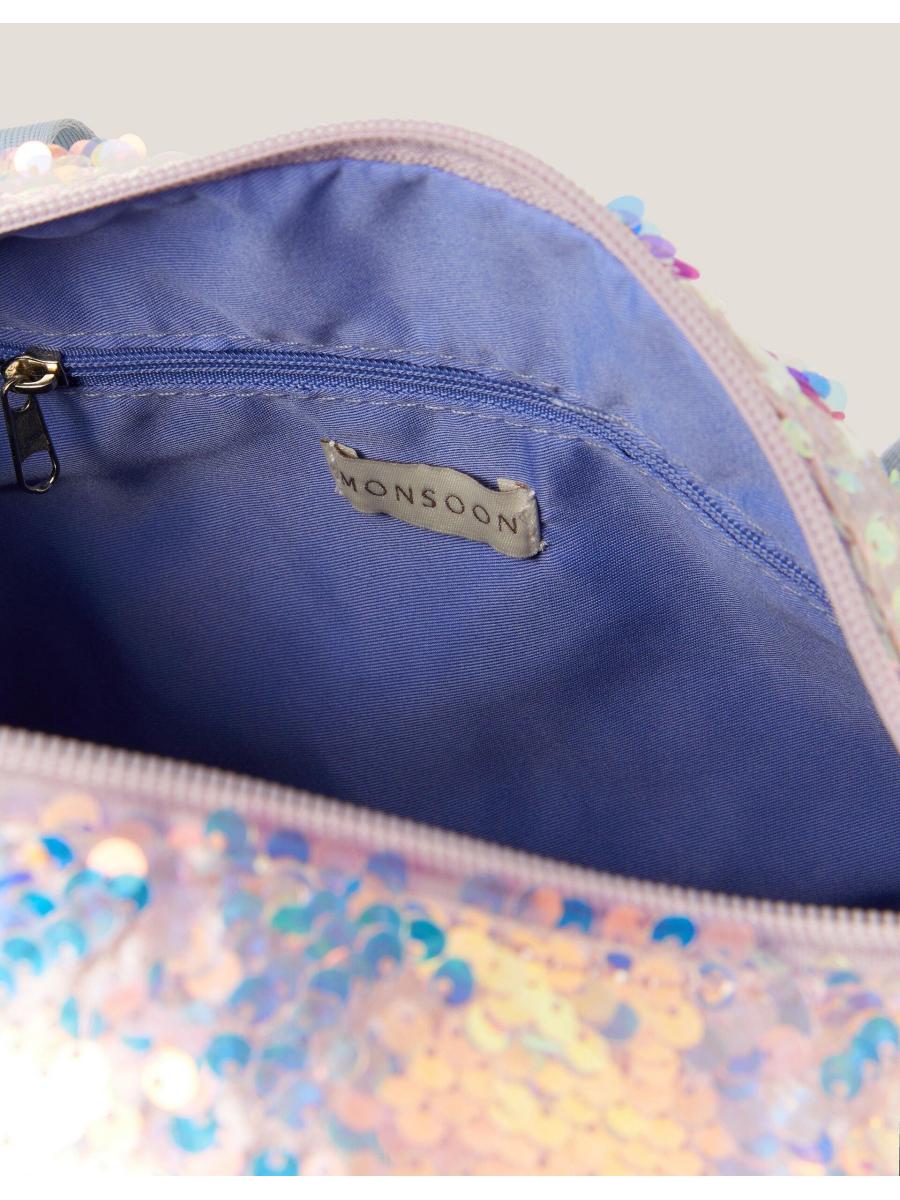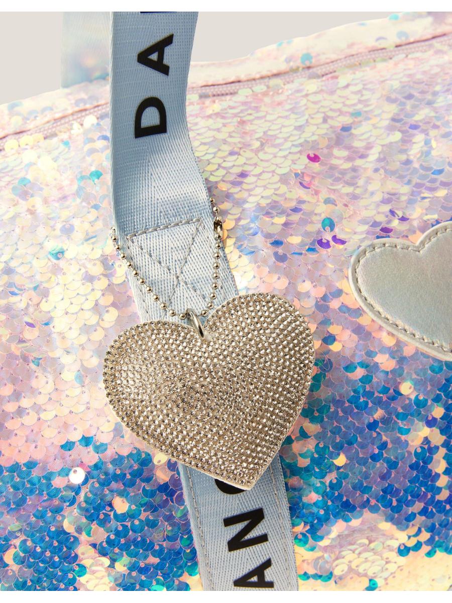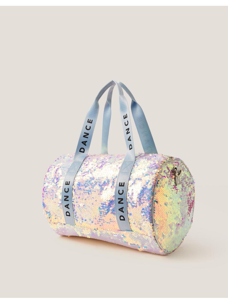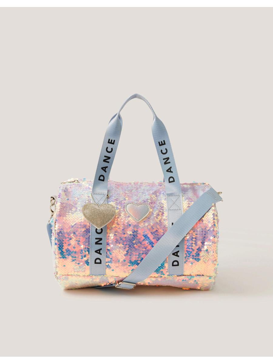Lights, camera, action! A dazzling pick for packing up their dance lesson essentials or taking on a sleepover. This duffle bag is decorated with shimmery sequins and 'DANCE' written over the sturdy shoulder straps. Finished with a zip fastening, detachable strap and rhinestone heart charm.