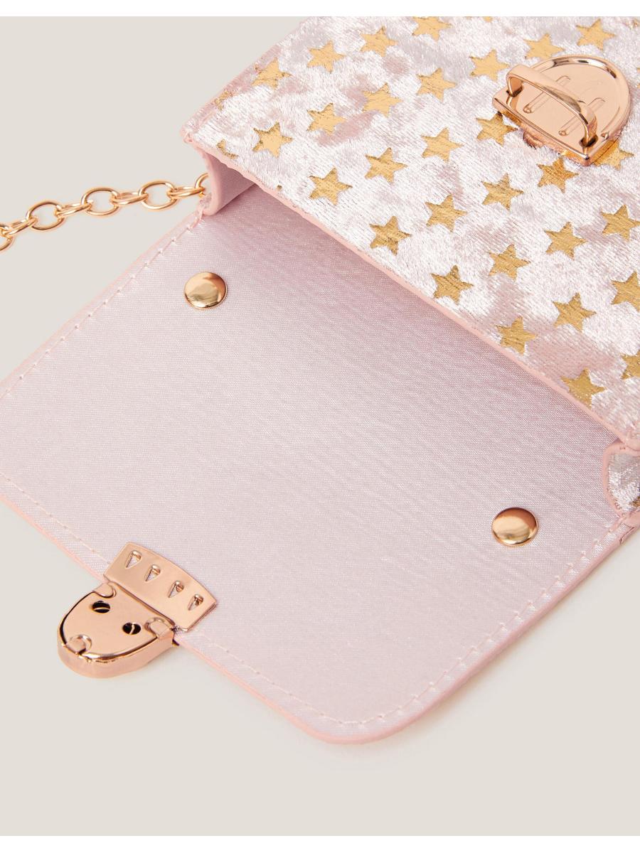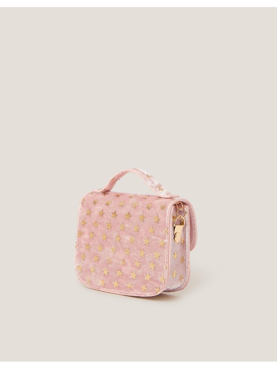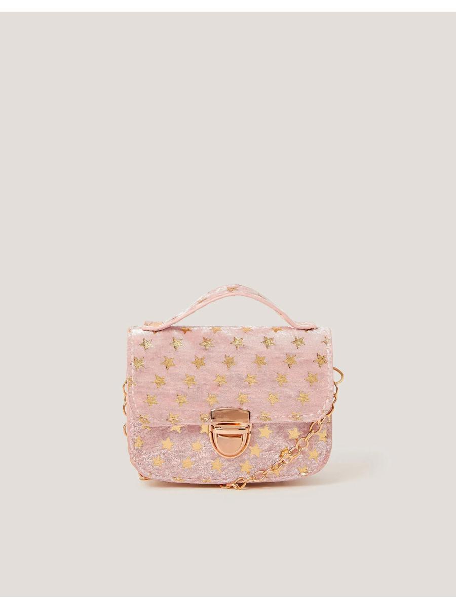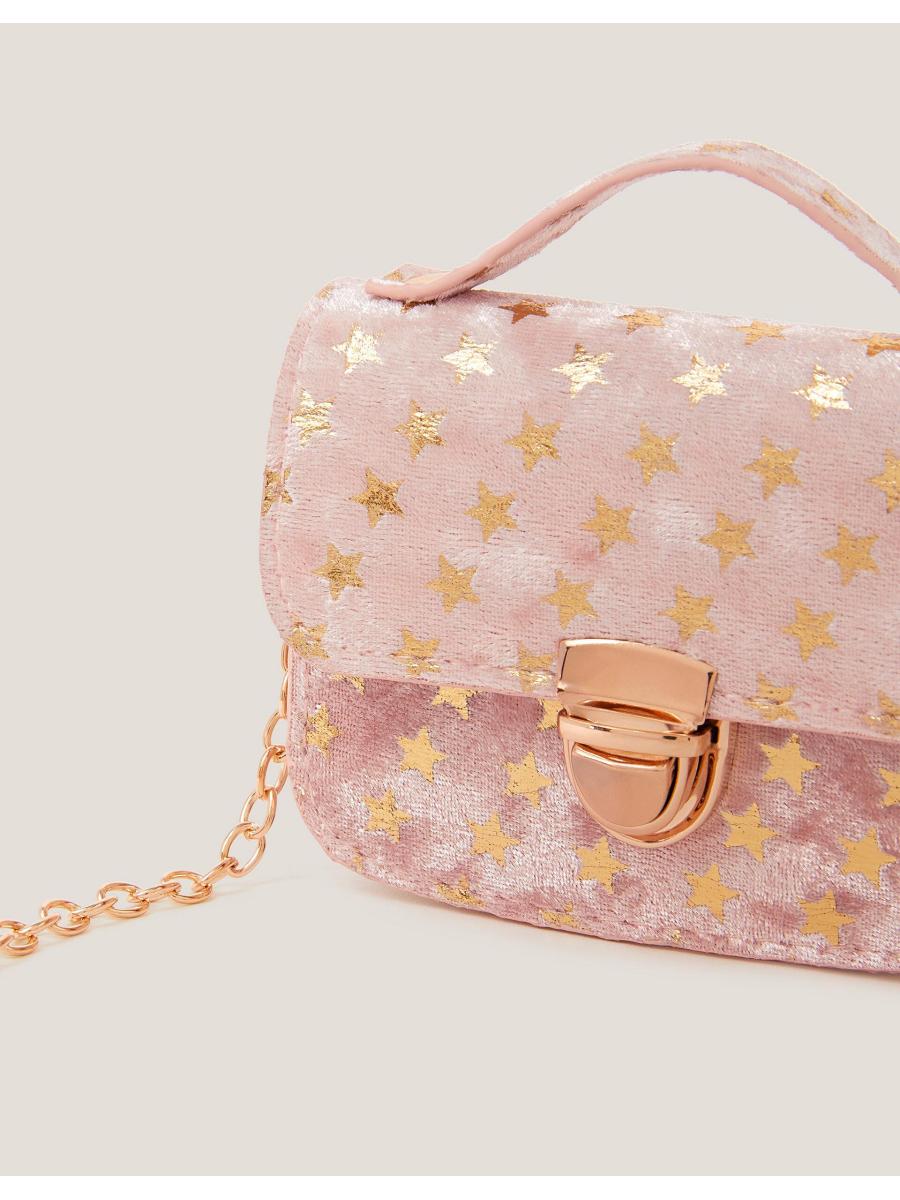 Hey pop princess! Made from soft velvety fabric in a baby pink colour, this mini bag is decorated with golden foil stars for endless sparkle. Designed with a push-lock fastening, top handle and optional chain strap for them to swing off their shoulder.