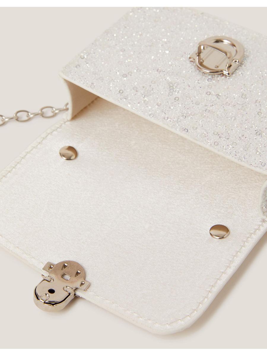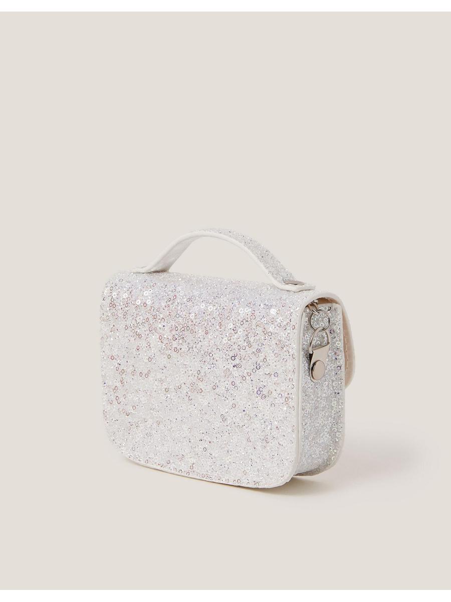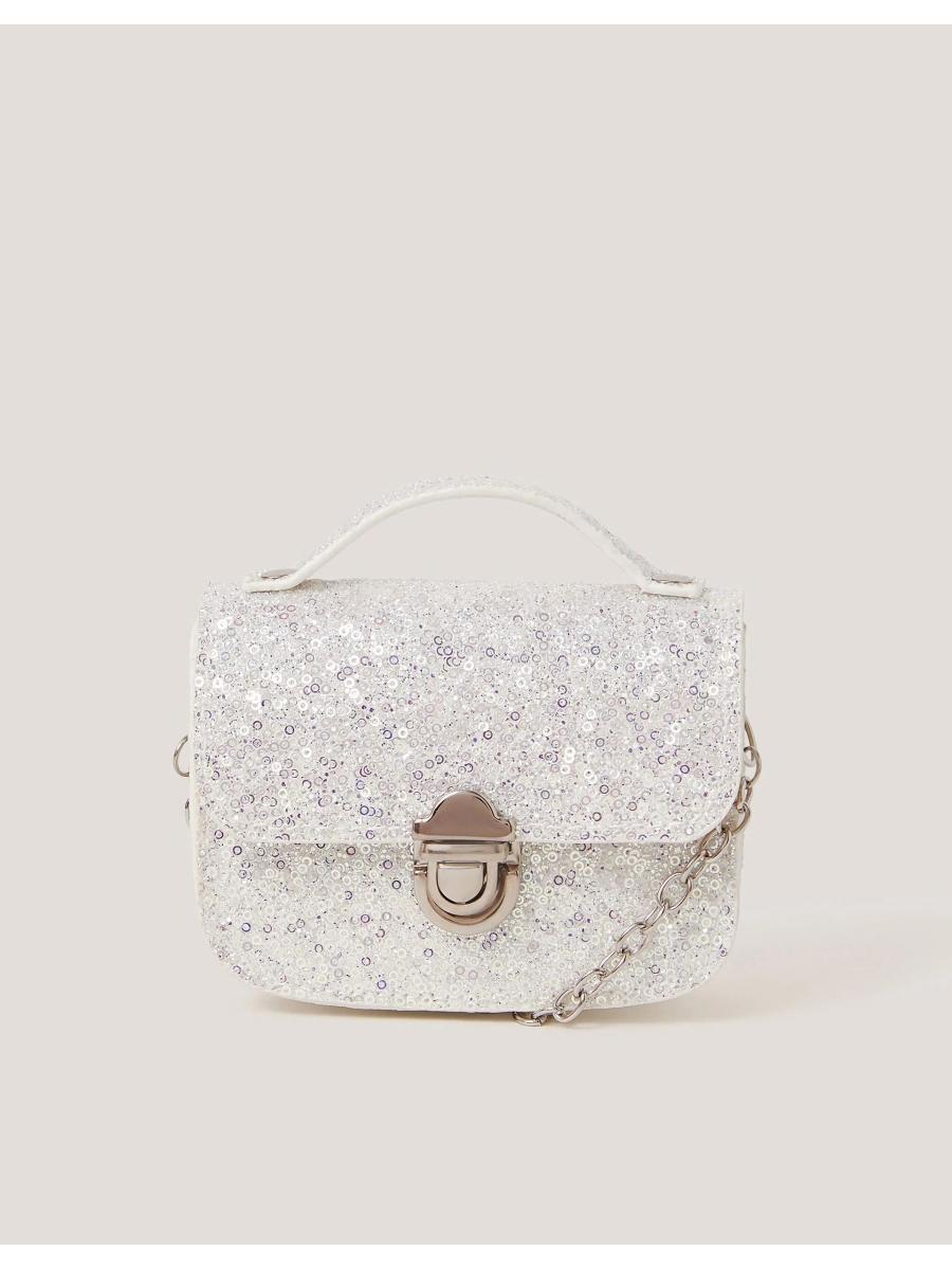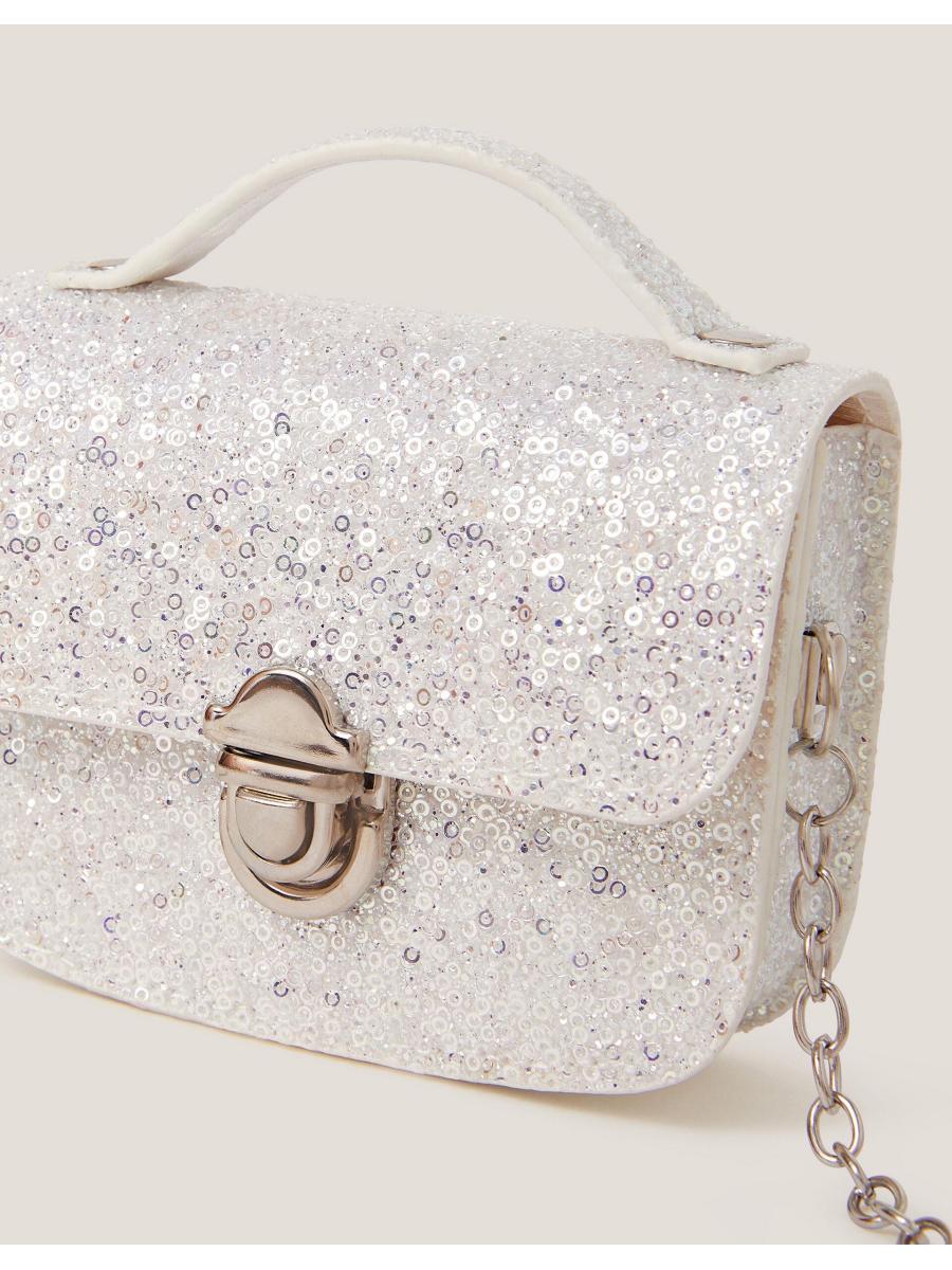 So sparkly you'll see it from space! Doused in shiny sequins, this bag has a foldover profile, push lock fastening and silver-tone chain strap. The perfect accessory for all their party looks.