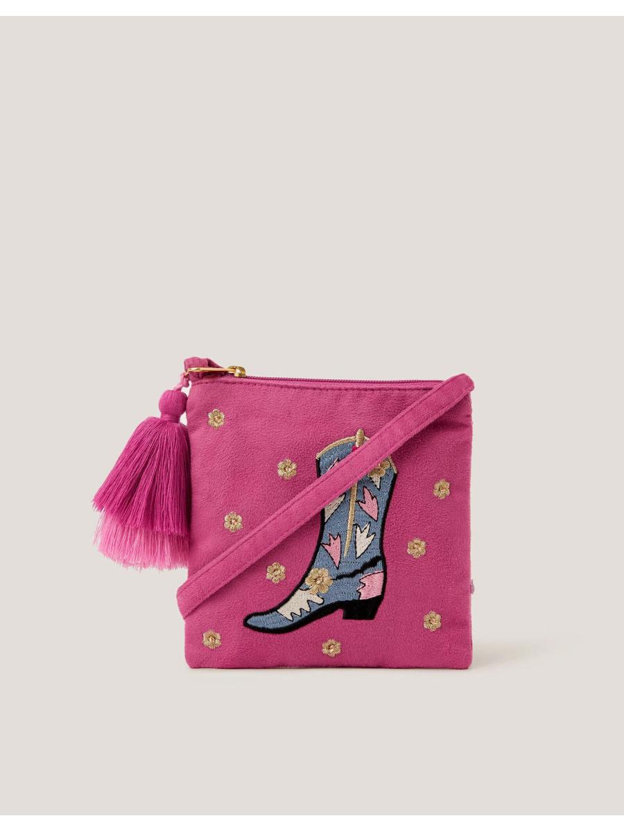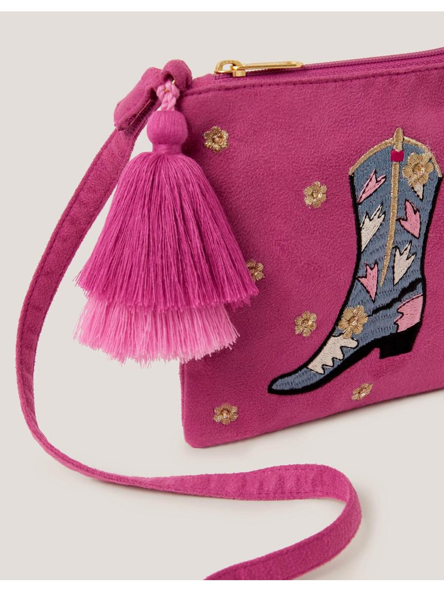Lets (line)dance! Designed in pink with a soft-to-the-touch finish, this mini bag is embroidered with gold flowers and a cute cowboy boot. Features a crossbody strap and tassel charm on the zip fastening.