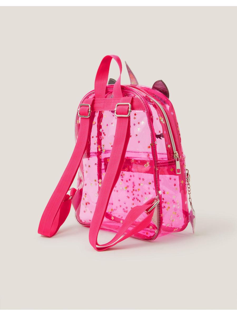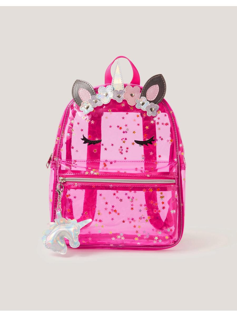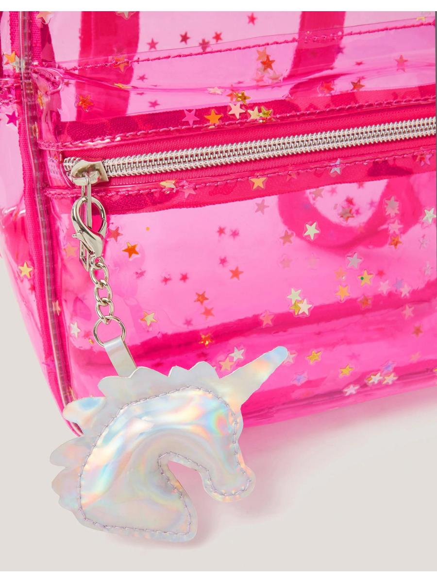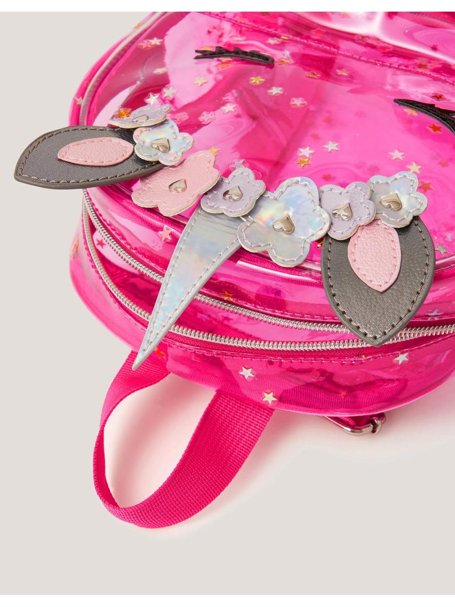 Sprinkled with stardust. Let's be clear, this backpack is going to be a favourite in the playground. Made from pink-tinted transparent fabric, it features a cute unicorn face on the front with a hologram charm on the front zip pocket.