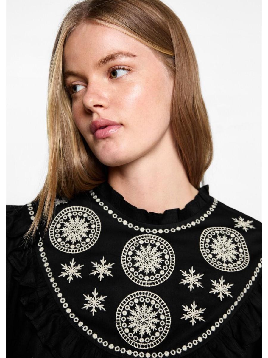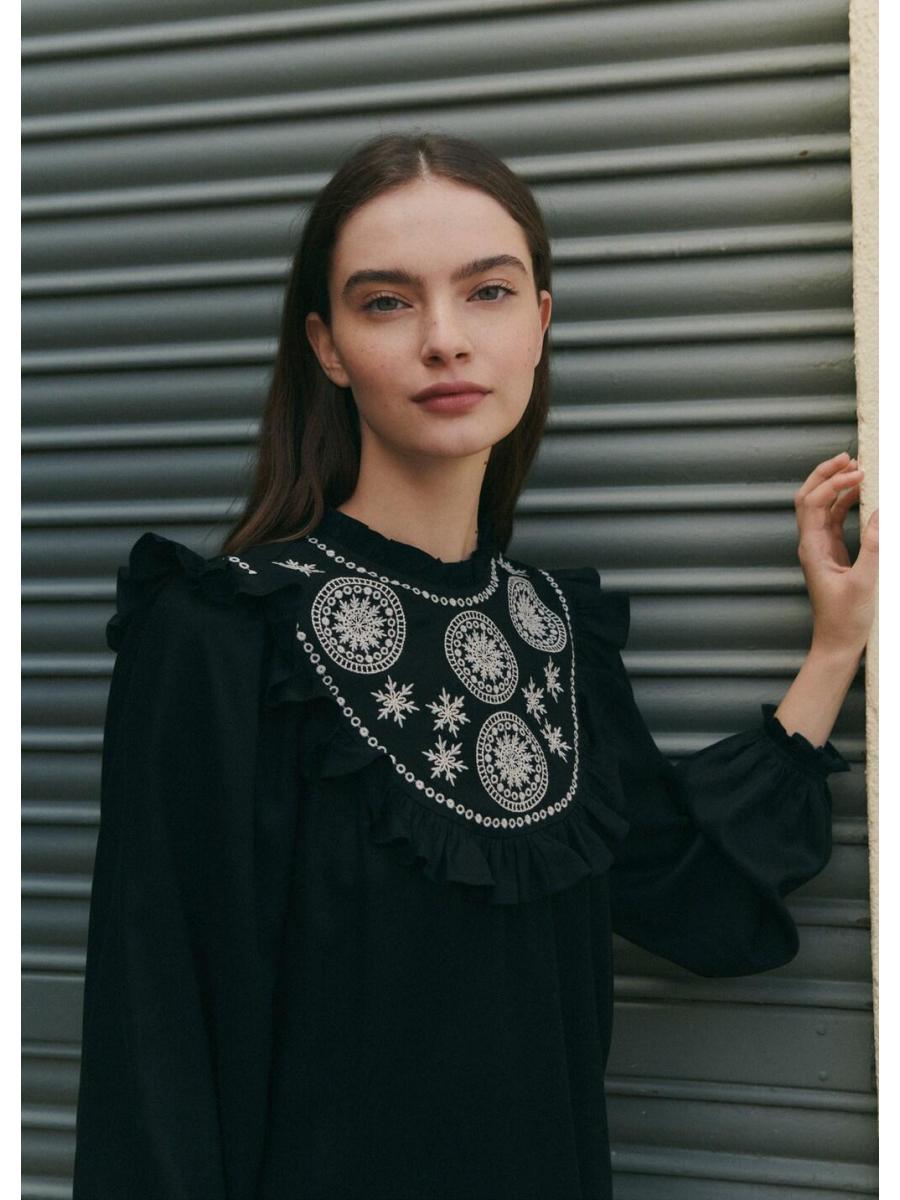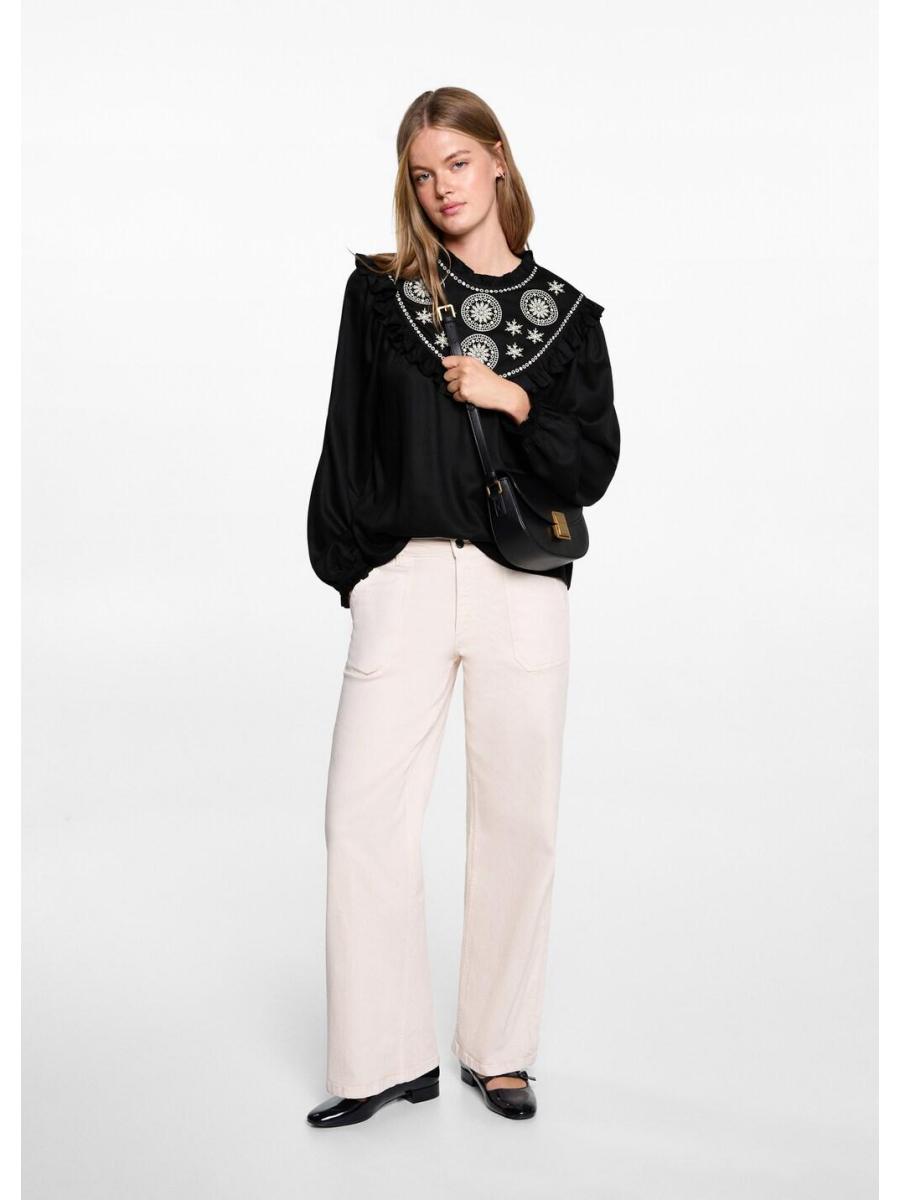 Tejido fluido. Diseño recto. Cuello redondo. Detalles bordados. Manga larga. Cierre de botón en la parte posterior. La modelo mide 172 cm y lleva una talla M