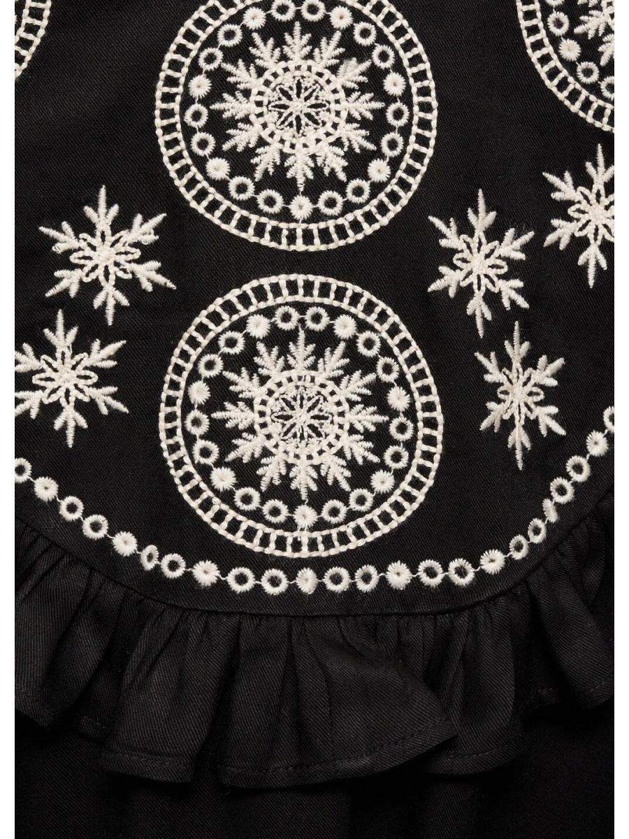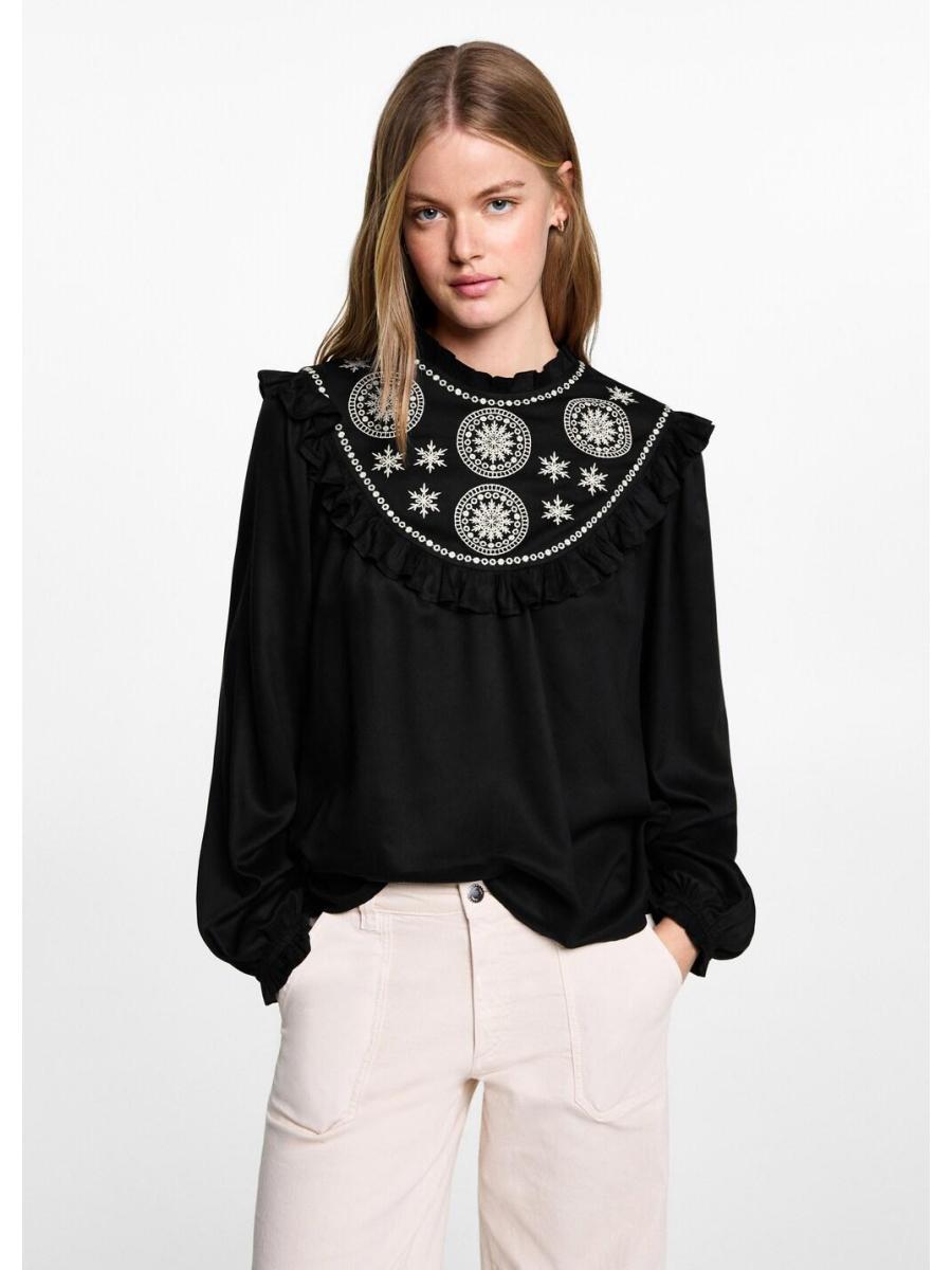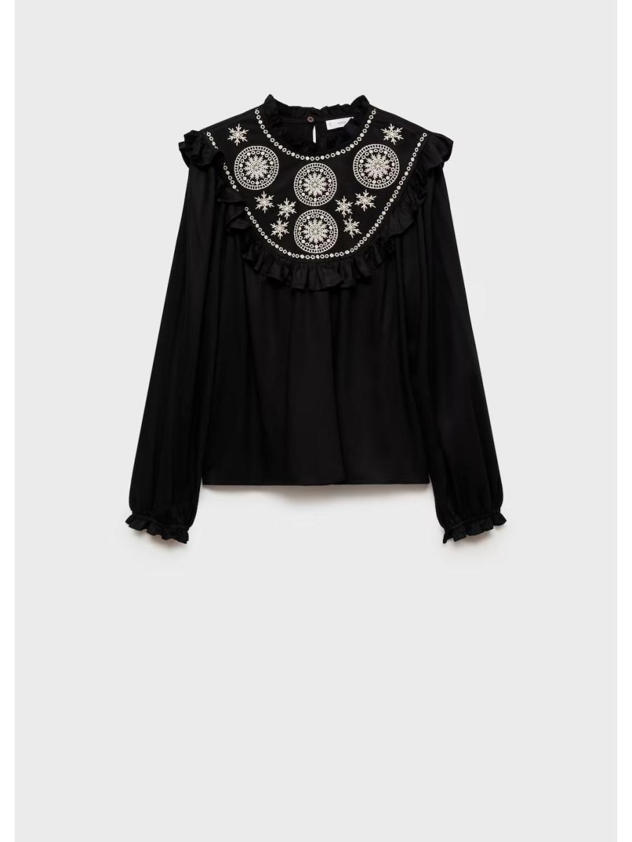 Tejido fluido. Diseño recto. Cuello redondo. Detalles bordados. Manga larga. Cierre de botón en la parte posterior. La modelo mide 172 cm y lleva una talla M
