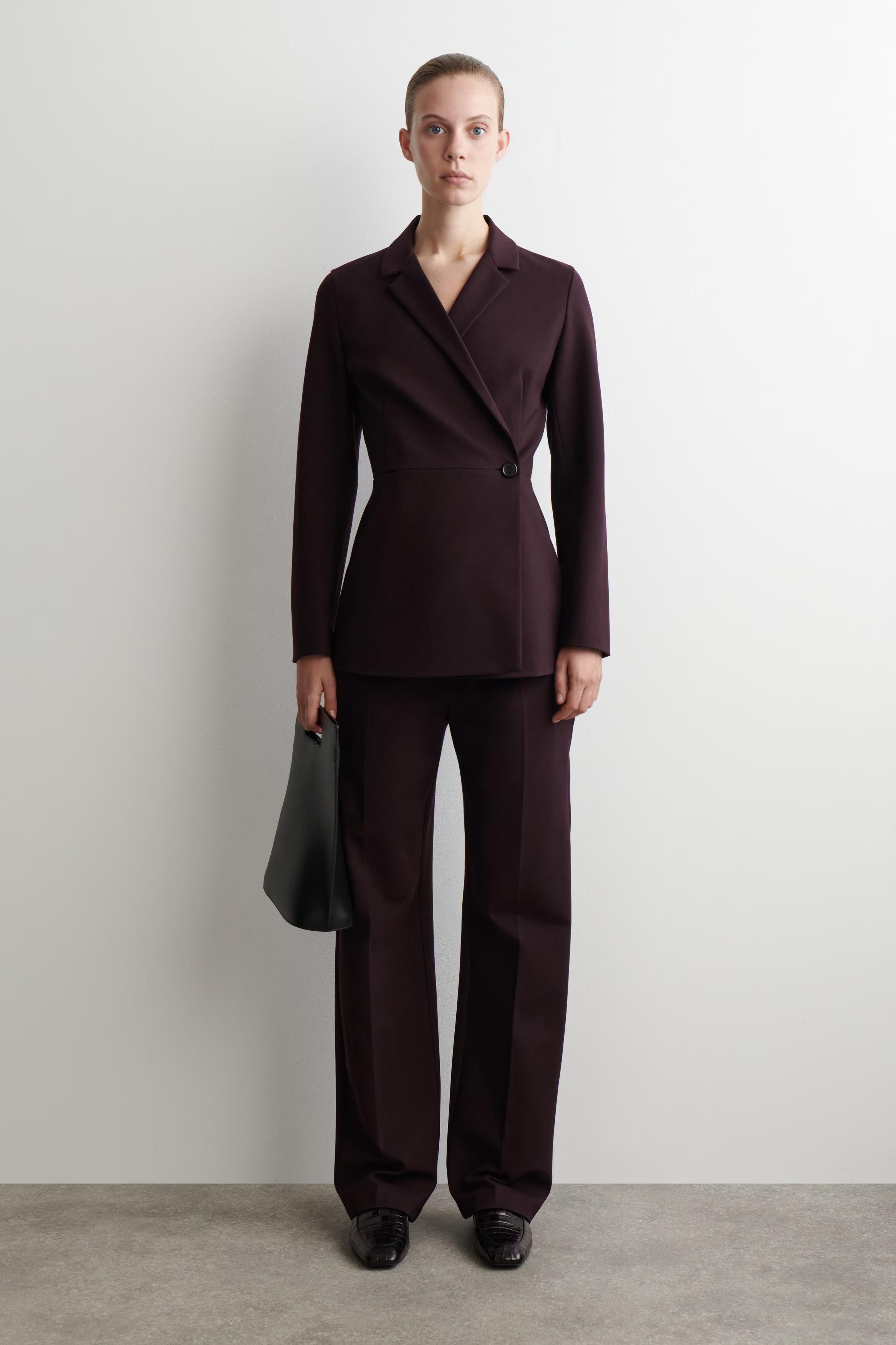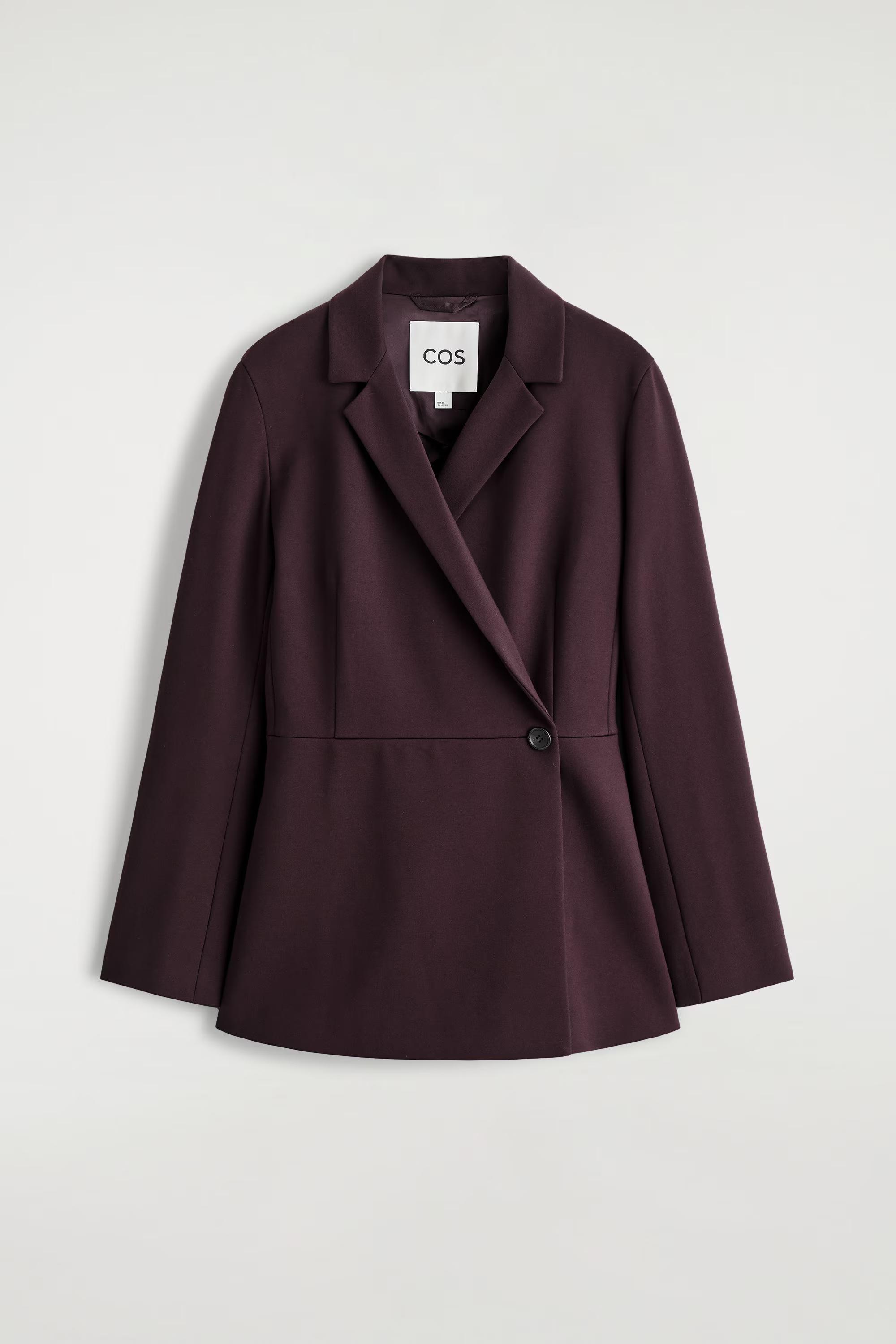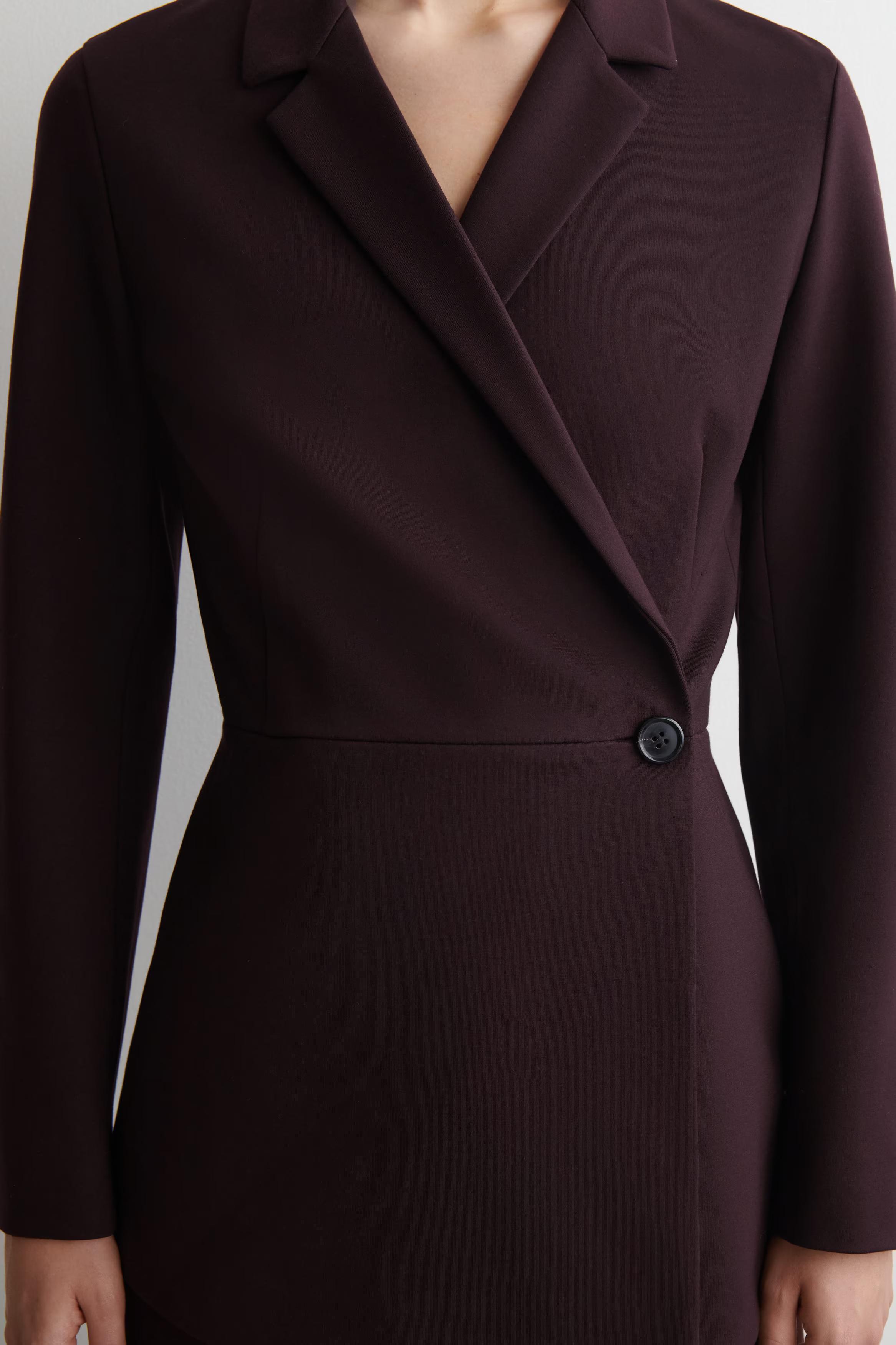 Sculptural silhouettes reframe the tailoring collection with a modern appeal. Rendered in a rich Bordeaux hue, this refined blazer is crafted from a fluid Milano rib fabric and shaped in a wrap-front silhouette with seams that define the waistline. Style it as a suit with the matching trousers.\u0026nbsp;Regular fitButton closureLENZING\u0026trade; ECOVERO\u0026trade; viscose is a branded viscose fibre, made from wood pulp\u0026nbsp;Shell: 67% ECOVERO\u0026trade; Viscose, 28% Recycled polyamide (Recycled nylon), 5% Elastane. Lining: 100% Viscose. Excluding trims / Machine wash\u0026nbsp;Back length of size EU 36 is 70.6cm / Model wears a size EU 36