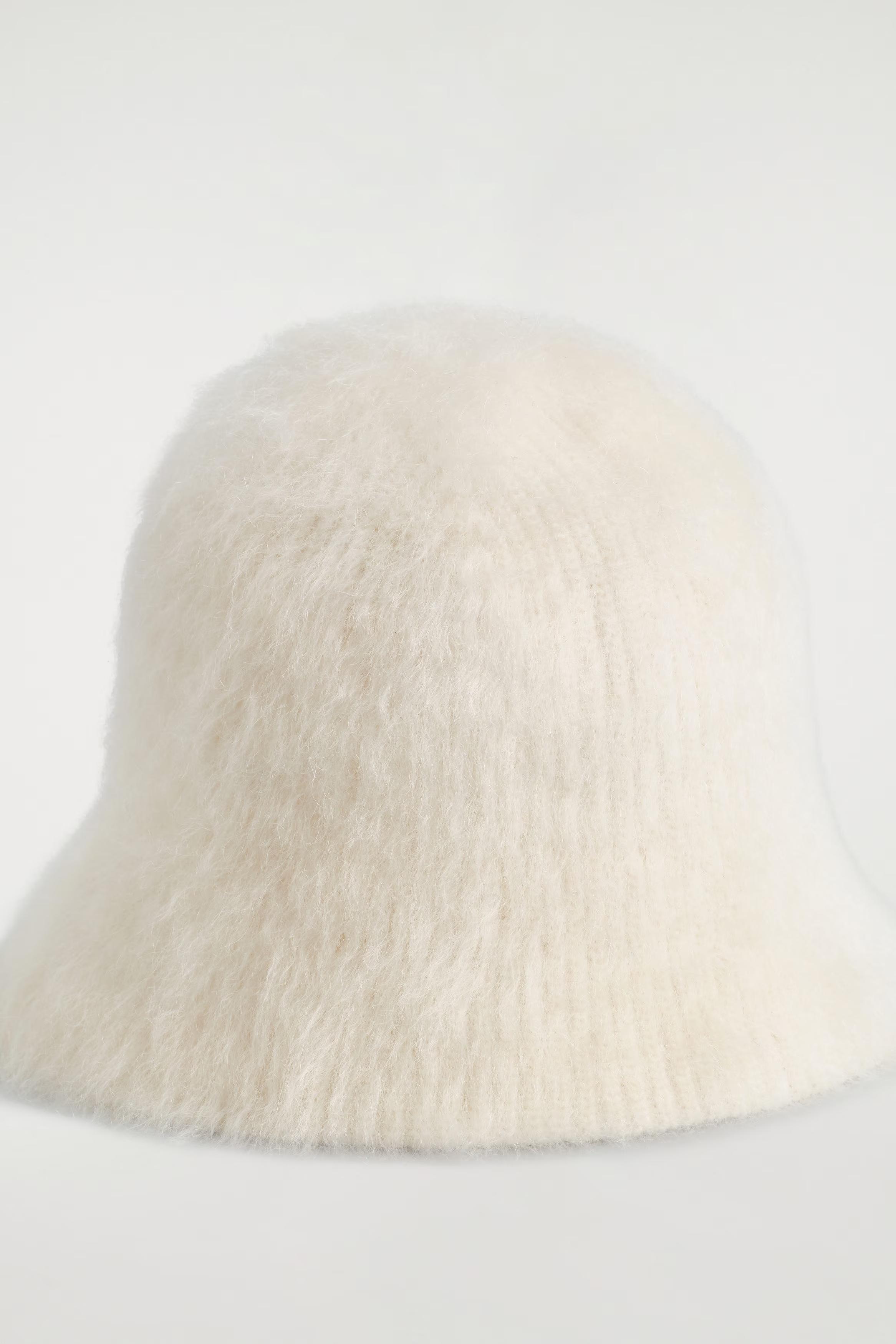 This bucket hat is an easy way to add texture to an outfit. Offered in an ice-blue tone, it's knitted from a tactile mohair blend in a ribbed cardigan stitch and has an extended brim.\u0026nbsp;\u0026nbsp;This product contains Responsible Mohair Standard TE-00047206 (RMS) mohair fibre from farms certified to animal welfare and land-management requirements\u0026nbsp;Shell: 71% RMS Mohair, 27% Recycled polyamide (Recycled nylon), 2% Recycled elastane. Excluding trims\u0026nbsp;Inner circumference: XS/S 56cm, M/L 58cm\u0026nbsp;
