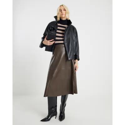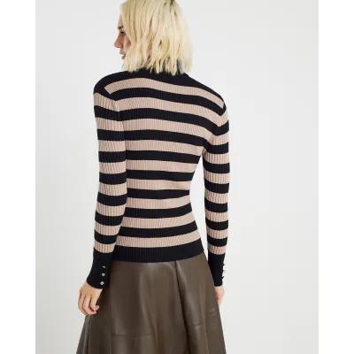 Brown Knitted Stripe Ribbed Roll Neck Top