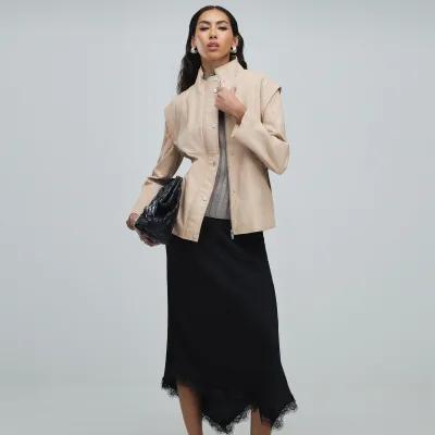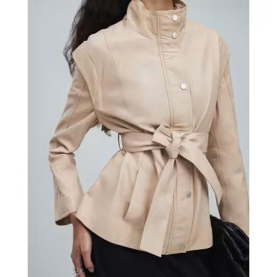 Pink Belted Funnel Neck Leather Jacket