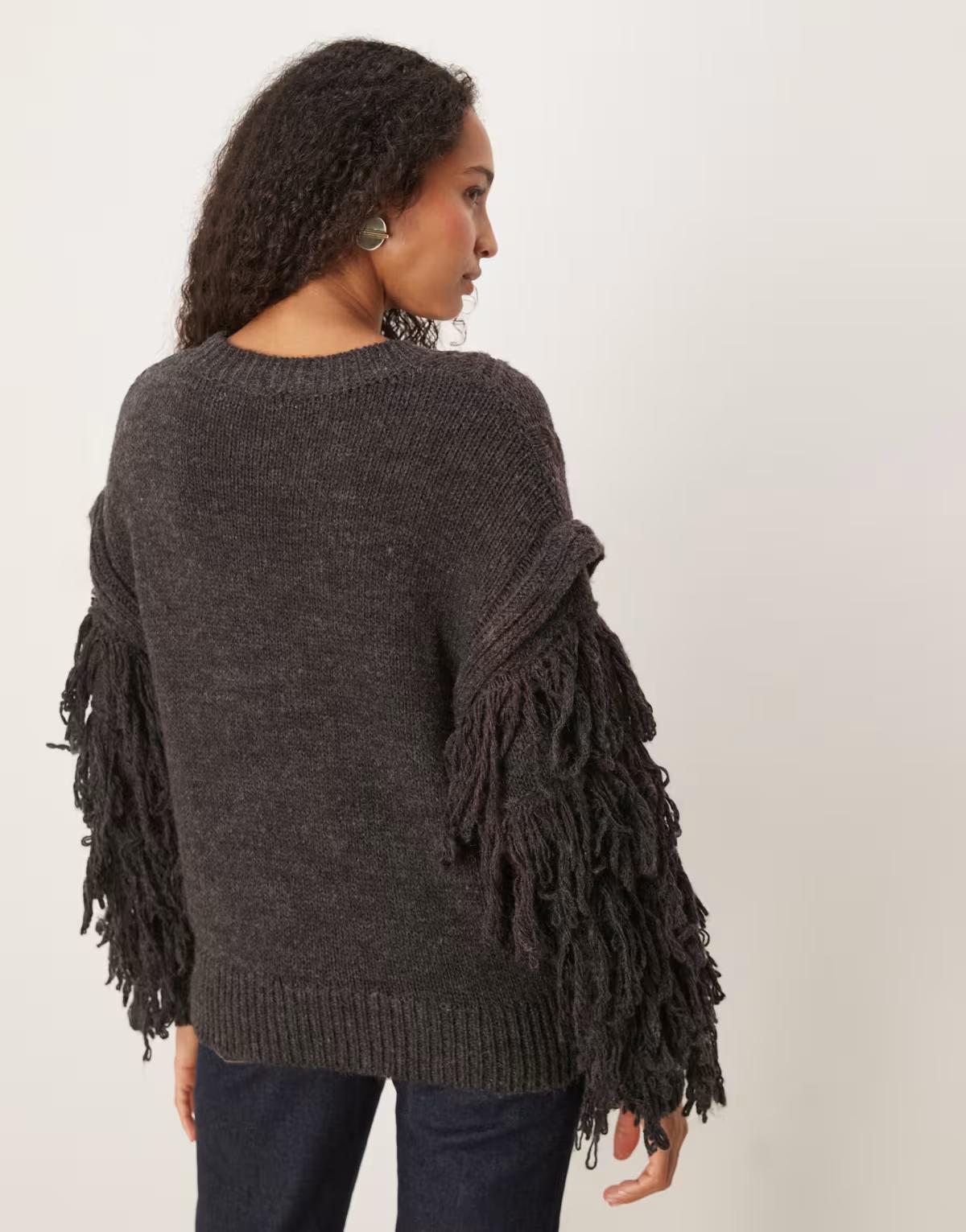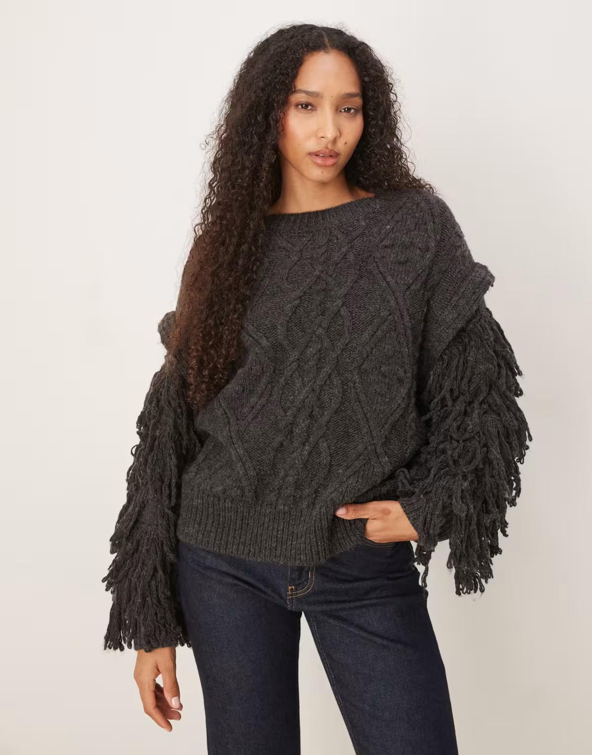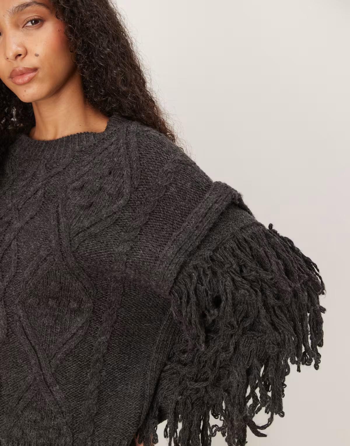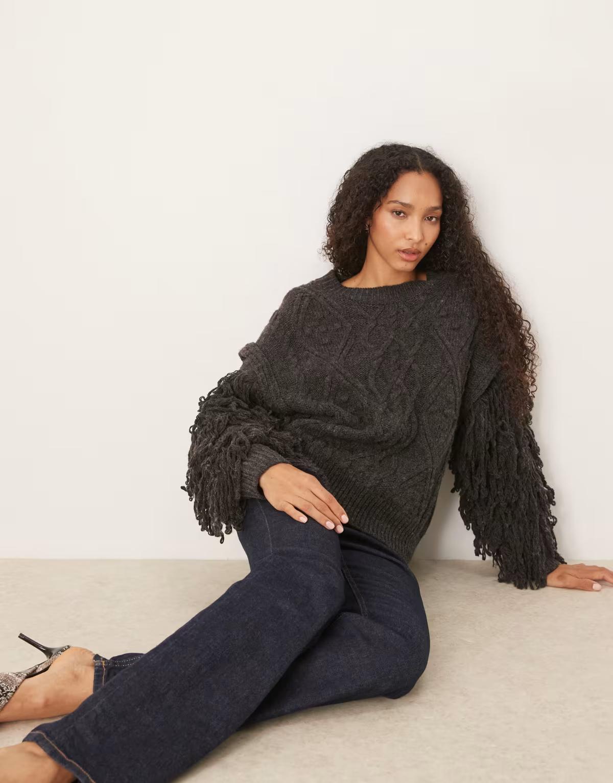 Glamorous Cable knit fringed sleeve jumper in charcoal