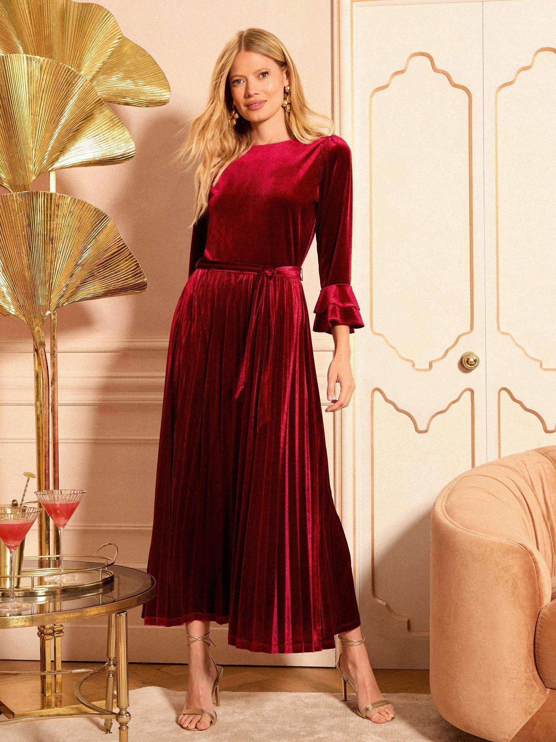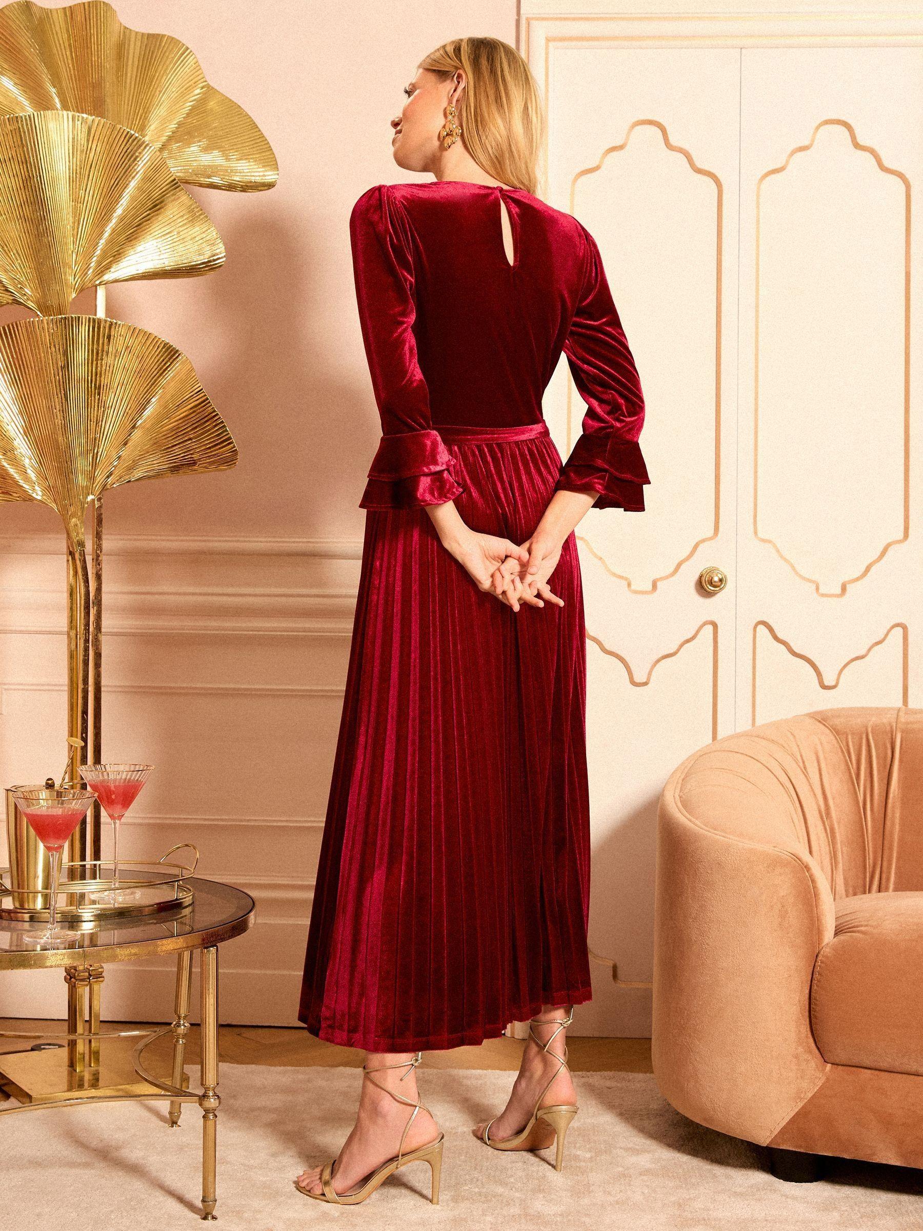 Love & Roses Red Velvet Flute Sleeve Midi Dress