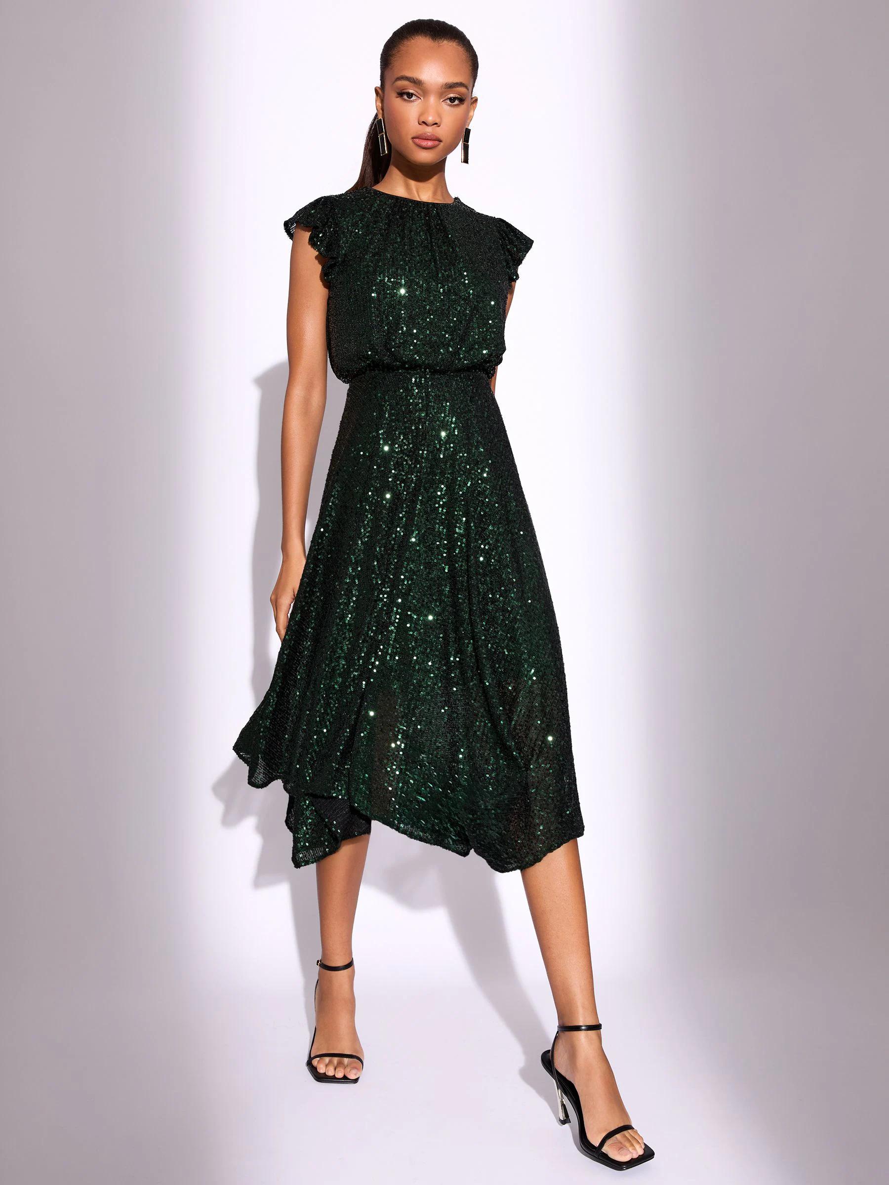 Lipsy Green Sequin High Low Fit And Flare Midi Dress