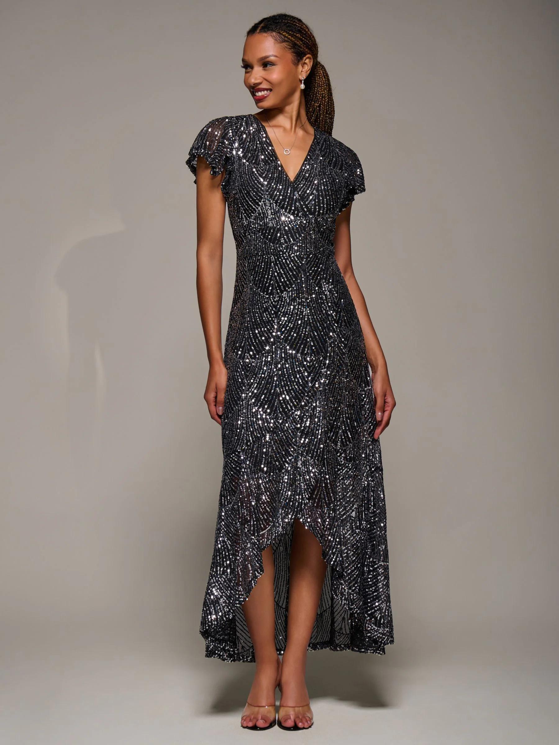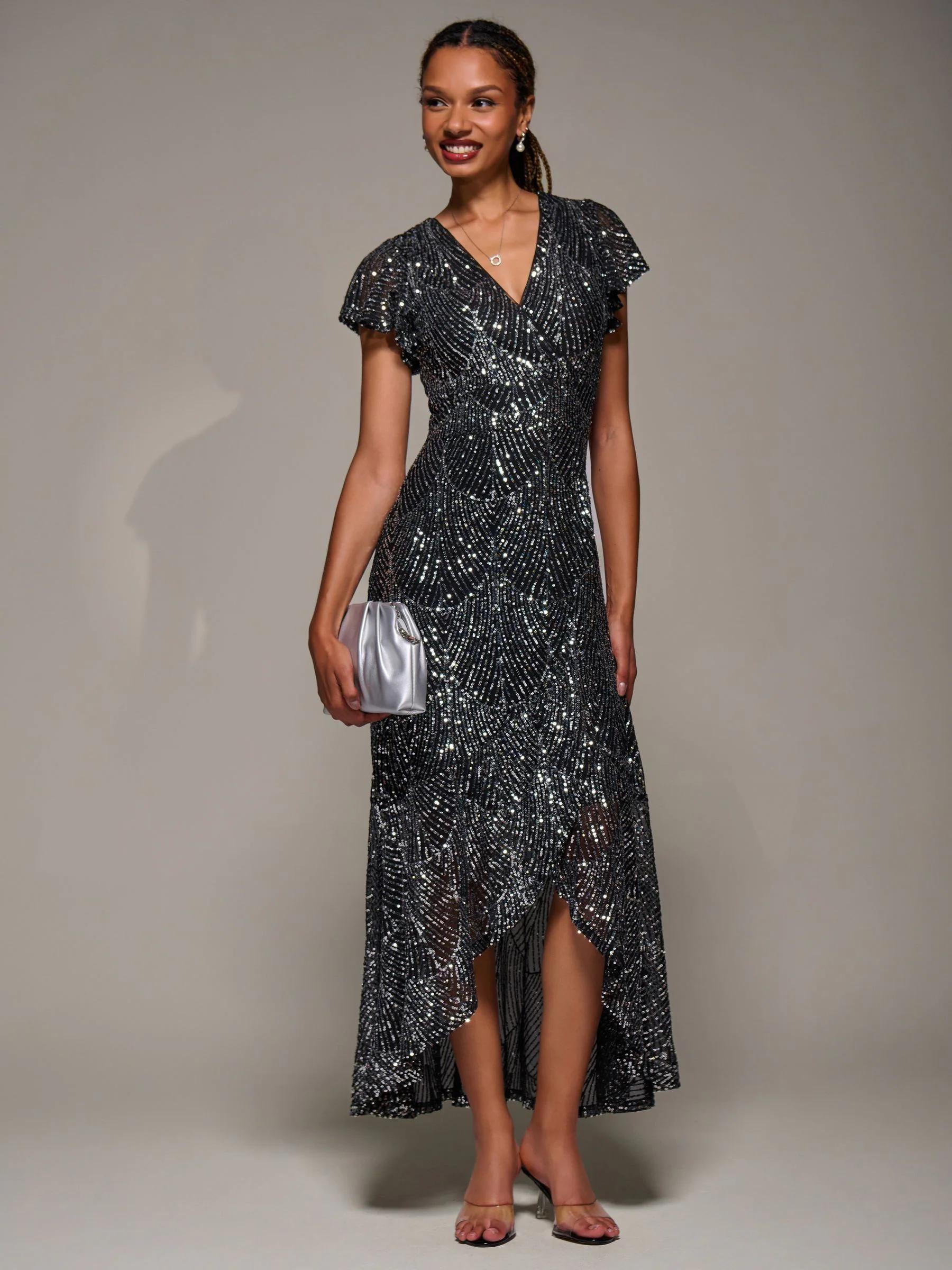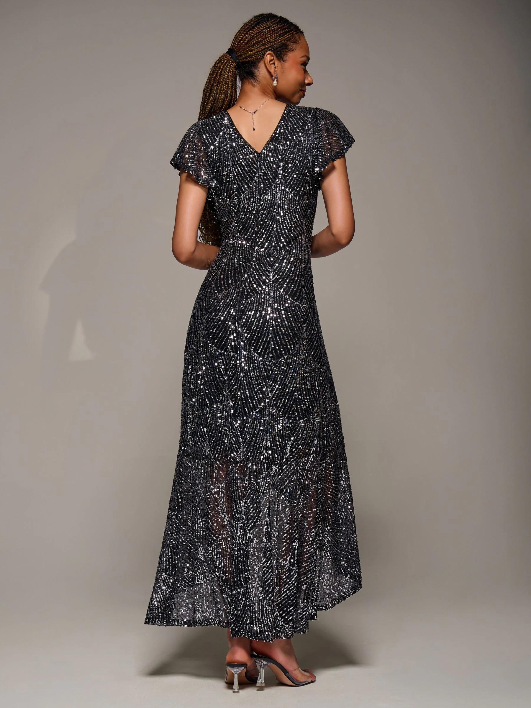 Jolie Moi Black Frill Short Sleeve Sequin Maxi Dress