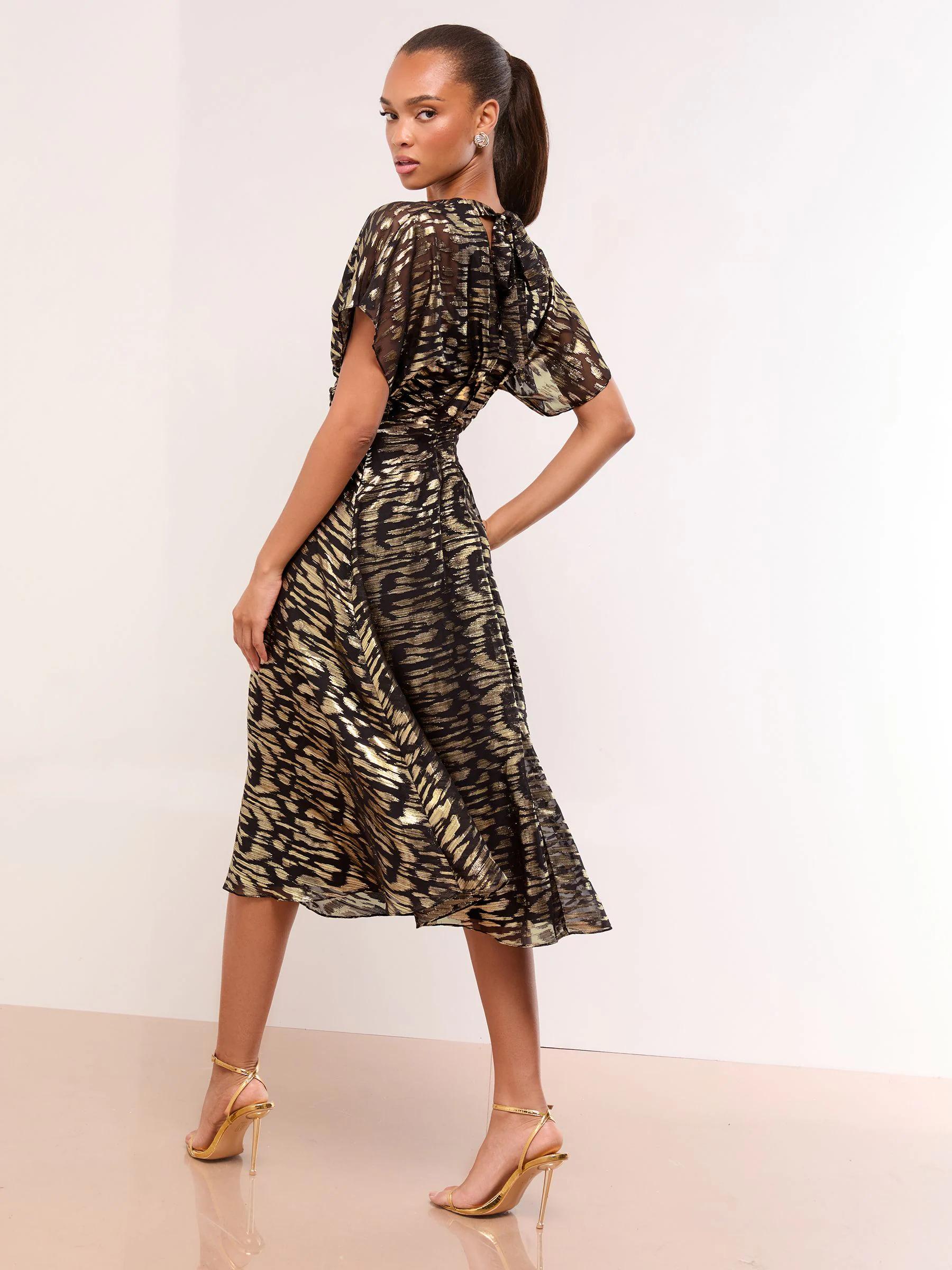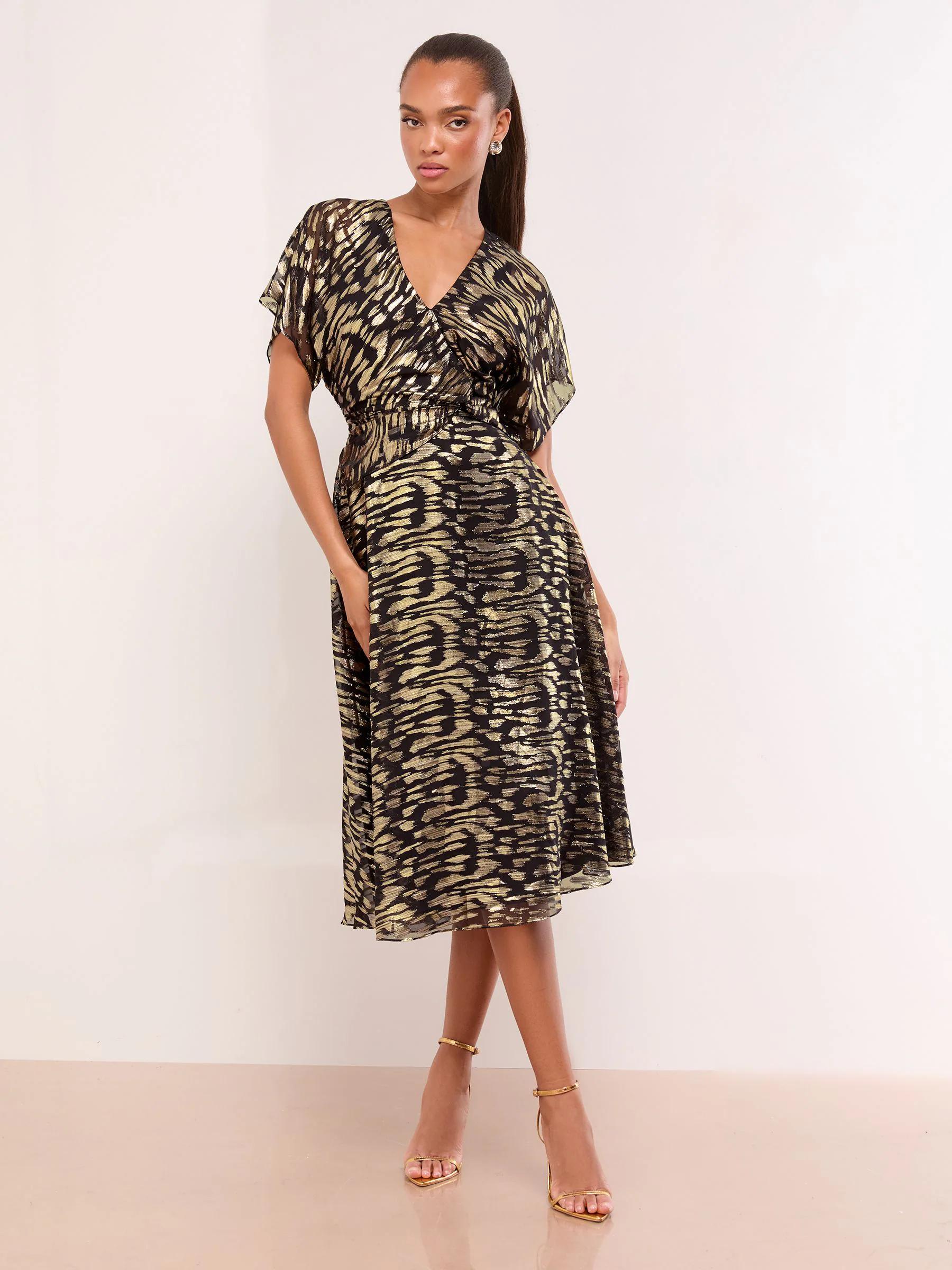 Lipsy Black Metallic Printed V-Neck Fit And Flare Midi Dress