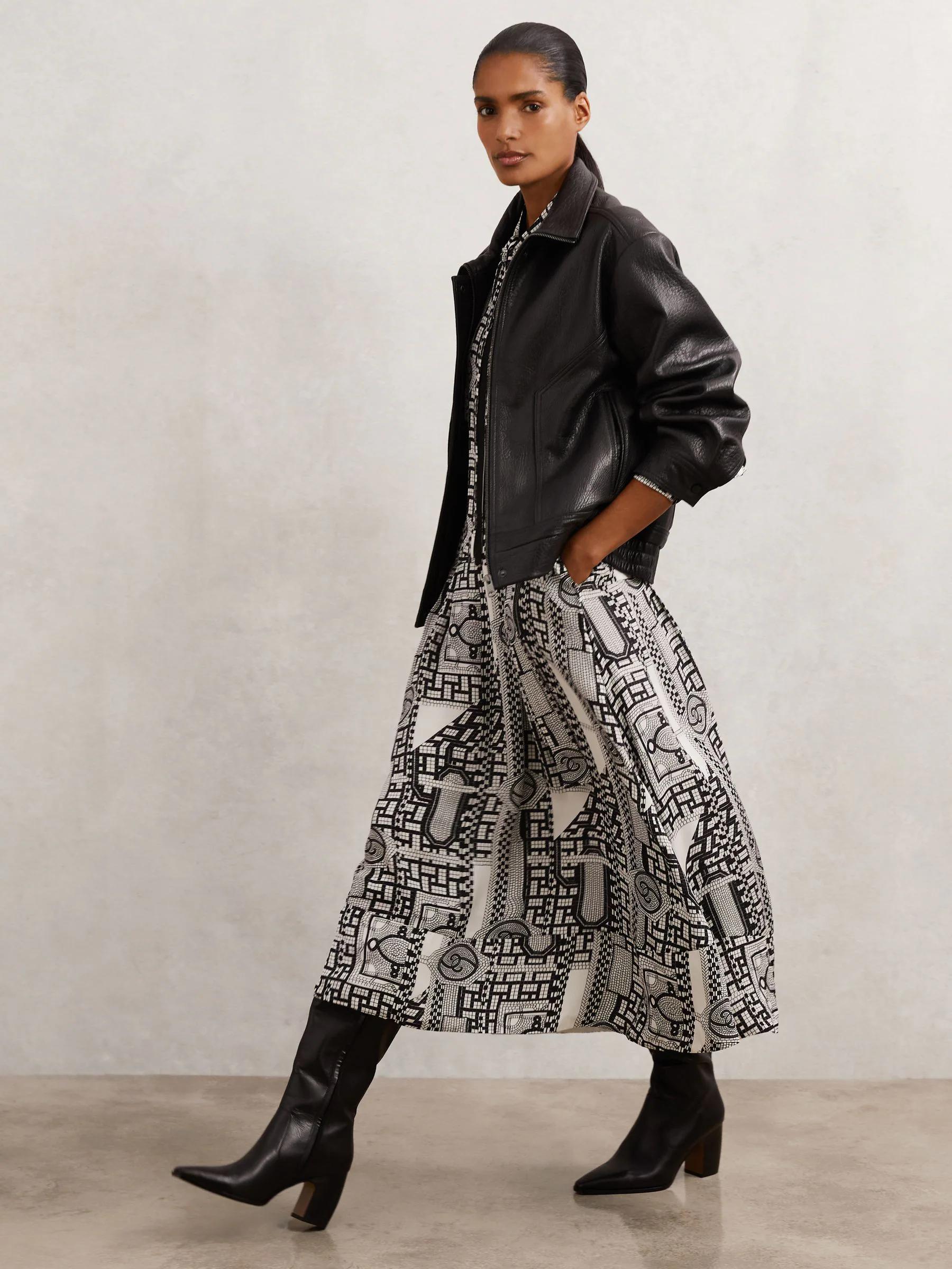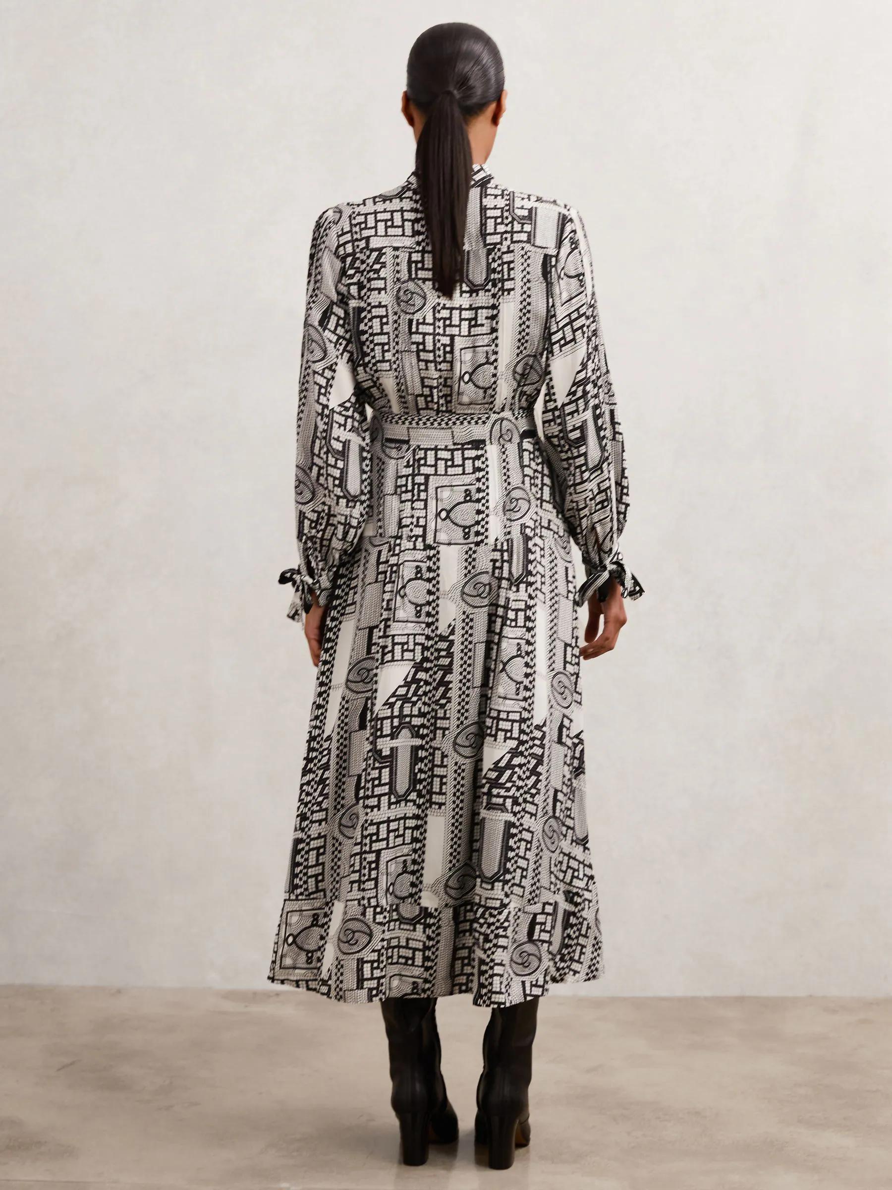 Reiss Black/Ivory Marie Geometric-Print Tie-Neck Dress