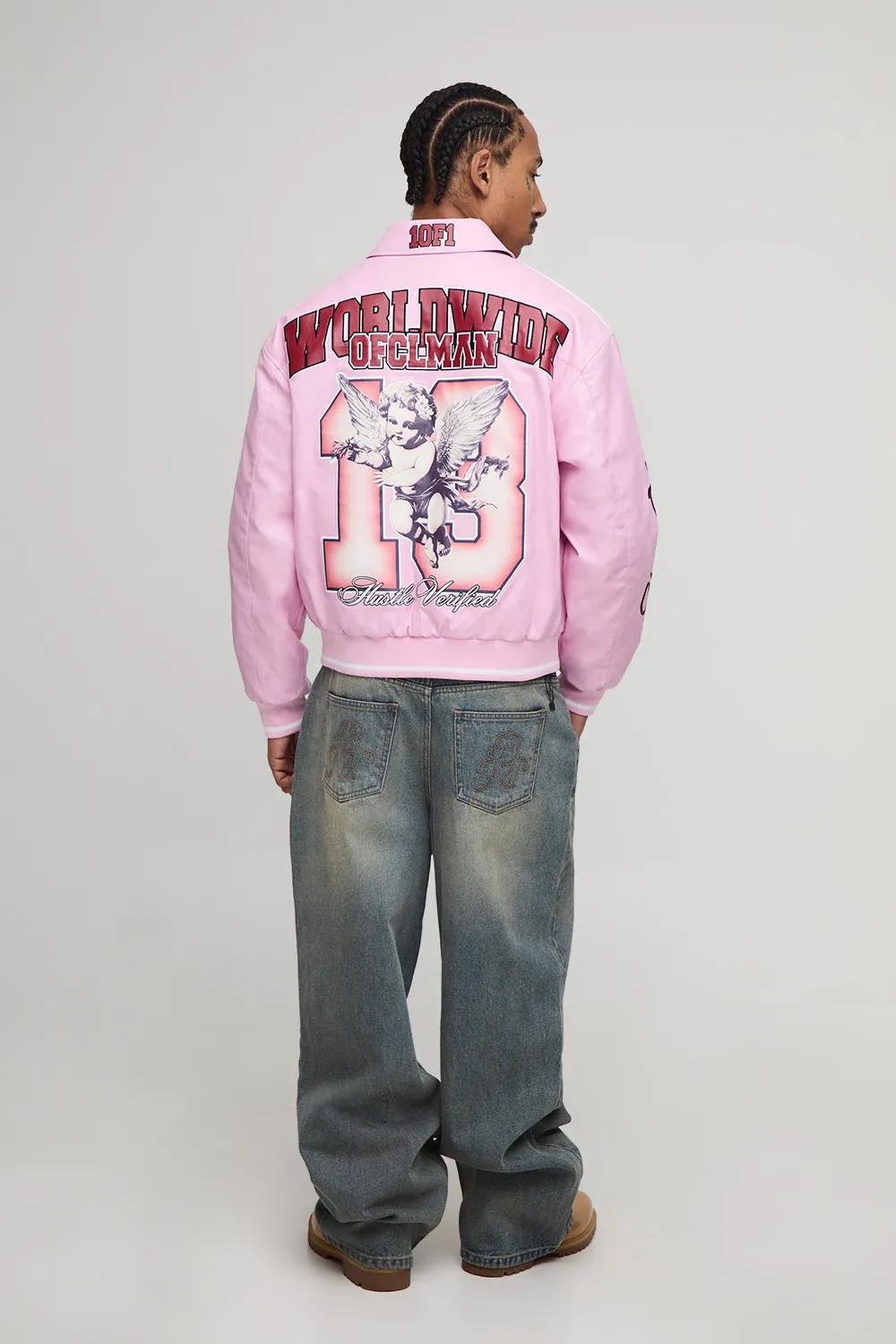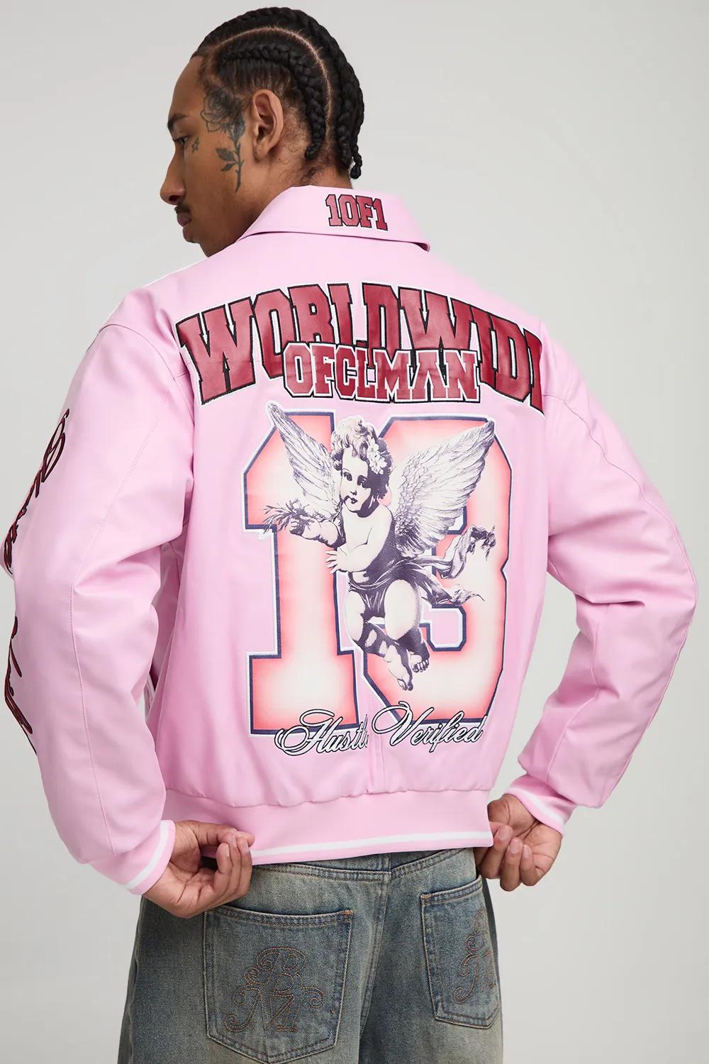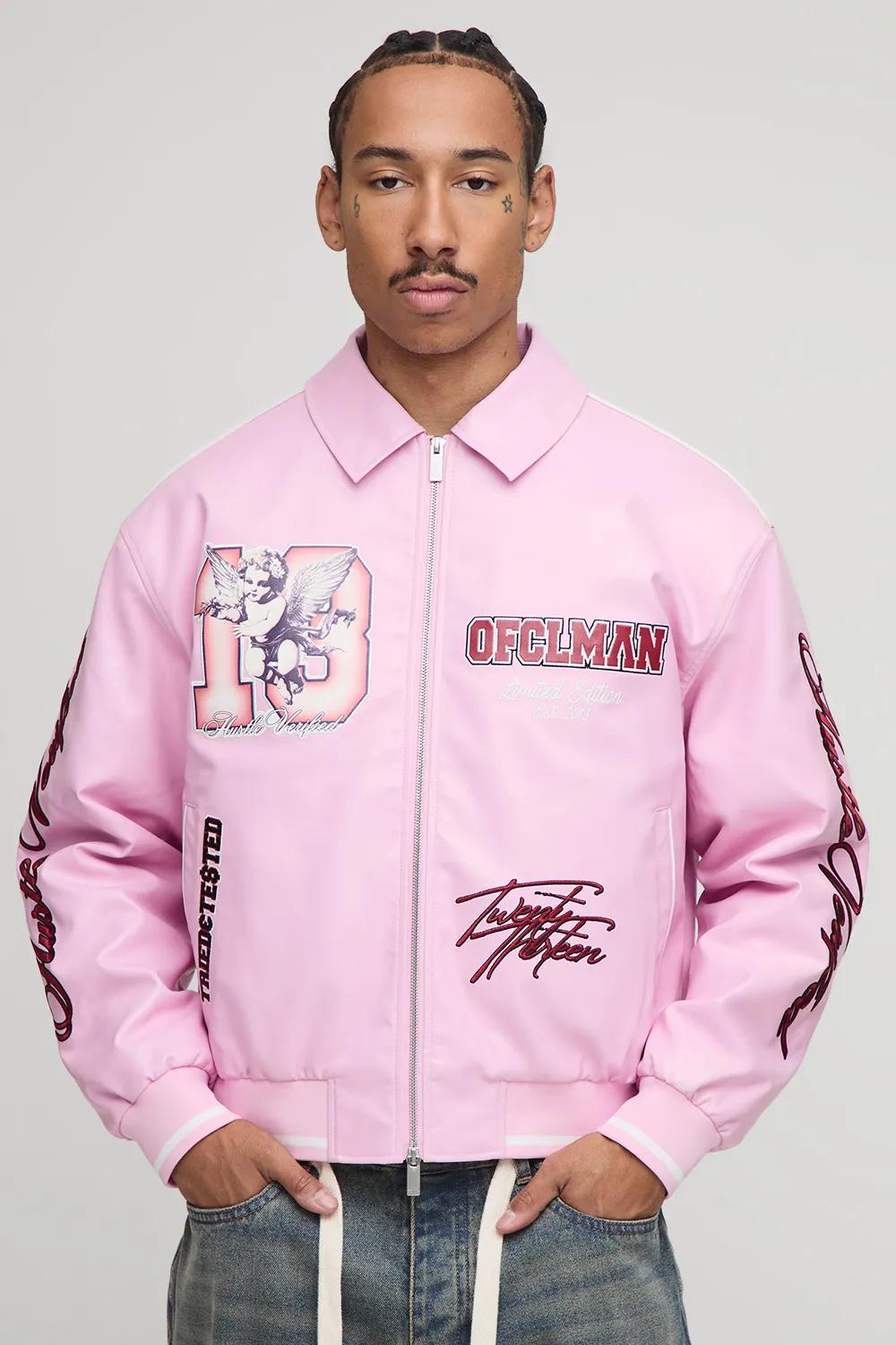 Discover Regular PU Cherub Applique Embroidered Varsity Jacket available to buy online at boohoo.com. Available with quick delivery and easy return options. Shop now!