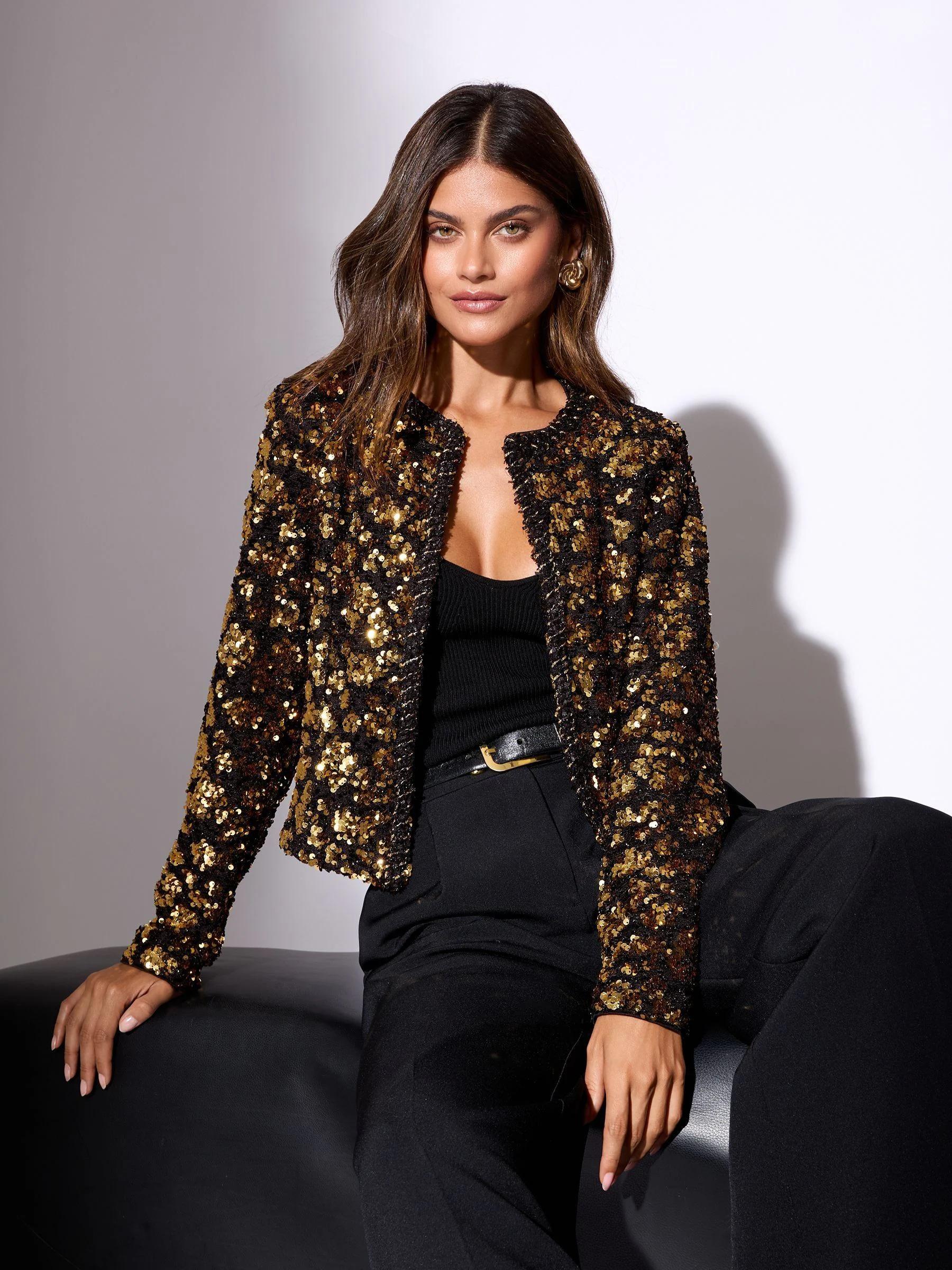 Lipsy Black Boucle Gold Sequin Crop Jacket