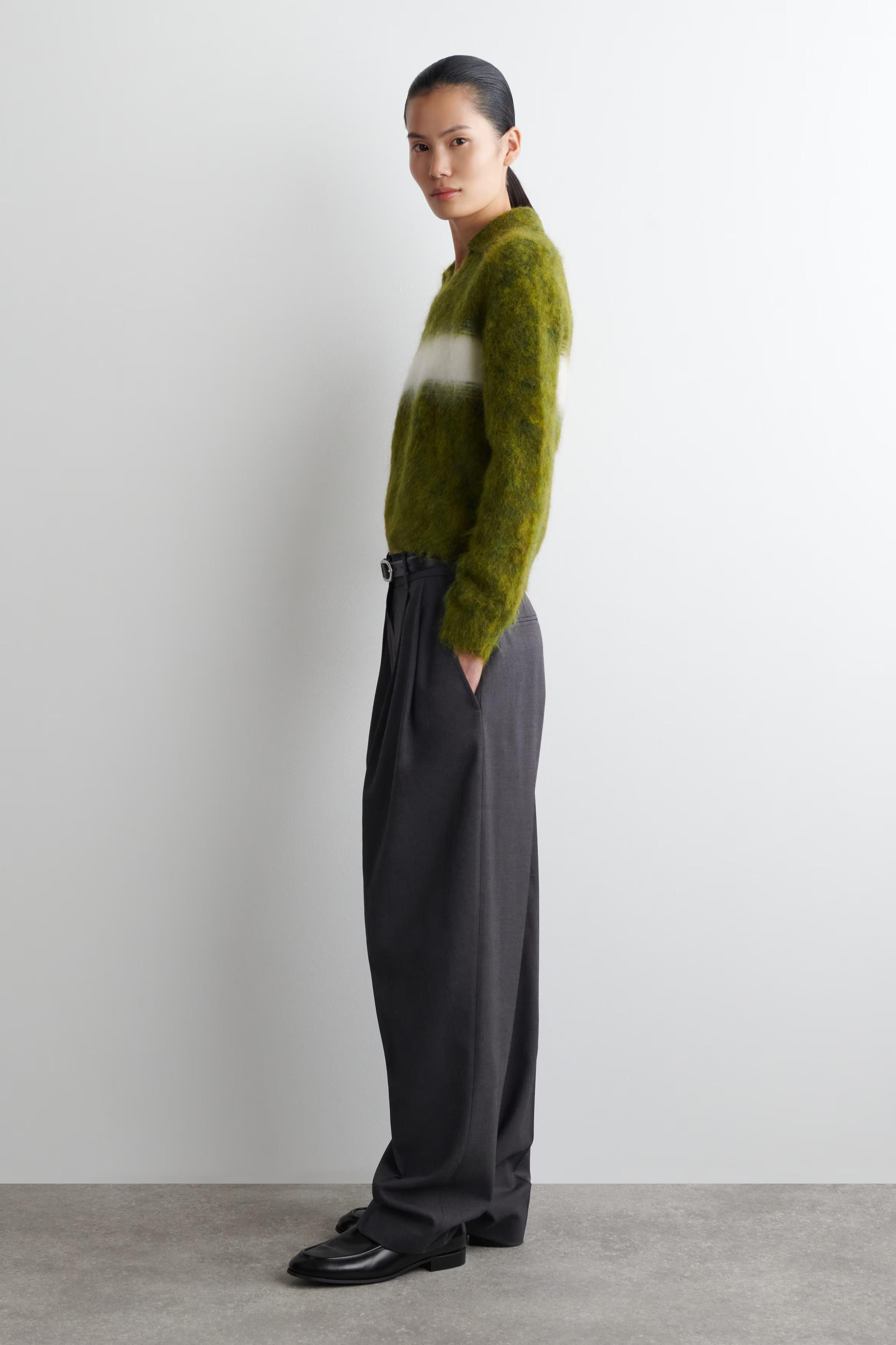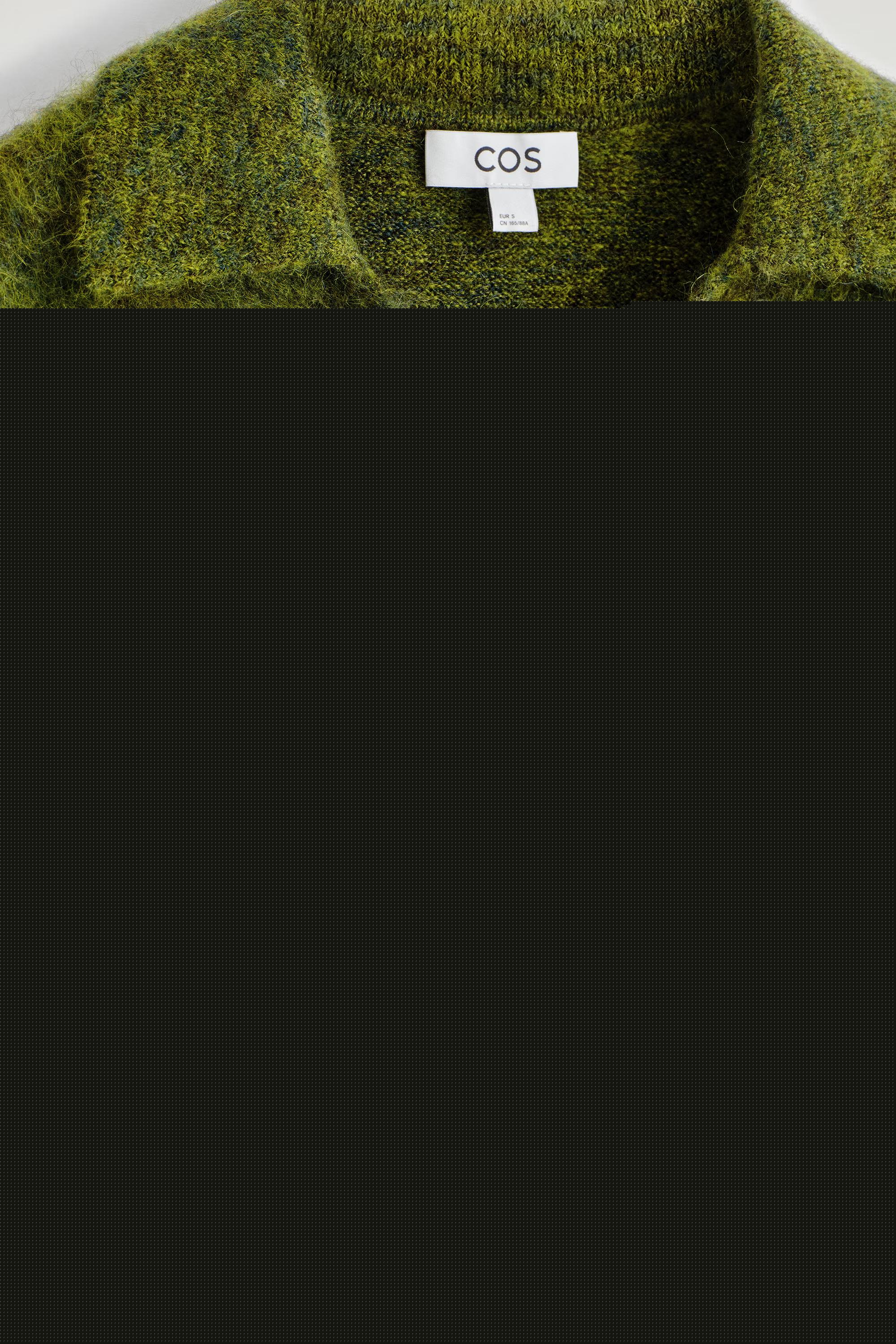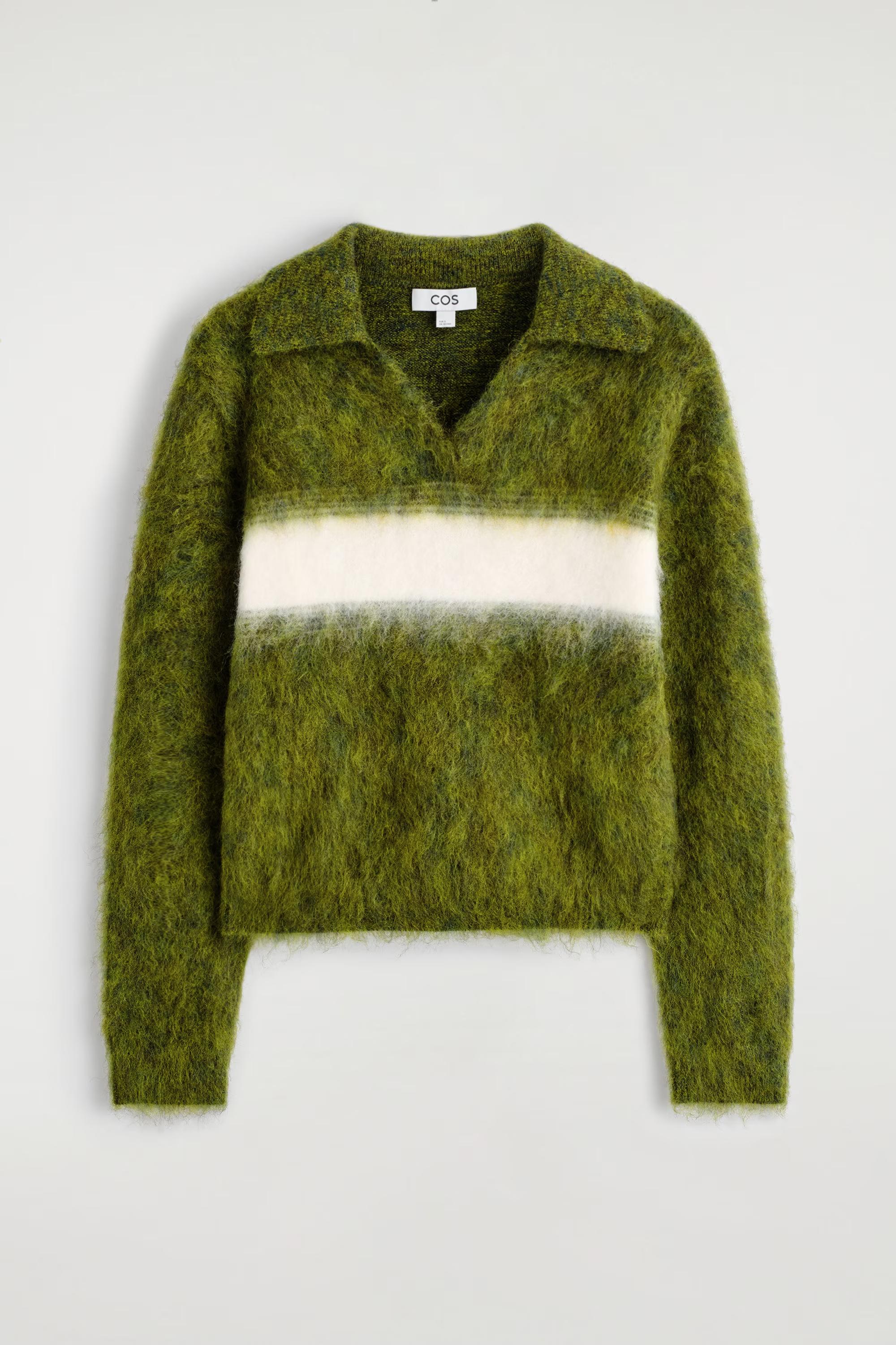Dynamic textures renew classic knitwear with a modern appeal for Autumn Winter 2025. Rendered in a rich olive hue, this polo jumper is knitted with tactile mohair and merino wool and features a contrasting stripe that nods to sportswear codes. It's finished with an effortless open collar.\u0026nbsp;Slim fitThis product contains Responsible Mohair Standard TE-00047206 (RMS) mohair fibre from farms certified to animal welfare and land-management requirements\u0026nbsp;\u0026nbsp;Shell: 35% RMS Mohair, 35% Merino wool, 28% Recycled polyester, 2% Elastane. Excluding trims / Dry clean\u0026nbsp;Back length of size S is 55cm / Model wears a size S